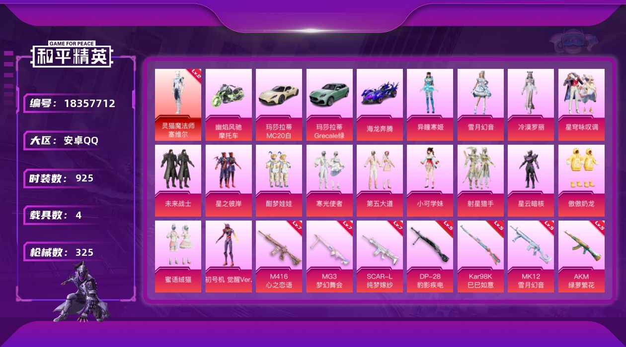 PX_2551055-4载具-246套装-325枪皮-1红装1稀有4载具15粉装10特效枪21热门246套装325枪皮,热力值,19印记,历史超级王牌18星,【1红装】,灵猫魔法师-塞维尔,(2级),【1稀有】,浪漫天命,【4载具】,玛莎拉蒂M白色,玛莎拉蒂G绿色,海龙奔腾,幽焰风驰摩托车,【15粉装】,觉醒初号机,蜜语绒猫,傲傲奶龙,雪月幻音,异瞳寒姬,星穹咏叹调,冷漠罗丽,小可学妹,射星猎手,星云暗核,酣梦娃娃,未来战士,第五大道,星之彼岸,寒光使者,【10特效枪】,SCAR-L-纯梦嫁纱,(7级),M416-心之恋语,(7级),AKM-绿萝繁花,(5级),UMP45-宇宙意志,(3级),Kar98K-圣域龙灵,(3级),Kar98K-巳巳如意,(5级),Vector-最终圣卫者,(3级),DP-28-豹影疾电,(5级),MK12-雪月幻音,(5级),MG3-梦幻舞会,(7级),【21热门】,8号机,Mark.06,龟仙人,雪山精英,东方飞龙,奶芙汪汪,暗夜行者,AG战队服,裁决冥王,暗影哥特,星河浪客,粉红小猪,忍者信条,水银刺客,漫步者,破蛋小黄鸡,极速红龙,英勇保护者,M762-奇异狩猎者,M24-奇异狩猎者,Mini14-林间仙鹿,【3飞行器】,深渊漩涡飞行器,黄族统领飞行器,梦幻舞会飞行器,【1头盔】,百万伏特头盔,【2背包】,百万伏特背包,甜蜜誓约背包,营地ID:
