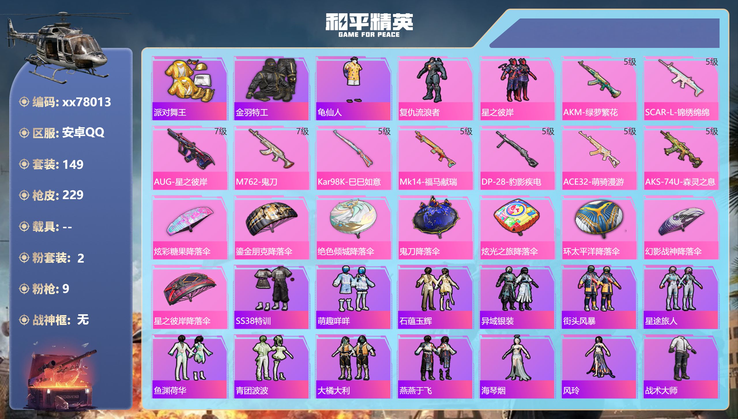 PX_2564968-,可二次,安卓手Q-9王牌印记-2粉装-9特效枪-69144热力值-149套装-229枪皮-1卓越印记,和平精英连体王者荣耀,安卓QQ/永恒钻石/199皮肤/128英雄/2典藏/0珍品无双/0无双/0珍品传说/7传说/67史诗/8稀有英雄【2,星传说皮肤】,幽冥之眼,宫本武藏,寅虎-焰心,鲁班七号,【2,典藏皮肤】,全息碎影,孙悟空,九霄神辉,花木兰,【7,传说皮肤】,神骥·逐星野,马超,地狱之眼,宫本武藏,寅虎·瑞焰,鲁班七号,黄金狮子座,达摩,冠军飞将,花木兰,愿照·九州拓,澜,鸣野蒿,桑启, 【2粉装】,角色-复仇流浪者,套装-星之彼岸, 【9特效枪】,M762-鬼刀/7级,AKS-74U-森灵之息/5级,AUG-星之彼岸/7级,Kar98K-巳巳如意/5级,Mk14-福马献瑞/5级,ACE32-萌骑漫游/5级,DP-28-豹影疾电/5级,SCAR-L-锦绣绵绵/5级,AKM-绿萝繁花/5级, 【3稀有紫装】,派对舞王,金羽特工,龟仙人, 【149稀有时装】,复仇流浪者,星之彼岸,SS38特训,龟仙人,金羽特工,派对舞王,萌趣咩咩,石蕴玉辉,异域银装,街头风暴,星途旅人,鱼渊荷华,青团波波,大橘大利,燕燕于飞,海琴烟,风玲,战术大师,智谋强哥,马上有钱,糖糖葫芦,巳巳如意,粉恋花,棉花软糖,月烬之祷,午间小调,敖闰,雪绒豹,朱霞炽焰,凌霄紫焰,擎苍青焰,萌鸡速递,元气之梦,风迹短诗,漫游都市,薄荷星砂,秘语星愿,云朵鹅,顶瓜瓜,蓝冰羽,恋语绒绒,紫幽梦,SS35特训,SS29特训,SS31特训,SS33特训,SS32特训,无暇誓言,SS36特训,贝斯之夜,焰鹰斗篷,英勇保护者,醒狮腾龙,都市漫游者,夏日音浪,龙的传人,军刀雅典娜,甜梦熊熊,青玉碎影,萌黄之夏,SS37特训,SS28特训,猎鹰,黄色运动,黄色伏地魔,阳光火鸡,黄色名流,酷潮明星,绯格组合,涂山之恋,SS26特训,空岛之星,SS34特训,竞技名士,SS30特训,长空猛禽,旭日情侣,惊鸿侠骨,春光漫游,猎梦纪元,甜心亚梦,虚音幻奏,幻世战舞者,青涩时光,暖心熊熊,牛气满满,娇憨猪猪,春日漫步,龙腾端午,幻影公爵,极速红龙,狙击之神,红釉青花,麻辣教官,雨过天青,福马献瑞,玲珑侠影,完美偶像,幽夜迷踪,幻影武者,破蛋小黄鸡,快闪甜心,暗金炫舞,坚韧舞者,野性战心,海岛探路者,破晓战魂,幻世保卫者,霓虹街区,田园牧歌,轻风白浪,烈火街头,探宝勇士,SS27特训,牛气冲天,飞行日记,SS17特训,竞技角斗士,瑞龙福将,团圆交子,金戈铁马,SS19特训,光之冒险,SS20特训,SS21特训,绝对偶像,玉兔迎春,SS22特训,SS23特训,甜蜜熊情侣,缤纷果语,滨海厨神,香榭午后,神气柴柴,妙红点点,幻彩翩翩,幻羽潜行,海盐绵绵冰,王牌教练,荣耀,柠萌假日,粉红小猪,SS24特训,鹤鸣,懵萌河马,SS25特训,快乐星愿,锦衣飞扬,星梦畅游, 【228稀有枪械】,AKM-绿萝繁花/5级,SCAR-L-锦绣绵绵/5级,AUG-星之彼岸/7级,M762-鬼刀/7级,Kar98K-巳巳如意/5级,Mk14-福马献瑞/5级,DP-28-豹影疾电/5级,ACE32-萌骑漫游/5级,AKS-74U-森灵之息/5级,DBS-乌木金纹,SCAR-L-海盐豹豹,MK20-H-乌木金纹,DBS-风迹短诗,莫辛纳甘-风迹短诗,Mini14-鸡智如我,Win94-乌木金纹,MK12-风迹短诗,MK12-乌木金纹,PKM-紫幽梦,Mk14-紫幽梦,蜜獾-乌木金纹,M762-云朵鹅,S1897-紫幽梦,SVD-云朵鹅,P92-紫幽梦,M417-玩趣呆呆,UZI-炫彩糖果,Mk47-风迹短诗,JS9-凌霄紫焰,MG-36-凌霄紫焰,平底锅-紫幽梦,破片手榴弹-海盐豹豹,UMP45-海盐豹豹,ARX-凌霄紫焰,AKS-74U-乌木金纹,AKM-涂鸦街区,蜜獾-风迹短诗,P92-凌霄紫焰,Famas-乌木金纹,Famas-霓彩脉冲,SPAS-12-云朵鹅,破片手榴弹-拽到爆炸,S1897-糯团青竹,平底锅-凌霄紫焰,Mk14-薄荷星砂,AKS-74U-鸡智如我,沙漠之鹰-云朵鹅,烟雾弹-冰氧夏日,MG-36-薄荷星砂,大砍刀-云朵鹅,PKM-啾咪啾咪,SLR-霓彩脉冲,SCAR-L-彩虹符号,AUG-紫晶流影,S12K-霓彩脉冲,AMR-鸡智如我,AKM-霓彩脉冲,M416-红色方程式,M416-蓝色火焰,M416-糯团青竹,M416-绯红前夜,AKM-环太平洋,AKM-星之彼岸,AKM-彩虹符号,AKM-海渊国主,AKM-龙的传人,AKM-虎虎生威,AKM-霓虹街区,SCAR-L-玉兔迎春,SCAR-L-龙宫之主,SCAR-L-夜灯,SCAR-L-炫彩节奏,M16A4-红色方程式,M16A4-幻世战舞者,M16A4-甜心亚梦,GROZA-田园牧歌,GROZA-懵萌河马,GROZA-彩虹符号,AUG-幻影战神,AUG-耀粉歌者,AUG-天降萌叽,QBZ-银碳小老虎,QBZ-彩虹符号,M762-瑞龙福将,M762-彩虹符号,M762-绯红前夜,M762-牛气冲天,M762-天降萌叽,Mk47-乌木金纹,Mk47-妙红点点,G36C-乌木金纹,G36C-懵萌河马,AC-VAL-天降萌叽,AC-VAL-快闪甜心,AC-VAL-甜心亚梦,AC-VAL-乌木金纹,蜜獾-天降萌叽,蜜獾-娇憨猪猪,Kar98K-幻影战神,Kar98K-炫彩节奏,M24-乌木金纹,M24-炫彩节奏,AWM-天降萌叽,AWM-圣堂之誓,AWM-焰鹰斗篷,Win94-瑞龙福将,莫辛纳甘-乌木金纹,莫辛纳甘-懵萌河马,AMR-乌木金纹,AMR-妙红点点,M200-惊鸿侠骨,SKS-糯团青竹,SKS-炫彩节奏,VSS-星之彼岸,VSS-田园牧歌,VSS-彩虹符号,Mini14-龙宫之主,Mk14-乌木金纹,SLR-彩虹符号,SLR-娇憨猪猪,M417-惊鸿侠骨,MK20-H-快闪甜心,UZI-幻影战神,UZI-娇憨猪猪,UZI-天降萌叽,UZI-啾咪啾咪,UMP45-涂山之恋,UMP45-夜灯,UMP45-海渊国主,Vector-田园牧歌,Vector-焰鹰斗篷,汤姆逊-天降萌叽,汤姆逊-幻影战神,汤姆逊-炫彩节奏,汤姆逊-环太平洋,野牛-乌木金纹,MP5K-蓝莓炮弹,MP5K-乌木金纹,P90-乌木金纹,P90-快闪甜心,P90-玩趣呆呆,S686-生命誓言,S1897-炫彩节奏,S12K-玩趣呆呆,S12K-幻世战舞者,S12K-幻影战神,S12K-瑞龙福将,S12K-娇憨猪猪,S12K-龙宫之主,S12K-夜灯,DBS-焰鹰斗篷,DBS-黑白懵懵牛,DBS-甜心亚梦,DBS-彩虹甜喵,DBS-彩虹符号,DBS-圣堂之誓,SPAS-12-田园牧歌,M249-彩虹符号,M249-星之彼岸,M249-月影鸳鸯,M249-妙红点点,DP-28-焰鹰斗篷,DP-28-彩虹符号,DP-28-甜心亚梦,MG3-惊鸿侠骨,MG3-幻世战舞者,MG3-妙红点点,MG3