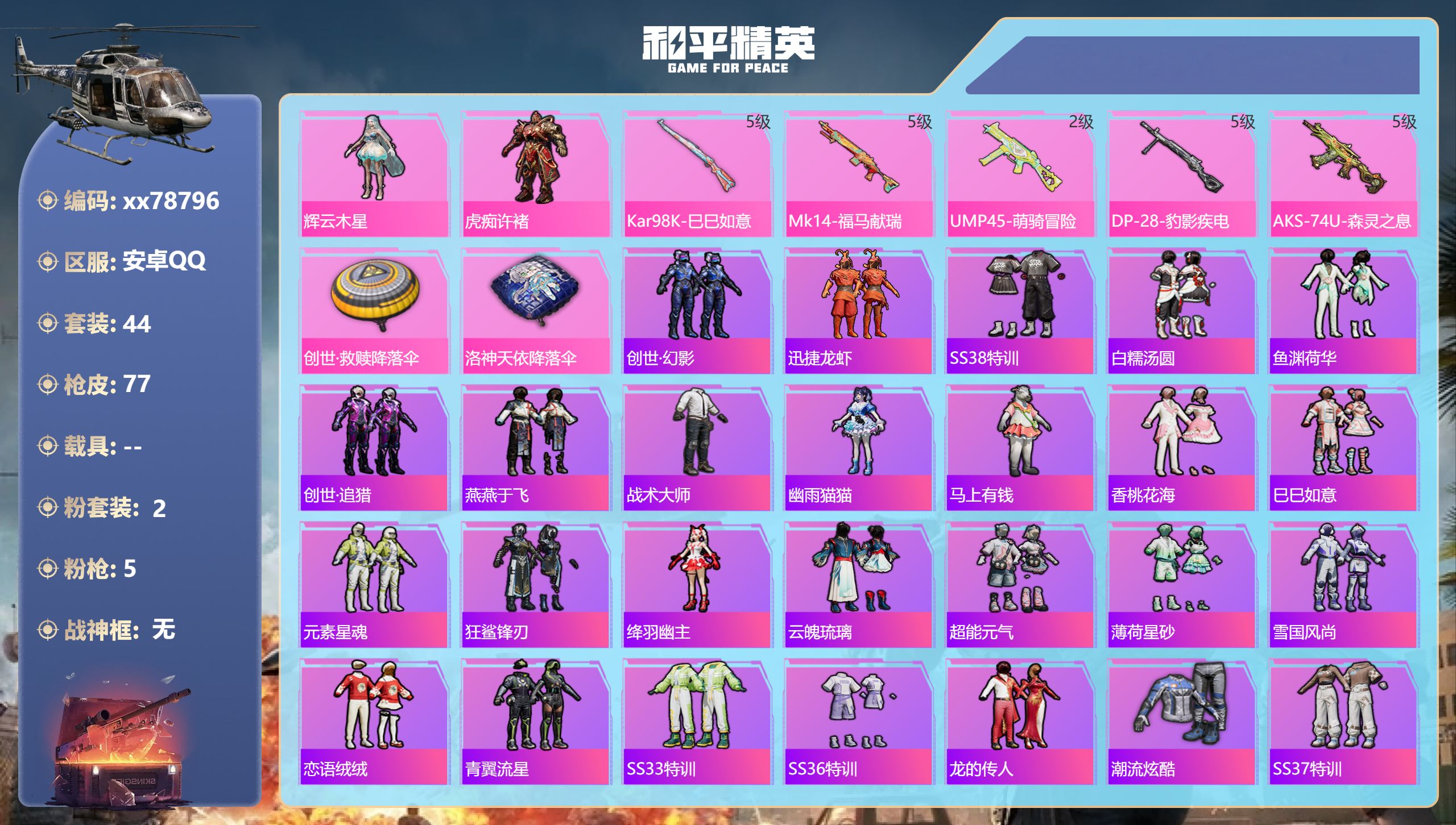 PX_2565017-,可二次,安卓手Q-0王牌印记-2粉装-5特效枪-18232热力值-44套装-77枪皮,,和平精英连体王者荣耀,安卓QQ/永恒钻石/110皮肤/112英雄/0典藏/0珍品无双/1无双/0珍品传说/5传说/31史诗/7稀有英雄,【1,无双皮肤】,无相,孙悟空,【5,传说皮肤】,地狱火,孙悟空,云鹰飞将,曜,地狱之眼,宫本武藏,神树通天,后羿,鸣野蒿,桑启, 【2粉装】,角色-辉云木星,角色-虎痴许褚, 【5特效枪】,Mk14-福马献瑞/5级,Kar98K-巳巳如意/5级,UMP45-萌骑冒险/2级,DP-28-豹影疾电/5级,AKS-74U-森灵之息/5级, 【44稀有时装】,辉云木星,虎痴许褚,创世·幻影,迅捷龙虾,SS38特训,白糯汤圆,鱼渊荷华,创世·追猎,燕燕于飞,战术大师,幽雨猫猫,马上有钱,香桃花海,巳巳如意,元素星魂,狂鲨锋刃,绛羽幽主,云魄琉璃,超能元气,薄荷星砂,雪国风尚,恋语绒绒,青翼流星,SS33特训,SS36特训,龙的传人,潮流炫酷,SS37特训,蓝色运动,阳光火鸡,黑色伏地魔,狙击之神,红釉青花,雨过天青,福马献瑞,冰冻风暴,玲珑侠影,完美偶像,疯狂小兔子,海岛探路者,牛气冲天,玉兔迎春,王牌教练,鹤鸣, 【78稀有枪械】,Kar98K-巳巳如意/5级,Mk14-福马献瑞/5级,UMP45-萌骑冒险/2级,DP-28-豹影疾电/5级,AKS-74U-森灵之息/5级,P1911-创世·救赎,Vector-创世·救赎,DBS-创世·救赎,MK12-乌木金纹,破片手榴弹-爆破雪人,DBS-幻彩电音,SPAS-12-狂鲨锋刃,MK20-H-狂鲨锋刃,大砍刀-咒蚀之裁,大砍刀-像素花束,M249-冰晶雪宝,AKS-74U-乌木金纹,爆炸猎弓-喜羊羊与灰太狼,Famas-乌木金纹,十字弩-异瞳寒姬,MG-36-薄荷星砂,SCAR-L-绿洲时空,PKM-啾咪啾咪,M24-天降萌叽,SCAR-L-玉兔迎春,SCAR-L-夜灯,SCAR-L-炫彩节奏,GROZA-影袭,AUG-甜蜜菠萝,M762-彩虹符号,Mk47-乌木金纹,AC-VAL-天降萌叽,M24-炫彩节奏,SKS-炫彩节奏,UZI-天降萌叽,UMP45-生命誓言,UMP45-夜灯,Vector-生命誓言,汤姆逊-天降萌叽,P90-玩趣呆呆,S12K-夜灯,DP-28-彩虹符号,MG3-幻世战舞者,平底锅-光之冒险,撬棍-沙丘之主权杖,撬棍-冰晶雪宝,DBS-绿洲时空,MG3-火熔核心,AC-VAL-荒原烈焰,ACE32-冰晶雪宝,JS9-辉云木星,DBS-辉云木星,野牛-燕燕于飞,M200-乌木金纹,SPAS-12-燕燕于飞,蝎式手枪-燕燕于飞,十字弩-异域银装,S686-巳巳如意,Vector-燕燕于飞,十字弩-燕燕于飞,M16A4-雨过天青,GROZA-福马献瑞,蜜獾-启元战纹,AMR-雨过天青,SLR-乌木金纹,AA12-G-雨过天青,PKM-雨过天青,沙漠之鹰-雨过天青,燃烧瓶-福马献瑞,MG3-蓝晶绮麟,P90-紫矿核心,SPAS-12-福马献瑞,蝎式手枪-虹云熊熊,汤姆逊-像素花束,P90-巳巳如意,破片手榴弹-巳巳如意,DBS-绿洲时空,MG3-火熔核心, 【4稀有飞行器】,狂鲨锋刃飞行器,马上有福飞行器,登顶巅峰飞行器,破刃行动尾迹, 【9稀有背包】,极意拳锋背包(3级),狂鲨锋刃背包(3级),巳巳如意背包(3级),虹云熊熊背包(3级),雪国风尚背包(3级),甜蜜菠萝背包(3级),创世・救赎背包(3级),福马献瑞背包(3级),智谋强哥背包(3级), 【14稀有降落伞】,创世·救赎降落伞,狂鲨锋刃降落伞,雨过天青降落伞,福马献瑞降落伞,野性觉醒降落伞,钢铁雄心降落伞,都市猎人降落伞,巳巳如意降落伞,绚烂橙彩降落伞,普通降落伞,燕燕于飞降落伞,洛神天依降落伞,青瓷战姬降落伞,电竞之星降落伞, 【8稀有头盔】,甜蜜菠萝头盔(3级),创世・救赎头盔(3级),雪国风尚头盔(3级),极意拳锋头盔(3级),狂鲨锋刃头盔(3级),异瞳寒姬头盔(3级),月下星之子头盔(3级),福马献瑞头盔(3级), , 安卓QQ/永恒钻石/110皮肤/112英雄/0典藏/0珍品无双/1无双/0珍品传说/5传说/31史诗/7稀有英雄, 【1,无双皮肤】,无相,孙悟空, 【5,传说皮肤】,地狱火,孙悟空,云鹰飞将,曜,地狱之眼,宫本武藏,神树通天,后羿,鸣野蒿,桑启, 【31,史诗皮肤】,猫狗日记,大乔,五谷丰年,鬼谷子,鬼剑武藏,宫本武藏,百相守梦,黄忠,星夜王子,白起,瓦猫非猫,太乙真人,线条小狗,周瑜,奇遇梦乡,蔡文姬,魅力维加斯,妲己,滕王阁序,弈星,暗夜贵公子,嬴政,鹰眼统帅,狄仁杰,猫狗日记,孙策,魔术师,狄仁杰,龙之律动,狂铁,皇家上将,赵云,冰冠公主,雅典娜,功夫厨神,程咬金,圣诞狂欢,吕布,节奏热浪,阿轲,织梦人,西施,万灵启世,女娲,心灵骇客,安琪拉,万物之道,弈星,缤纷独角兽,小乔,线条小狗,小乔,炽弈燎原,弈星,水果甜心,孙尚香,化蝶舞,阿轲,绮世丹青,狄仁杰,幽灵船长,曹操, 【57,勇者皮肤】,太极少年,赵怀真,大漠名商,沈梦溪,拳王,达摩,沉稳之力,孙尚香,醍醐杖,老夫子,白色死神,白起,阴阳师,狄仁杰,西部大镖客,牛魔,海滩派对,项羽,克喵,鬼谷子,踏浪烽翎,莱西奥,无双福将,程咬金,百相守梦,影,原初探秘者,鬼谷子,潮玩探月行,猪八戒,东方不败,武则天,雾影缉谜,兰陵王,赤刃凌霄,敖隐,死亡骑士,亚瑟,浪漫序章,刘备,敏锐之力,李白,玩偶对对碰,安琪拉,坚韧之力,苏烈,唤灵魔甲,刘禅,万事如意,刘备,逐霄之志,曹操,溯影追猎,虞姬,极光幻客,蚩奼,罗小黑战记,哪吒,荣光之誓,亚瑟,花好人间,甄姬,教廷特使,韩信,街头霸王,韩信,云中旅人,李元芳,秘证寻踪,小乔,春野闲踪,苏烈,布丁狗之约,阿古朵,命运加冕,露娜,灵野札记,张良,死霸装,白起,虚灵犬护,钟馗,班班快跑,鲁班七号,白执事,赵云,罗小黑战记,张良,星梦巡礼,姜子牙,谧流熔炉,太乙真人,鹤鸣心笺,艾琳,线条小狗,妲己,锦麟游梦,庄周,云械蓝图,云中君,逆浪荇歌,甄姬,海之女神,海月,线条小狗,周瑜,线条小狗,桑启,噬灭天穹,东皇太一,玫蓝誓约,戈娅,景韶洛都,明世隐, 【17,其他皮肤】,伊势巫女,大乔,金属狂潮,高渐离,潮流仙人,老夫子,灼热之刃,李信,精