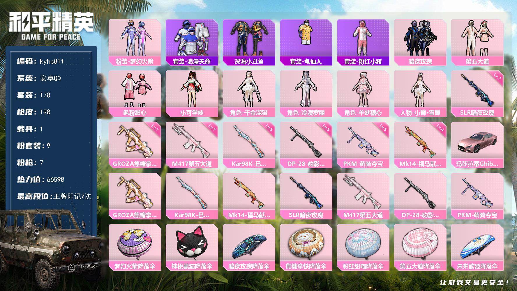 PX_2562084--9粉装-7特效枪-1载具-0粉色飞行器-66598热力值-7王牌印记-178套装-198枪皮 【热门品类】:粉装-梦幻火箭,套装-浪漫天命,套装-深海小丑鱼,套装-龟仙人,套装-粉红小猪 【粉色套装】:粉装-梦幻火箭,粉装-暗夜玫瑰,粉装-第五大道,粉装-飒粉甜心,角色-小可学妹,角色-千金淑猫,角色-冷漠罗丽,角色-羊梦糖心,人物-小舞·雪昙 【粉色枪皮等级】:GROZA-焦糖拿