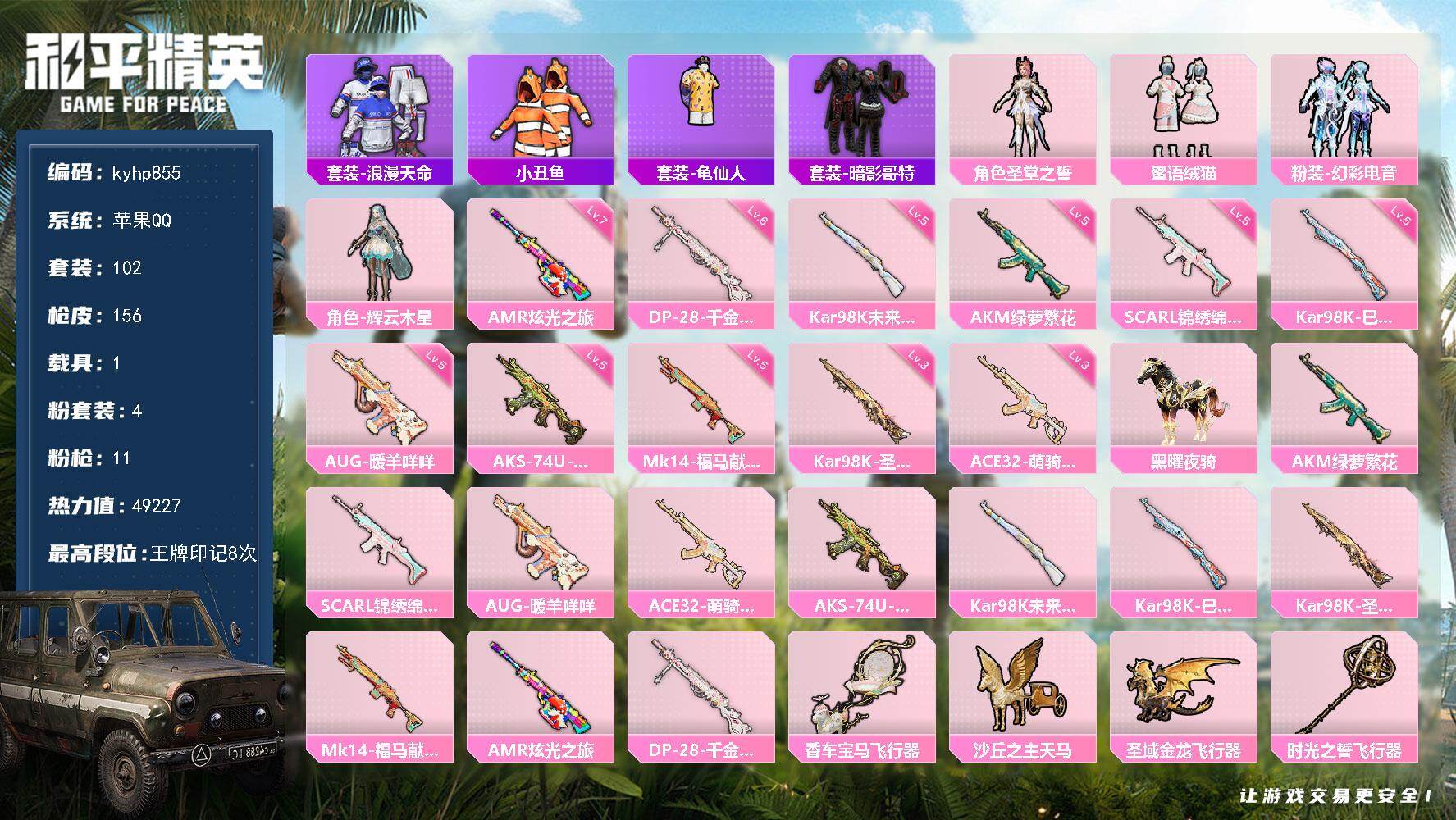 PX_2562124--4粉装-11特效枪-1载具-5粉色飞行器-49227热力值-8王牌印记-102套装-156枪皮 【热门品类】:套装-浪漫天命,套装-小丑鱼,套装-龟仙人,套装-暗影哥特 【粉色套装】:角色-圣堂之誓,粉装-蜜语绒猫,粉装-幻彩电音,角色-辉云木星 【粉色枪皮等级】:AKM-绿萝繁花(五级),SCAR-L-锦绣绵绵(五级),AUG-暖羊咩咩(五级),ACE32-萌骑漫游(三级),AK