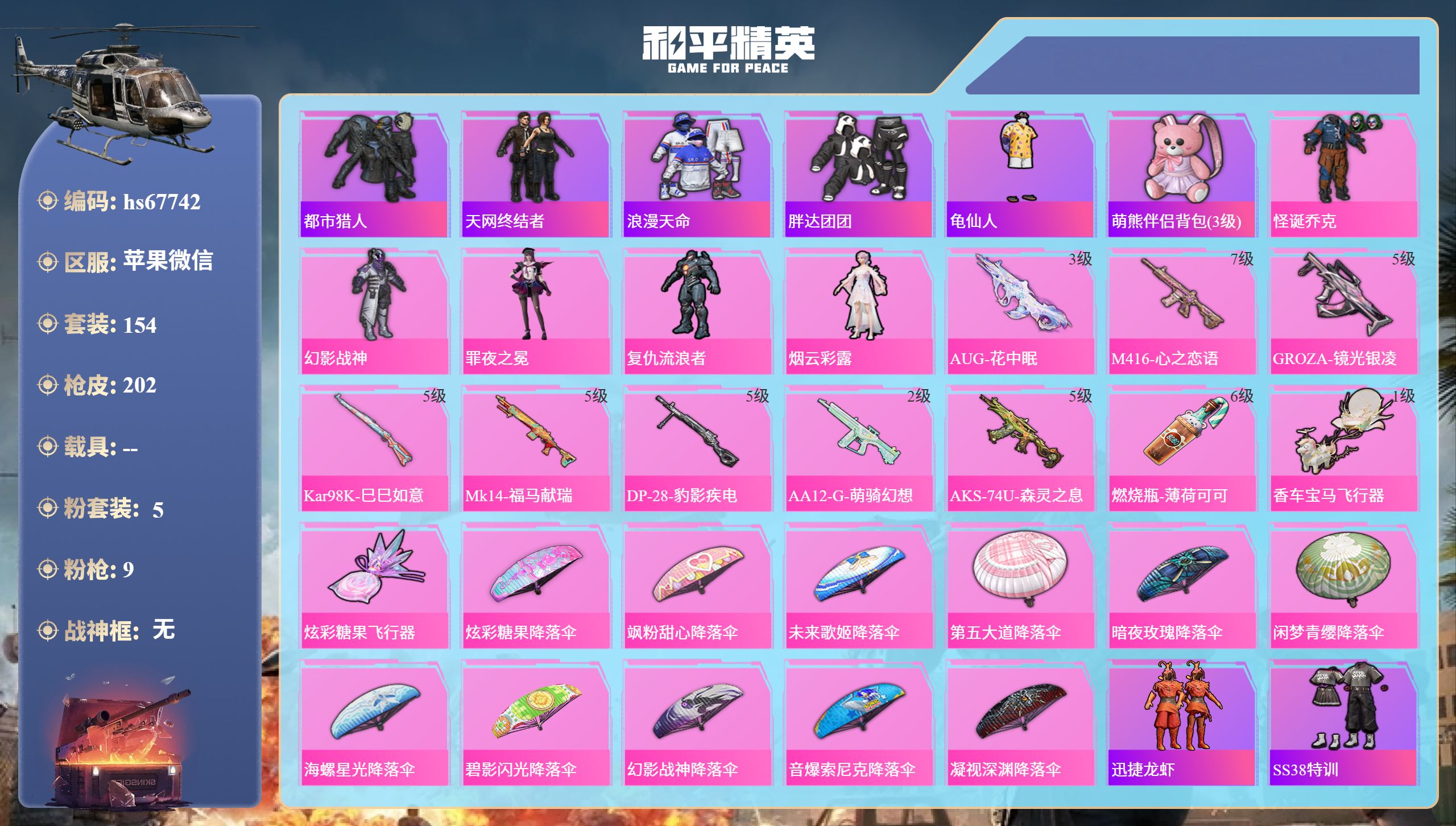 PX_2565298--1神装-11粉装-16特效枪-3载具-8粉色飞行器-86080热力值-19王牌印记-157套装-257枪皮 【红色神装等级】:百变纱华-安妮(一级) 【红色角色神装】:百变纱华-安妮 【热门品类】:粉装-雪国幻梦,粉装-梦幻火箭,粉装-缤纷油彩,套装-浪漫天命,套装-都市猎人,套装-龟仙人,套装-暗影哥特,套装-红熊茄茄 【粉色套装】:粉装-雪国幻梦,粉装-梦幻火箭,粉装-缤纷油彩