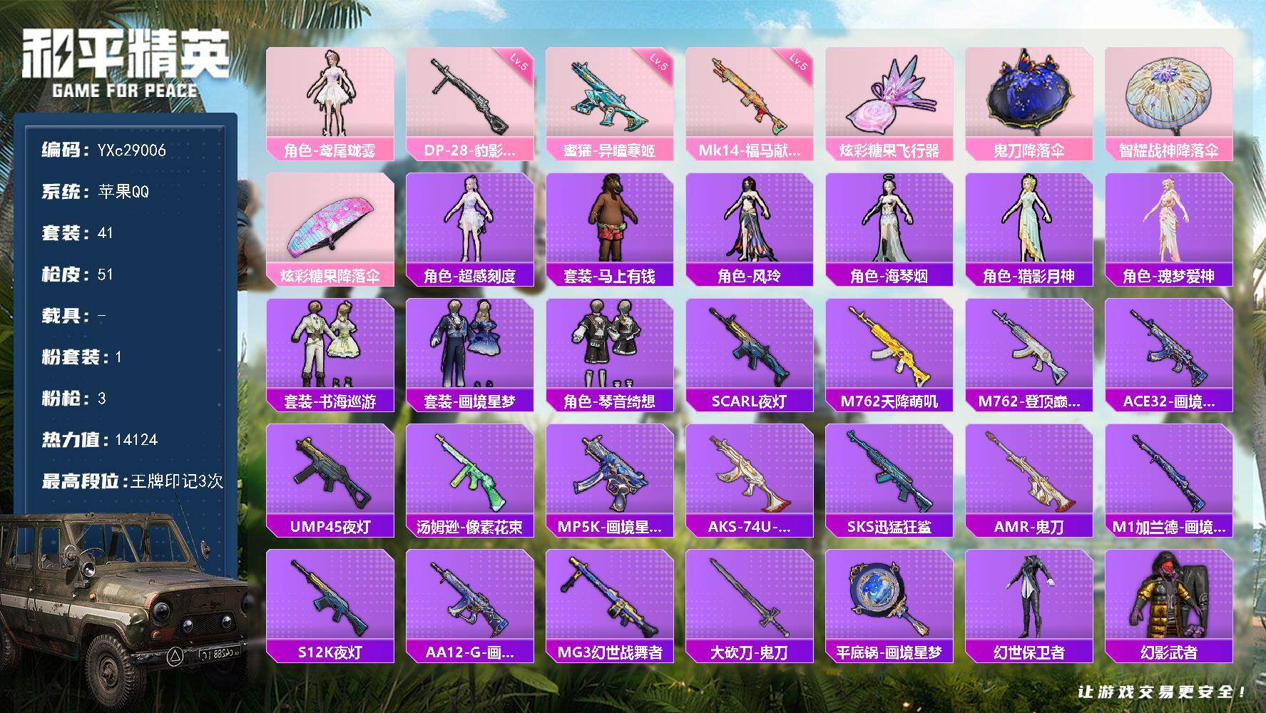 PX_2555493-??转区】YXc29006-【无二次协助处理】【因赛季更新游戏段付以上号为准!】 苹果Q-3特效枪1热门41套装51枪皮3印记,历史超级王牌15星, 【3特效枪】,DP-28-豹影疾电,(5级),蜜獾-异瞳寒姬,(5级),Mk14-福马献瑞,(5级), 【1热门】,破蛋小黄鸡,