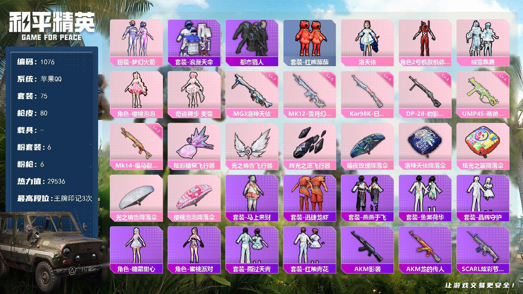 PX_2555468-次0违规-精品女身法号-【萌熊背包,浪漫天命,都市,红熊茄茄,梦幻火箭,洛天依,红螳螂,绒雪飘舞,樱桃泡泡,,美雪】苹果,手Q-6粉装-6特效枪-0载具-3粉色飞行器-29536热力值-3王牌印记-75套装-80枪皮 【热门品类】:粉装-梦幻火箭,套装-浪漫天命,套装-都市猎人,套装-红熊茄茄 【粉色套装】:粉装-梦幻火箭,角色-洛天依,角色-2号机款机体服,粉装-绒雪飘舞,角色-樱桃泡泡,角色-奇迹舞步,美雪 【粉色枪皮等级】:UMP45-萌骑冒险(四级),Kar98K-巳巳如意(四级),Mk14-福马献瑞(二级),MK12-雪月幻音(五级),DP-28-豹影疾电(四级),MG3-洛神天依(七级) 【粉色枪皮】:UMP45-萌骑冒险,Kar98K-巳巳如意,Mk14-福马献瑞,MK12-雪月幻音,DP-28-豹影疾电,MG3-洛神天依 【粉色飞行器】:炫彩糖果飞行器,光之祷告飞行器,辉光之愿飞行器 【粉色降落伞】:暗夜玫瑰降落伞,洛神天依降落伞,炫光之旅降落伞,光之祷告降落伞,樱桃泡泡降落伞 【稀有套装】:套装-马上来财,套装-迅捷龙虾,套装-燕燕于飞,套装-鱼渊荷华,套装-晶辉守护,角色-糖霜甜心,角色-蜜桃派对,套装-雨过天青,套装-红釉青花 【稀有枪皮】:AKM-影袭,AKM-龙的传人,SCAR-L-炫彩节奏,SCAR-L-绶带小兔,GROZA-影袭,AUG-甜蜜菠萝,QBZ-洛神天依,M762-瑞龙福将,Mk47-洛神天依,AC-VAL-天降萌叽,AC-VAL-闲梦青缨,UZI-啾咪啾咪,UZI-天降萌叽,UZI-影袭,UZI-炫彩节奏,UMP45-绒宝小鹅,Vector-暗夜玫瑰,汤姆逊-异彩先驱,汤姆逊-樱桃泡泡,汤姆逊-像素花束,P90-飞驰魅影,Kar98K-影袭,Kar98K-梦幻火箭,Kar98K-洛神天依,Kar98K-飞驰魅影,M24-影袭,M24-仲夏莫吉托,M24-樱桃泡泡,SKS-炫彩节奏,Mini14-异彩先驱,Mini14-梦幻火箭,Mini14-甜心娃娃,Win94-瑞龙福将,MK20-H-樱桃泡泡,MK20-H-绶带小兔,M200-仲夏莫吉托,S1897-飞驰魅影,S12K-瑞龙福将,DP-28-彩虹符号,MG3-幻世战舞者,MG3-瑞龙福将,P92-红伞翩翩 【其他套装】:套装-SS17特训,套装-SS18特训,套装-