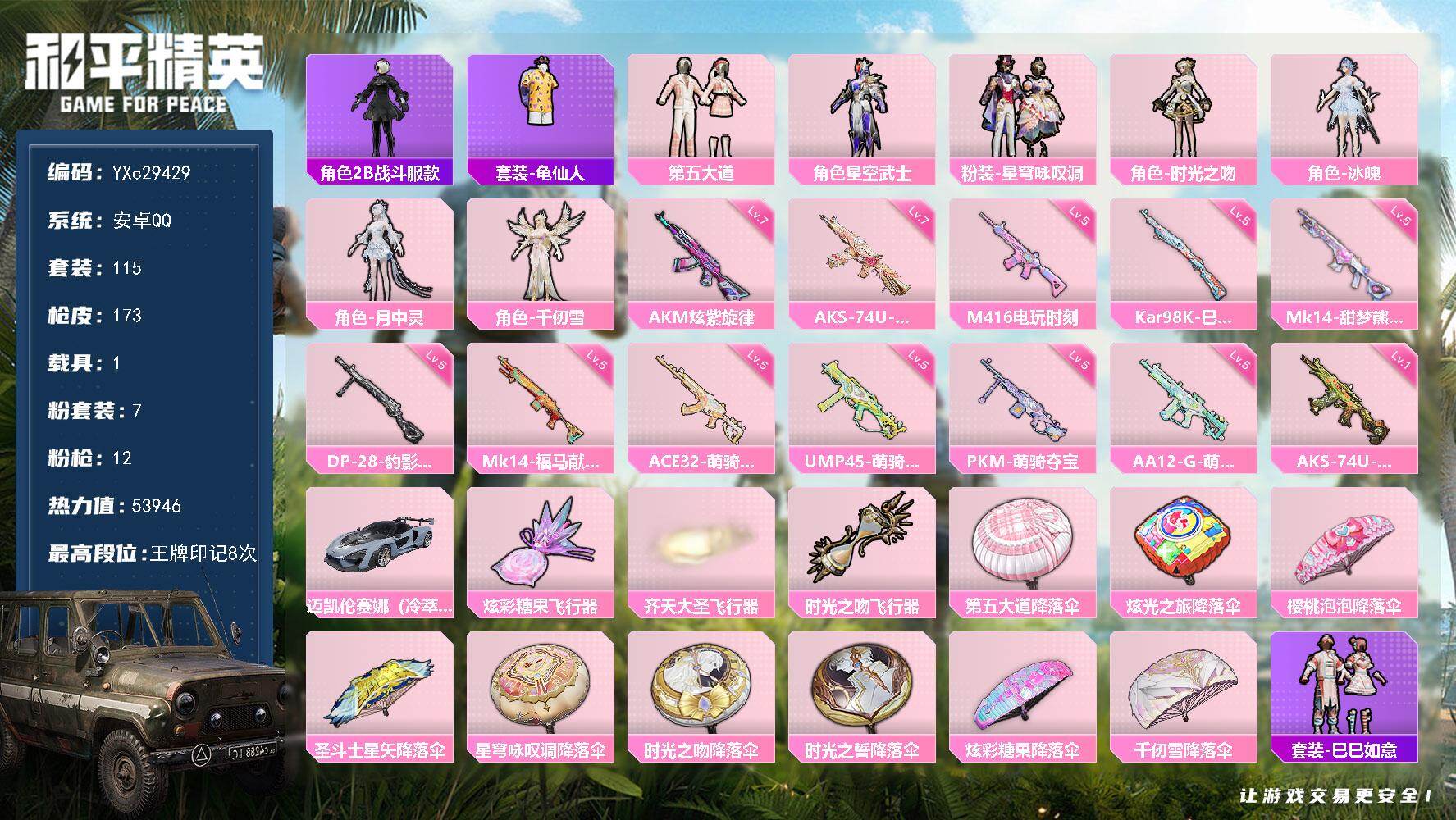 PX_2555470-??灵】YXc29429-【无二次协助处理】【因赛季更新游戏段付以上号为准!】 安卓Q-1载具6粉装12特效枪3热门115套装173枪皮,8印记,历史超级王牌15星, 【1载具】,迈凯伦塞纳(冷萃蓝), 【7粉装】,冰魄,月中灵,时光之吻,星穹咏叹调,星空武士,第五大道,千仞雪 【12特效枪】,M416-电玩时刻,(5级),AKM-炫紫旋律,(7级),AKS-74U-森灵之息,(1级),AKS-74U-星穹咏叹调,(7级),Kar98K-巳巳如意,(5级),DP-28-豹影疾电,(5级),Mk14-甜梦熊击,(5级),Mk14-福马献瑞,(5级),AA12-G-萌骑幻想,(5级),PKM-萌骑夺宝,(5级),UMP45-萌骑冒险,(5级),ACE32-萌骑漫游,(5级), 【3热门】,龟仙人,2B战斗服款,破蛋小黄鸡, 【1飞行器】,齐天大圣飞行器