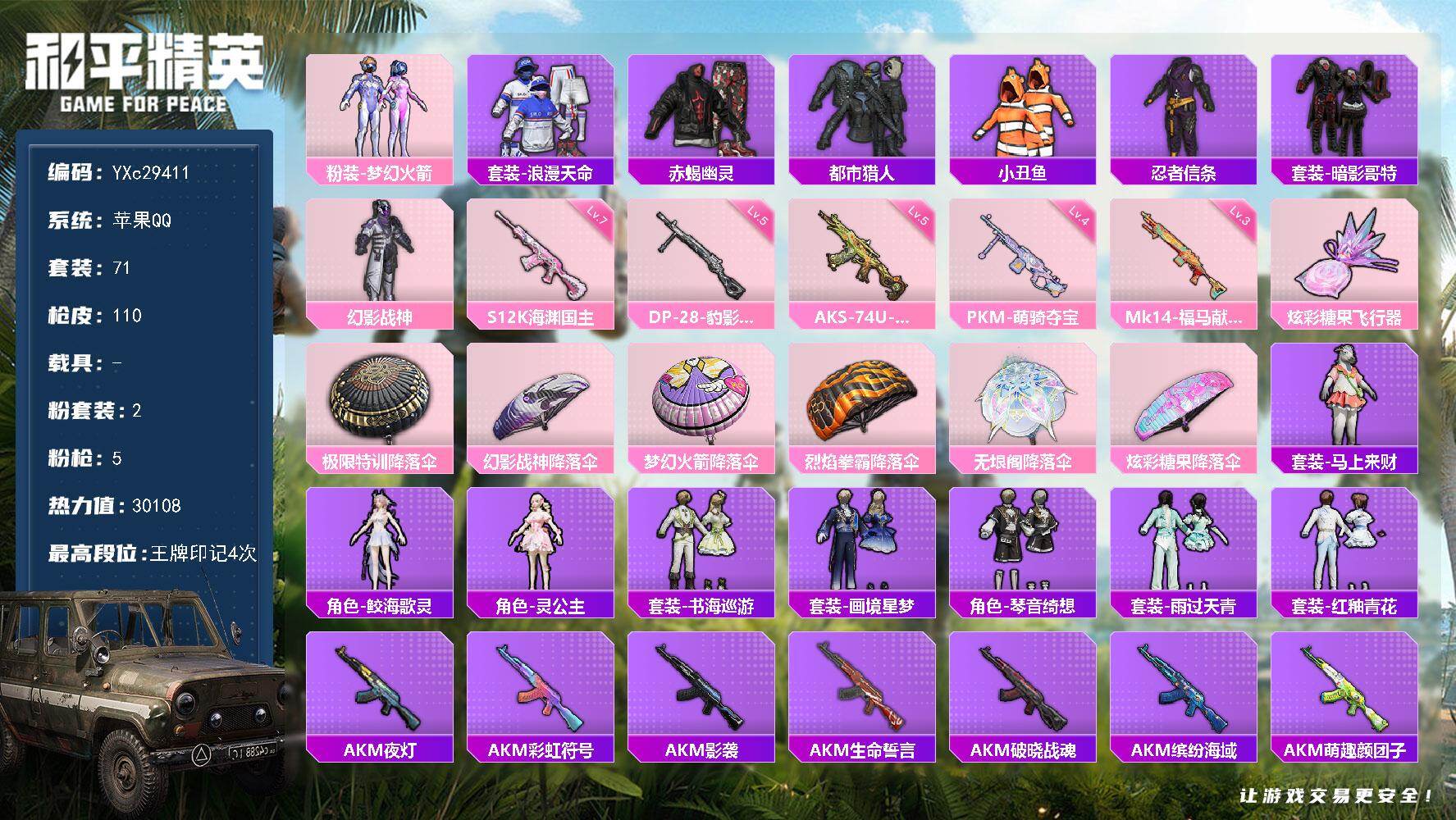 PX_2555472-??,赤蝎,新101,小丑鱼,兔兔,哥特,国宝头】YXc29411-【无二次协助处理】【因赛季更新游戏段付以上号为准!】 ,苹果Q-4稀有2粉装5特效枪15热门71套装110枪皮,,4印记,历史卓越王牌21星, 【4稀有】,赤蝎幽灵,AKM-缤纷海域,都市猎人,浪漫天命, 【2粉装】,梦幻火箭,幻影战神, 【5特效枪】,AKS-74U-森灵之息,(5级),DP-28-豹影疾电,(5级),S12K-海渊国主,(7级),Mk14-福马献瑞,(3级),PKM-萌骑夺宝,(4级), 【15热门】,小丑鱼,呆萌铁蟹,鹰眼刺客,兔兔白日梦,迅捷狂鲨,暗影哥特,团圆交子,瑞龙福将,忍者信条,西部牛仔,漫步者,破蛋小黄鸡,弄潮海豚,M762-瑞龙福将,S686-奇异狩猎者, 【4头盔】,国宝胖达头盔,梦幻火箭头盔,幻影战神头盔,深海小丑鱼头盔, 【3背包】,梦幻火箭背包,幻影战神背包,深海小丑鱼背包,