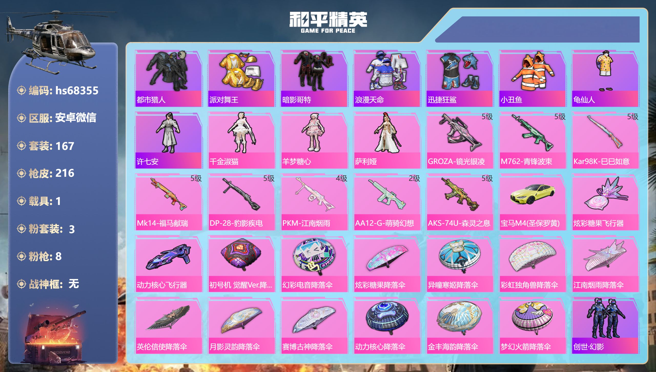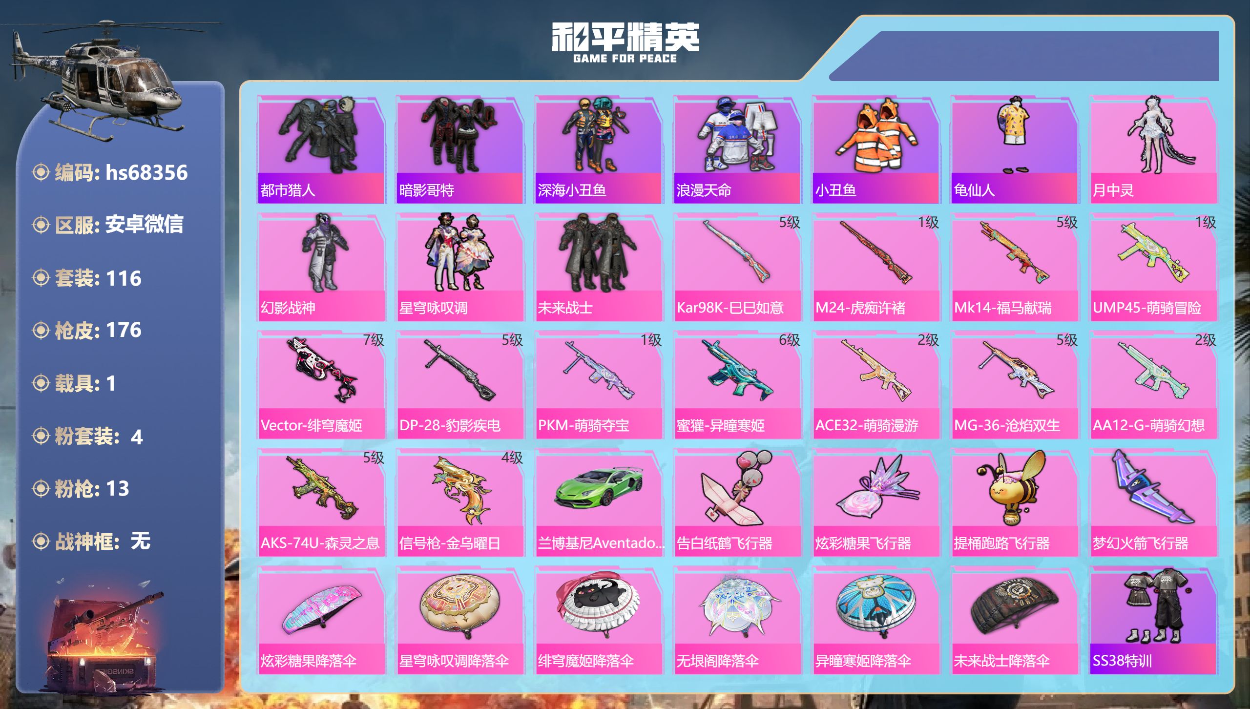 PX_2543293-,安卓微信-7王牌印记-4粉装-13特效枪-1载具-49530热力值-116套装-176枪皮-2卓越印记 【4粉装】套装-幻影战神,套装-星穹咏叹调,套装-未来战士,角色-月中灵 【13特效枪】AKS-74U-森灵之息/5级,Vector-绯穹魔姬/7级,M24-虎痴许褚/1级,蜜獾-异瞳寒姬/6级,UMP45-萌骑冒险/1级,ACE32-萌骑漫游/2级,DP-28-豹影疾电/5级,AA12-G-萌骑幻想/2级,PKM-萌骑夺宝/1级,Mk14-福马献瑞/5级,MG-36-沧焰双生/5级,信号枪-金乌曜日/4级,Kar98K-巳巳如意/5级 【6稀有紫装】都市猎人,暗影哥特,深海小丑鱼,浪漫天命,小丑鱼,龟仙人 【1稀有载具】兰博基尼Aventador,SVJ(翡翠绿) 【115稀有时装】月中灵,幻影战神,星穹咏叹调,未来战士,SS38特训,都市猎人,浪漫天命,龟仙人,暗影哥特,深海小丑鱼,小丑鱼,激萌罗小黑,龙魂突击队,异域银装,白糯汤圆,鱼渊荷华,大橘大利,燕燕于飞,NV战队服,风玲,战术大师,紫俏灵猫,元素星魂,午间小调,琴音绮想,霓虹热舞,夜幕侵蚀,雪绒豹,雁字回时,画境星梦,星影赞美诗,朱霞炽焰,狂鲨锋刃,阳光菠萝,凌霄紫焰,粉黛兰香,无面战甲,擎苍青焰,炫彩糖果,绯色魅影,萌鸡速递,荧光像素,元气之梦,书海巡游,风迹短诗,错位像素,漫游都市,薄荷星砂,秘语星愿,蓝海鲸歌,云朵鹅,顶瓜瓜,雪国风尚,蓝冰羽,恋语绒绒,青翼流星,紫幽梦,马上来财,SS35特训,SS31特训,SS33特训,SS32特训,SS36特训,军械专家,龙的传人,潮流炫酷,白熊同盟,SS37特训,特训学院,猎鹰,青年教官,橘黑制服,红色运动,黄色运动,蓝色运动,黄色伏地魔,白色伏地魔,酒红色名流,阳光火鸡,湖蓝色名流,黄色名流,绯格组合,漫步者,黑色伏地魔,SS34特训,竞技名士,深蓝色名流,猛禽,长空猛禽,魅力单车,幻世战舞者,冰川特警,狙击之神,红釉青花,麻辣教官,鹰眼刺客,雨过天青,福马献瑞,冰冻风暴,破蛋小黄鸡,绮丽涂鸦,竞技达人朋克,海岛探路者,幻世保卫者,耀粉歌者,SS20特训,SS21特训,SS22特训,夏日倾情,缤纷果语,王牌教练,暗夜之虎,SS25特训,快乐星愿,星梦畅游 【175稀有枪械】Kar98K-巳巳如意/5级,M24-虎痴许褚/1级,Mk14-福马献瑞/5级,UMP45-萌骑冒险/1级,Vector-绯穹魔姬/7级,DP-28-豹影疾电/5级,PKM-萌骑夺宝/1级,蜜獾-异瞳寒姬/6级,ACE32-萌骑漫游/2级,MG-36-沧焰双生/5级,AA12-G-萌骑幻想/2级,AKS-74U-森灵之息/5级,信号枪-金乌曜日/4级,M16A4-冰河战士,DBS-风迹短诗,莫辛纳甘-风迹短诗,M416-错位像素,AKM-绿洲时空,GROZA-无面战甲,Win94-乌木金纹,MK12-风迹短诗,MK12-乌木金纹,AKS-74U-荧光像素,破片手榴弹-爆破雪人,PKM-紫幽梦,MG3-霓彩脉冲,QBU-夜幕侵蚀,ACE32-画境星梦,M1加兰德-画境星梦,MP5K-画境星梦,Mk14-紫幽梦,蜜獾-乌木金纹,M762-云朵鹅,S1897-紫幽梦,SVD-云朵鹅,P92-紫幽梦,蜜獾-绯穹魔姬,AWM-绿洲时空,M249-绯穹魔姬,汤姆逊-错位像素,SPAS-12-狂鲨锋刃,MK20-H-狂鲨锋刃,AUG-冰晶雪宝,突击盾牌-绝对恒星,铝热弹-炫彩糖果,UZI-炫彩糖果,撬棍-咒蚀之裁,ARX-像素花束,大砍刀-像素花束,AA12-G-画境星梦,G36C-星穹咏叹调,平底锅-画境星梦,短管霰弹-星穹咏叹调,M249-冰晶雪宝,Kar98K-星穹咏叹调,Mk47-风迹短诗,平底锅-咒蚀之裁,JS9-凌霄紫焰,MG-36-凌霄紫焰,平底锅-紫幽梦,UMP45-海盐豹豹,ARX-凌霄紫焰,AKS-74U-乌木金纹,AKM-涂鸦街区,蜜獾-风迹短诗,P92-凌霄紫焰,Famas-乌木金纹,Famas-霓彩脉冲,SPAS-12-云朵鹅,M249-无面战甲,破片手榴弹-拽到爆炸,十字弩-异瞳寒姬,UMP45-夜幕侵蚀,S1897-糯团青竹,信号枪-异瞳寒姬,平底锅-凌霄紫焰,Mk14-薄荷星砂,蝎式手枪-蛇蝎美人,沙漠之鹰-云朵鹅,烟雾弹-冰氧夏日,Mk14-紫晶流影,MG-36-薄荷星砂,SCAR-L-绿洲时空,PKM-荧光像素,大砍刀-云朵鹅,PKM-啾咪啾咪,M24-天降萌叽,SPAS-12-钛晶裂爪,SVD-霓彩脉冲,SLR-霓彩脉冲,平底锅-属我最6,SCAR-L-彩虹符号,P1911-无面战甲,AUG-紫晶流影,S12K-霓彩脉冲,M416-魔童闹海,敖闰,AKM-霓彩脉冲,M416-红色方程式,AKM-影袭,AKM-破晓战魂,AKM-龙的传人,SCAR-L-玉兔迎春,SCAR-L-夜灯,SCAR-L-炫彩节奏,GROZA-影袭,AUG-幻影战神,AUG-耀粉歌者,M762-彩虹符号,Mk47-乌木金纹,AC-VAL-乌木金纹,蜜獾-天降萌叽,Kar98K-梦幻火箭,Kar98K-影袭,M24-影袭,AWM-黄金龙骨,AWM-雷霆特警,AMR-乌木金纹,VSS-未来战士,Mini14-梦幻火箭,Mk14-乌木金纹,UZI-影袭,UMP45-生命誓言,UMP45-夜灯,UMP45-金玉无双,Vector-金玉无双,汤姆逊-幻影战神,P90-乌木金纹,S686-奇异狩猎者,S686-生命誓言,S12K-幻世战舞者,S12K-幻影战神,S12K-夜灯,DBS-彩虹符号,M249-彩虹符号,DP-28-未来战士,MG3-幻世战舞者,MG3-乌木金纹,平底锅-空岛之星,撬棍-快乐主宰,撬棍-绯红前夜,撬棍-冰晶雪宝,DBS-绿洲时空,MG3-火熔核心,JS9-蓝晶绮麟,爆炸猎弓-精灵之光,ACE32-冰晶雪宝,突击盾牌-虎痴许褚,AUG-异域银装,Famas-月下星之子,野牛-燕燕于飞,M200-乌木金纹,SPAS-12-燕燕于飞,蝎式手枪-燕燕于飞,十字弩-异域银装,爆炸猎弓-花中眠,Vector-燕燕于飞,十字弩-燕燕于飞,AKS-74U-鬼刀,M16A4-雨过天青,GROZA-福马献瑞,蜜獾-启元战纹,AMR-雨过天青,SLR-乌木金纹,AA12-G-雨过天青,PKM-雨过天青,Kar98K-自由猎手,沙漠之鹰-雨过天青,燃烧瓶-福马献瑞,P90-紫矿核心,GROZA-紫矿核心,Vector-荒原烈焰,汤姆逊-像素花束,DBS-绿洲时空,MG3-火熔核心,MG-36-绿洲幽影 【11稀有飞行器】狂鲨锋刃飞行器,马上有福飞行器,告白纸鹤飞行器,鸡智如我飞行器,炫彩糖果飞行器,登顶巅峰飞行器,破刃行动尾迹,提桶跑路飞行器,粉色滑翔尾迹,梦幻火箭飞行器,异域银装飞行器 【29稀有背包】极意拳锋背包(3级),狂鲨锋刃背包(3级),绯穹魔姬背包(3级),画境星