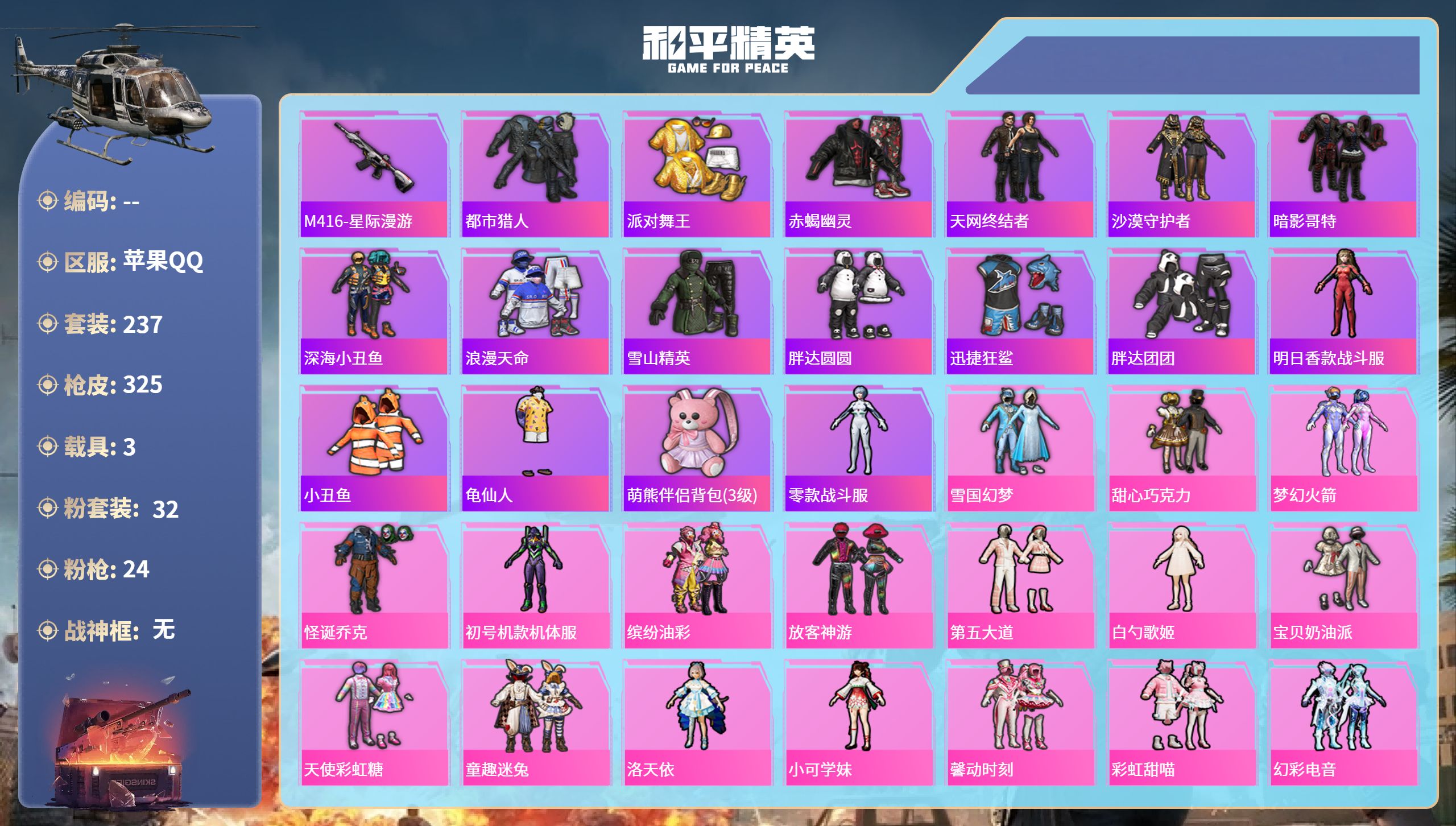 PX_2537144-,苹果微信-2王牌印记-1红装-15粉装-16特效枪-3载具-49366热力值-94套装-117枪皮-1卓越印记 【1红装】魔童闹海-哪吒/1级 【15粉装】套装-暖熊萌萌,套装-宝贝奶油派,角色-奇迹舞步,美雪,女娲后裔-赵灵儿,套装-极限特训,角色-闪耀迪迦,套装-甜心巧克力,套装-雪国幻梦,套装-天使彩虹糖,套装-星际漫游者,角色-奇迹舞步,美琪,套装-未来战士,套装-怪诞乔克,套装-幻影战神,套装-放客神游 【16特效枪】GROZA-巴啦啦小魔仙/3级,破片手榴弹-招财进宝/1级,Kar98K-巳巳如意/2级,燃烧瓶-天降桃花/5级,AUG-星梦奇缘/8级,烟雾弹-猫咪绅士/3级,SCAR-L-魔童闹海,哪吒/3级,M416-灵猫魔法师/1级,DP-28-豹影疾电/4级,AA12-G-萌骑幻想/3级,AUG-超新星/1级,Mk14-福马献瑞/4级,破片手榴弹-粉粉猫爪/6级,M416-至情至圣/4级,P90-魔童闹海,敖丙/2级,AKM-甜心宝贝/4级 【13稀有紫装】冥河战士,都市猎人,派对舞王,赤蝎幽灵,暗影哥特,深海小丑鱼,浪漫天命,胖达圆圆,迅捷狂鲨,胖达团团,东方飞龙,小丑鱼,萌熊伴侣背包(3级) 【3稀有载具】黑曜夜骑,冰绡玉鳞,踏焰逐风摩托车 【94稀有时装】哪吒/1级,雪国幻梦,甜心巧克力,怪诞乔克,放客神游,赵灵儿,闪耀迪迦,宝贝奶油派,天使彩虹糖,极限特训,暖熊萌萌,幻影战神,奇迹舞步,美雪,奇迹舞步,美琪,星际漫游者,未来战士,太空漫步,迅捷龙虾,都市猎人,胖达团团,浪漫天命,暗影哥特,深海小丑鱼,小丑鱼,东方飞龙,迅捷狂鲨,胖达圆圆,赤蝎幽灵,冥河战士,派对舞王,狂战萌兔,Alan,Walker,粉雾星云,粉团憨憨,红熊茄茄,糯粉咩咩,LGD战队服,极地流光,朱霞炽焰,狂鲨锋刃,喜羊羊,美羊羊,凌霄紫焰,擎苍青焰,炫彩糖果,萌鸡速递,元气之梦,薄荷星砂,雪国风尚,孙斩天,青翼流星,马上来财,SS35特训,SS36特训,SS37特训,黄色运动,黄色伏地魔,白色伏地魔,湖蓝色名流,黄色名流,漫步者,黑色伏地魔,SS34特训,雪鹰学院,竞技名士,长空猛禽,魅力单车,水银刺客,幻影公爵,狙击之神,红釉青花,鹰眼刺客,雨过天青,沙暴袭击者,福马献瑞,冰冻风暴,冷酷挑战者,完美偶像,疯狂小兔子,摇滚舞王,红潮炫舞,超能勇士,海岛探路者,幻世保卫者,情公主,金耀舞者,弄潮海豚,呆萌铁蟹,夏日倾情,青涩年华,星耀竞速,忍者信条,老实芭蕉,旷野奇兵 【117稀有枪械】AUG-星梦奇缘/8级,M416-灵猫魔法师/1级,M416-至情至圣/4级,SCAR-L-魔童闹海,哪吒/3级,P90-魔童闹海,敖丙/2级,AKM-甜心宝贝/4级,GROZA-巴啦啦小魔仙/3级,AUG-超新星/1级,Kar98K-巳巳如意/2级,Mk14-福马献瑞/4级,DP-28-豹影疾电/4级,AA12-G-萌骑幻想/3级,烟雾弹-猫咪绅士/3级,破片手榴弹-招财进宝/1级,破片手榴弹-粉粉猫爪/6级,燃烧瓶-天降桃花/5级,DBS-乌木金纹,MK20-H-星梦奇缘,SCAR-L-海盐豹豹,撬棍-突变脉冲,UZI-冰河战士,MK20-H-乌木金纹,AKM-绿洲时空,Win94-乌木金纹,MK12-乌木金纹,烟雾弹-冰澜龙吟,AKM-灵猫魔法师,汤姆逊-灵猫魔法师,撬棍-灵猫魔法师,SPAS-12-狂鲨锋刃,MK20-H-狂鲨锋刃,铝热弹-炫彩糖果,UZI-炫彩糖果,ARX-像素花束,大砍刀-像素花束,AWM-奇迹舞步,信号枪-奇迹舞步,M249-冰晶雪宝,JS9-凌霄紫焰,MG-36-凌霄紫焰,ARX-凌霄紫焰,AKS-74U-乌木金纹,AKM-涂鸦街区,P92-凌霄紫焰,Famas-乌木金纹,Famas-霓彩脉冲,破片手榴弹-拽到爆炸,平底锅-凌霄紫焰,MG-36-薄荷星砂,S1897-荧海星豚,SVD-霓彩脉冲,蜜獾-冰澜龙吟,大砍刀-冰澜龙吟,S12K-霓彩脉冲,M416-魔童闹海,敖闰,AMR-鸡智如我,AKM-霓彩脉冲,撬棍-火尖枪,AKM-影袭,AKM-缤纷海域,SCAR-L-未来战士,M16A4-冥河战士,GROZA-影袭,AUG-幻影战神,AUG-耀粉歌者,AUG-甜蜜菠萝,AUG-天降萌叽,M762-甜心宝贝,M762-暖熊萌萌,M24-影袭,M24-未来战士,AWM-天降萌叽,SKS-金玉无双,SKS-迅猛狂鲨,VSS-未来战士,Mini14-金玉无双,Mini14-炫彩节奏,Mini14-穿刺龙虾,Mk14-童趣迷兔,UZI-影袭,UZI-幻影战神,UZI-金玉无双,UMP45-金玉无双,Vector-金玉无双,汤姆逊-天降萌叽,汤姆逊-幻影战神,MP5K-乌木金纹,S686-未来战士,S12K-幻影战神,S12K-暖熊萌萌,DP-28-甜心宝贝,DP-28-未来战士,DP-28-彩虹符号,MG3-幻世战舞者,平底锅-甜心宝贝,撬棍-甜心宝贝,撬棍-环太平洋,撬棍-冥河战士,MG3-火熔核心,ACE32-冰晶雪宝,突击盾牌-虎痴许褚,AUG-异域银装,十字弩-异域银装,爆炸猎弓-花中眠,M338-幻骨萌王,P92-幻骨萌王,M16A4-雨过天青,GROZA-福马献瑞,AMR-雨过天青,SLR-乌木金纹,AA12-G-雨过天青,PKM-雨过天青,沙漠之鹰-雨过天青,P90-紫矿核心,GROZA-紫矿核心,汤姆逊-像素花束,MG3-火熔核心 【8稀有飞行器】飞天猪飞行器/1级,灵猫魔法师飞行器,灵珠游龙飞行器,狂鲨锋刃飞行器,鸡智如我飞行器,炫彩糖果飞行器,节奏起飞飞行器,异域银装飞行器 【26稀有背包】萌熊伴侣背包(3级),雪国精灵背包(3级),小丑背包(3级),暖熊萌萌背包(3级),魔童闹海,敖丙背包(3级),灵猫魔法师背包(3级),狂鲨锋刃背包(3级),奇迹舞步背包(3级),炫彩糖果背包(3级),喜羊羊与灰太狼背包(3级),异瞳寒姬背包(3级),凌霄紫焰背包(3级),薄荷星砂背包(3级),幻影战神背包(3级),星梦奇缘背包(3级),未来战士背包(3级),赤蝎幽灵背包(3级),甜心宝贝背包(3级),异域银装背包(3级),雪国风尚背包(3级),甜蜜菠萝背包(3级),幻骨萌王背包(3级),福马献瑞背包(3级),荒原烈焰背包(3级),深海小丑鱼背包(3级),精灵梦叶罗丽背包(3级) 【30稀有降落伞】魔童闹海,敖丙降落伞,灵猫魔法师降落伞,炫彩糖果降落伞,狂鲨锋刃降落伞,会说话的汤姆猫降落伞,雨过天青降落伞,福马献瑞降落伞,奇迹舞步降落伞,SS34王牌降落伞,凌霄紫焰降落伞