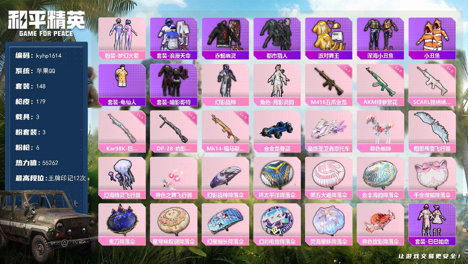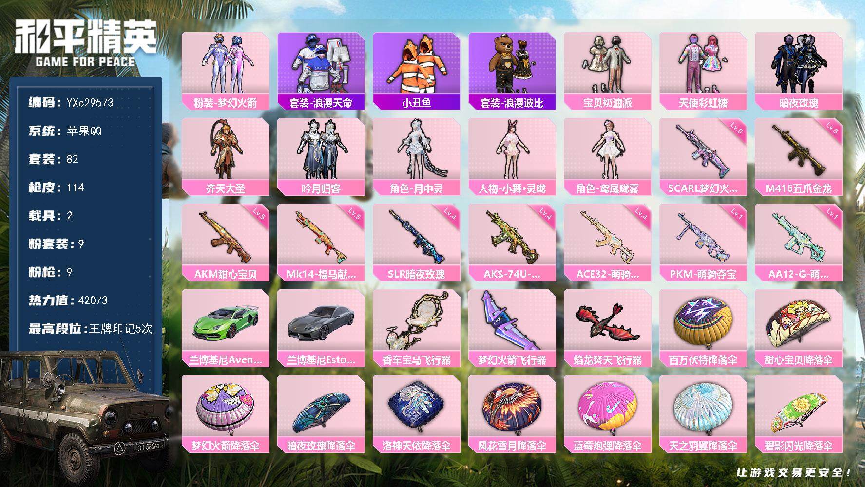 PX_2555440--3粉装-6特效枪-3载具-3粉色飞行器-55262热力值-12王牌印记-148套装-179枪皮 【热门品类】:粉装-梦幻火箭,套装-浪漫天命,套装-赤蝎幽灵,套装-都市猎人,套装-派对舞王,套装-深海小丑鱼,套装-小丑鱼,套装-龟仙人,套装-暗影哥特 【粉色套装】:粉装-幻影战神,粉装-梦幻火箭,角色-月影灵韵 【粉色枪皮等级】:AKM-绿萝繁花(五级),SCAR-L-锦绣绵绵(五