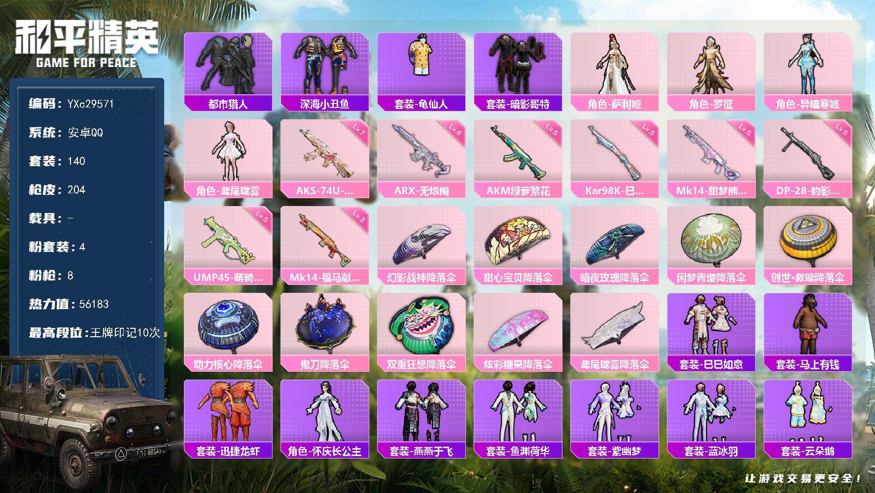 PX_2555460-01,双马尾,满地铁天赋】YXc29433-【可二次】【因赛季更新游戏段付以上号为准!】 安卓Q-1载具7粉装8特效枪13热门143套装170枪皮,,5印记,历史超级王牌12星, 【1载具】,护世瑞兽, 【7粉装】,梦幻火箭,雪月幻音,异瞳寒姬,星穹咏叹调,数码大师,飓风飞鹰,赤焰黑爵, 【8特效枪】,Kar98K-圣域龙灵,(3级),Kar98K-巳巳如意,(5级),DP-28-豹影疾电,(5级),AUG-暖羊咩咩,(5级),PKM-江南烟雨,(7级),Mk14-盛世惊鸿,(3级),GROZA-镜光银凌,(5级),UMP45-萌骑冒险,(5级), 【13热门】,龟仙人,雪山精英,梦魇先生,呆萌铁蟹,暴走罗小黑,深海小丑鱼,罗小黑,粉红小猪,狂沙舞者,破蛋小黄鸡,军刀雅典娜,弄潮海豚,M762-奇异狩猎者, 【1头盔】,深海小丑鱼头盔, 【2背包】,梦幻火箭背包,深海小丑鱼背包,圣域龙宝僚机,