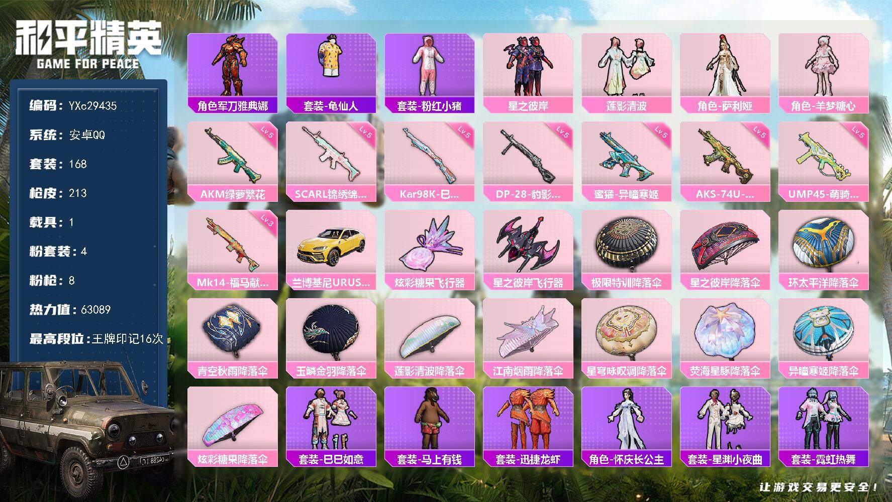 PX_2555458-??,满地铁天赋】YXc29435-【可二次】【因赛季更新游戏段付以上号为准!】 ,安卓Q-1载具4粉装8特效枪6热门168套装213枪皮,16印记,历史传奇王牌14星, 【1载具】,兰博SUV黄色, 【4粉装】,萨利娅,羊梦糖心,莲影清波,星之彼岸, 【8特效枪】,SCAR-L-锦绣绵绵,(5级),AKS-74U-森灵之息,(5级),AKM-绿萝繁花,(5级),Kar98K-巳巳如意,(5级),DP-28-豹影疾电,(5级),蜜獾-异瞳寒姬,(5级),Mk14-福马献瑞,(3级),UMP45-萌骑冒险,(5级), 【6热门】,龟仙人,浪漫假日,粉红小猪,破蛋小黄鸡,极速红龙,军刀雅典娜, 【1飞行器】,星之彼岸飞行器,