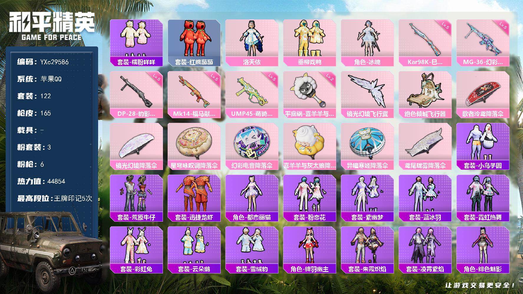 PX_2555433-??依,番茄,咩咩】YXc29586-【无二次协助处理】【因赛季更新游戏段付以上号为准!】 ,苹果Q-3粉装6特效枪11热门122套装165枪皮,,5印记,历史超级王牌2星, 【3粉装】,冰魄,洛天依,垂柳戏鸭, 【6特效枪】,Kar98K-巳巳如意,(5级),MG-36-幻彩电音,(5级),DP-28-豹影疾电,(5级),Mk14-福马献瑞,(5级),UMP45-萌骑冒险,(5级),平底锅-喜羊羊与灰太狼,(2级), 【11热门】,红熊茄茄,青涩年华,糯粉咩咩,暗夜契约,团圆交子,瑞龙福将,水银刺客,静谧青瓷,破蛋小黄鸡,M762-奇异狩猎者,M762-瑞龙福将, 【2飞行器】,绝色倾城飞行器,镜光幻境飞行翼, 【2头盔】,深海小丑鱼头盔,花间之火头盔,