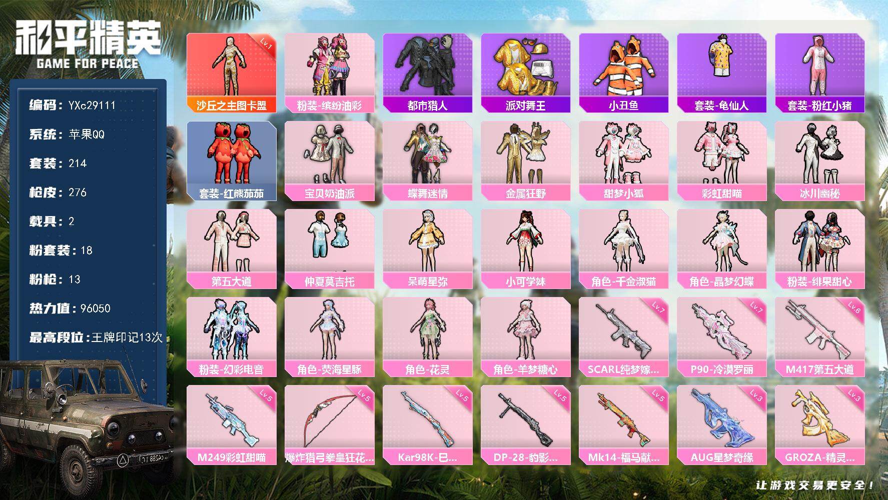 PX_2555444-??盟,都市,金鞋,保时捷,猪妹,小狐,3级AUG星梦,番茄,满地铁天赋】YXc29111-【无二次】【因赛季更新游戏段付以上号为准!】 ,苹果Q-1红装3稀有2载具18粉装13特效枪24热门214套装276枪皮,13印记,历史传奇王牌21星, 【1红装】,沙丘之主-图卡盟,(1级), 【3稀有】,都市猎人,派对舞王,派对舞王(金靴子), 【2载具】,保时捷Panamera(星辰紫),晶梦灵驹, 【18粉装】,蝶舞迷情,宝贝奶油派,千金淑猫,荧海星豚,花灵,绯果甜心,羊梦糖心,呆萌星弥,小可学妹,金属狂野,晶梦幻蝶,幻彩电音,缤纷油彩,仲夏莫吉托,第五大道,冰川幽秘,甜梦小狐,彩虹甜喵, 【13特效枪】,SCAR-L-纯梦嫁纱,(7级),P90-冷漠罗丽,(7级),P90-沙丘之主,(1级),Kar98K-巳巳如意,(5级),DP-28-豹影疾电,(5级),AUG-星梦奇缘,(3级),M200-梦海之灵,(2级),GROZA-精灵之光,(3级),M417-第五大道,(6级),M249-彩虹甜喵,(5级),信号枪-金乌曜日,(2级),Mk14-福马献瑞,(5级),爆炸猎弓-拳皇·狂花道,(5级), 【24热门】,小丑鱼,奇迹天团,龟仙人,红熊茄茄,雪山精英,晶辉守护,呆萌铁蟹,万圣娃娃,鹰眼刺客,星兔领航员,蔷薇魔法师,兔兔白日梦,恶魔喵喵,银碳小老虎,奇迹天团,迅捷狂鲨,神秘黑猫,粉红小猪,漫步者,破蛋小黄鸡,黑色刀锋,弄潮海豚,M416-魔法学院,AUG-魔法学院, 【3飞行器】,春暖花开飞行器,幻海精灵飞行器,梦幻舞会飞行器, 【3头盔】,梦幻火箭头盔,金风玉露头盔,深海小丑鱼头盔, 【5背包】,精灵迷巫背包,折纸暴龙背包,甜心宝贝背包,深海小丑鱼背包,神秘黑猫背包,