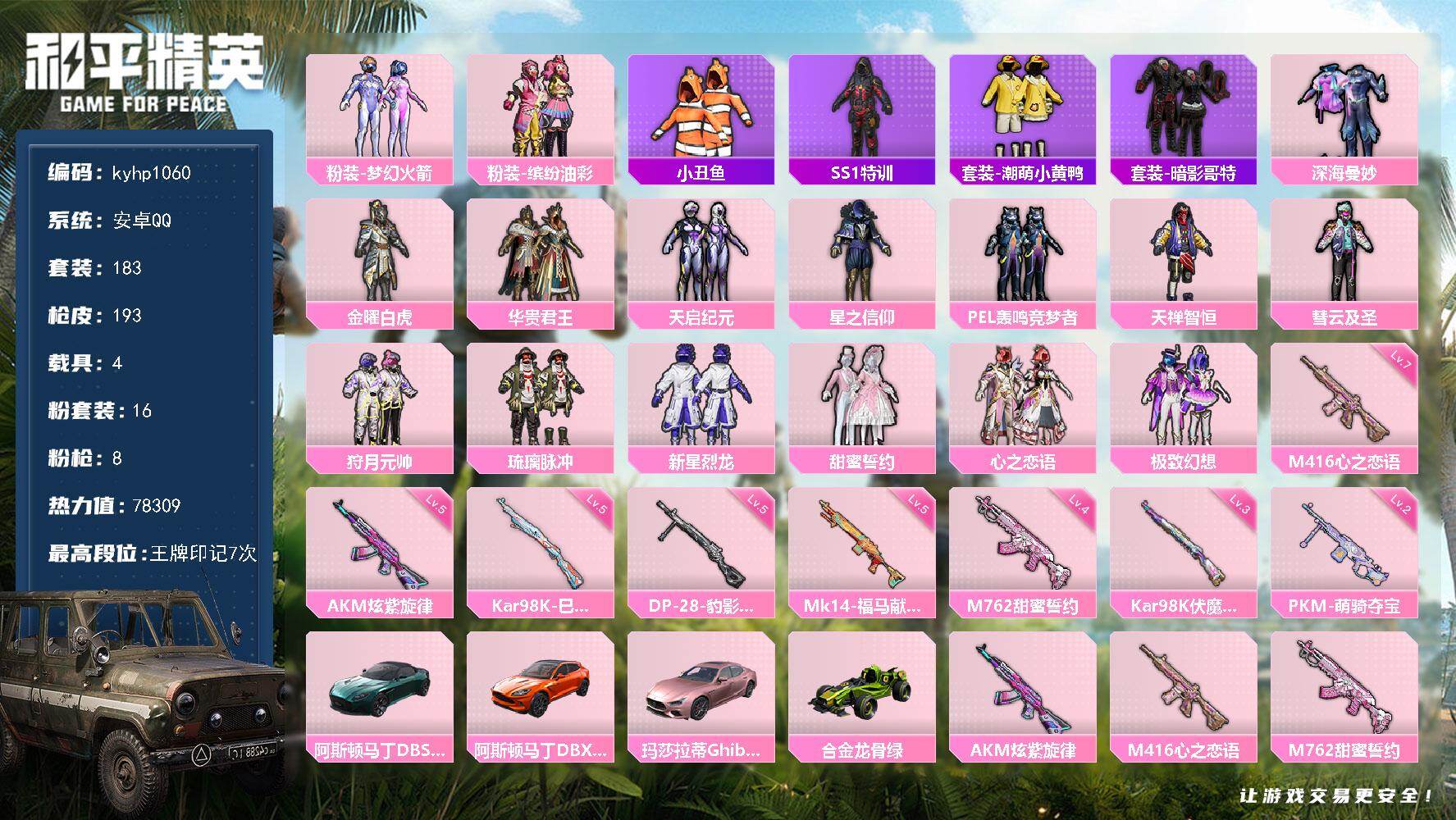 PX_2552779-,安卓手Q-14王牌印记-2红装-21粉装-19特效枪-7载具-热力值-213套装-316枪皮-1卓越印记 【2红装】沙丘之主-图卡盟/4级,宇宙意志-塞卢姆/2级 【21粉装】套装-瑰丽时代,套装-放客神游,套装-第五大道,角色-2号机款机体服,套装-宝贝奶油派,角色-呆萌星弥,角色-洛天依,角色-千金淑猫,套装-甜心巧克力,角色-智慧纱织,套装-音爆索尼克,角色-绯月迷踪,套装-木曜青龙,套装-蝶舞迷情,套装-梦幻火箭,套装-缤纷油彩,角色-冷漠罗丽,套装-怪诞乔克,套装-天使彩虹糖,套装-纯珍童话,套装-香水柠檬 【19特效枪】GROZA-镜光银凌/5级,AUG-圣斗士星矢/5级,蜜獾-荧海星豚/2级,DP-28-暗夜鎏金/5级,蜜獾-异瞳寒姬/2级,Mk14-盛世惊鸿/3级,DP-28-豹影疾电/5级,Mk14-福马献瑞/3级,M416-五爪金龙/5级,Kar98K-巳巳如意/5级,AKM-梦之光华/5级,P90-沙丘之主/3级,破片手榴弹-瓶中星球/5级,M416-风花雪月/1级,P90-金丰海韵/1级,SCAR-L-纯梦嫁纱/3级,ACE32-萌骑漫游/3级,UMP45-宇宙意志/3级,M416-墨龙九天/6级 【10稀有紫装】都市猎人,派对舞王,赤蝎幽灵,奇异狩猎者,暗影哥特,浪漫天命,胖达圆圆,明日香款战斗服,龟仙人,零款战斗服 【7稀有载具】玛莎拉蒂Ghibli(粉),星河领航(磐石银),宝马X6,M(曼岛绿),兰博基尼Aventador,SVJ(翡翠绿),时空跃影(星辉银),合金龙骨(蓝),护世瑞兽 【1僚机】僚机-萌兔起飞 【213稀有时装】图卡盟/4级,塞卢姆/2级,甜心巧克力,梦幻火箭,怪诞乔克,2号机款机体服,缤纷油彩,放客神游,第五大道,宝贝奶油派,天使彩虹糖,蝶舞迷情,洛天依,千金淑猫,绯月迷踪,木曜青龙,冷漠罗丽,智慧纱织,音爆索尼克,香水柠檬,纯珍童话,瑰丽时代,呆萌星弥,KSG追光队服,迅捷龙虾,都市猎人,浪漫天命,奇异狩猎者,龟仙人,暗影哥特,零款战斗服,明日香款战斗服,胖达圆圆,赤蝎幽灵,派对舞王,激萌罗小黑,狂沙舞者,萌趣咩咩,红熊茄茄,软萌银虎,鹿角斗士,龙魂突击队,极冰使者,小熊娃娃,异域银装,都市丽猫,绒宝小鹅,街头风暴,星途旅人,蜜桃派对,冰河战士,鱼渊荷华,创世·追猎,青团波波,大橘大利,燕燕于飞,战术大师,诡面顽熊,雏菊兔兔,糖糖葫芦,香桃花海,蝶变,巳巳如意,粉恋花,棉花软糖,午间小调,彩虹兔,时希公主,琴音绮想,乐音,极速光影,霓虹热舞,雪绒豹,玫纹锢梦,黯羽织刑,画境星梦,朱霞炽焰,狂鲨锋刃,游乐,凌霄紫焰,炫彩糖果,萌鸡速递,元气之梦,书海巡游,风迹短诗,薄荷星砂,秘语星愿,云朵鹅,顶瓜瓜,雪国风尚,绒绒粉兔,蓝冰羽,恋语绒绒,青翼流星,紫幽梦,马上来财,SS35特训,SS29特训,萝兰蝴蝶,SS31特训,SS33特训,SS32特训,暴风机械师,无暇誓言,时空追击者,SS36特训,焰鹰斗篷,军械专家,菲菲,福星高照,虎虎生威吉莉,夏日音浪,龙的传人,魔力冰咖,甜梦熊熊,青玉碎影,萌黄之夏,SS37特训,SS28特训,沁蓝冰爽,白色伏地魔,阳光火鸡,红剪之缘,绯格组合,涂山之恋,SS26特训,漫步者,空岛之星,荧惑魅影,元气发射,SS34特训,竞技名士,浑天鲲鹏,SS30特训,长空猛禽,特战装甲,西部风情,旭日情侣,甜蜜告白,街头潮人,冷焰舞者,惊鸿侠骨,甜心亚梦,虚音幻奏,幻世战舞者,香草威化,青涩时光,牛气满满,娇憨猪猪,春日漫步,狙击之神,麻辣教官,鹰眼刺客,福马献瑞,冰冻风暴,玲珑侠影,完美偶像,幽夜迷踪,俏皮奶喵,潮流游乐家,暗金炫舞,神秘领域,耀眼新星,坚韧舞者,海岛探路者,和煦暖阳,霓虹街区,森林游猎者,田园牧歌,都市魅力,轻风白浪,特种颜团子,沙漠兵团,探宝勇士,SS27特训,牛气冲天,SS18特训,飞行日记,SS17特训,金耀舞者,绚烂繁星,熠彩粉晶,金戈铁马,SS19特训,光之冒险,SS20特训,SS21特训,玉兔迎春,SS22特训,SS23特训,呆萌铁蟹,缤纷果语,滨海厨神,香榭午后,天籁歌者,神气柴柴,灵蜜圈圈,妙红点点,幻彩翩翩,格斗先锋,幻羽潜行,海盐绵绵冰,老实芭蕉,王牌教练,荣耀,柠萌假日,SS24特训,鹤鸣,懵萌河马,短笛,SS25特训,锦衣飞扬,万圣娃娃 【315稀有枪械】M416-墨龙九天/6级,P90-沙丘之主/3级,UMP45-宇宙意志/3级,Mk14-盛世惊鸿/3级,M416-五爪金龙/5级,M416-风花雪月/1级,AKM-梦之光华/5级,SCAR-L-纯梦嫁纱/3级,GROZA-镜光银凌/5级,AUG-圣斗士星矢/5级,Kar98K-巳巳如意/5级,Mk14-福马献瑞/3级,P90-金丰海韵/1级,DP-28-豹影疾电/5级,DP-28-暗夜鎏金/5级,蜜獾-异瞳寒姬/2级,蜜獾-荧海星豚/2级,ACE32-萌骑漫游/3级,破片手榴弹-瓶中星球/5级,DBS-乌木金纹,Famas-墨龙九天,AMR-墨龙九天,SCAR-L-海盐豹豹,GROZA-海盐豹豹,SLR-极冰使者,野牛-雏菊兔兔,Mk14-冰河战士,平底锅-雏菊兔兔,M762-雏菊兔兔,Mini14-雏菊兔兔,M200-宇宙意志,短管霰弹-宇宙意志,R1895-雏菊兔兔,AC-VAL-宇宙意志,Mk47-极冰使者,M416-极冰使者,UZI-冰河战士,M16A4-冰河战士,MK20-H-乌木金纹,DBS-风迹短诗,莫辛纳甘-风迹短诗,Win94-乌木金纹,MK12-风迹短诗,MK12-乌木金纹,SVD-冷漠罗丽,撬棍-冷漠罗丽,破片手榴弹-爆破雪人,PKM-紫幽梦,MG3-霓彩脉冲,DBS-幻彩电音,ACE32-画境星梦,SCAR-L-冷漠罗丽,M1加兰德-画境星梦,MP5K-画境星梦,Mk14-紫幽梦,M24-幻彩电音,蜜獾-乌木金纹,M762-云朵鹅,S1897-紫幽梦,SVD-云朵鹅,P92-紫幽梦,SPAS-12-狂鲨锋刃,Mk14-绒绒粉兔,M417-玩趣呆呆,MK20-H-狂鲨锋刃,AUG-冰晶雪宝,铝热弹-炫彩糖果,UZI-炫彩糖果,大砍刀-像素花束,撬棍-绯月迷踪,AA12-G-画境星梦,平底锅-画境星梦,M249-冰晶雪宝,SCAR-L-绯月迷踪,Mk47-风迹短诗,JS9-凌霄紫焰,MG-36-凌霄紫焰,平底锅-紫幽梦,破片手榴弹-海盐豹豹,UMP45-海盐豹豹,ARX-凌霄紫焰,AKS-74U-乌木金纹,蜜獾-风迹短诗,P92-凌霄紫焰,AMR-喜羊羊与灰太狼,F
