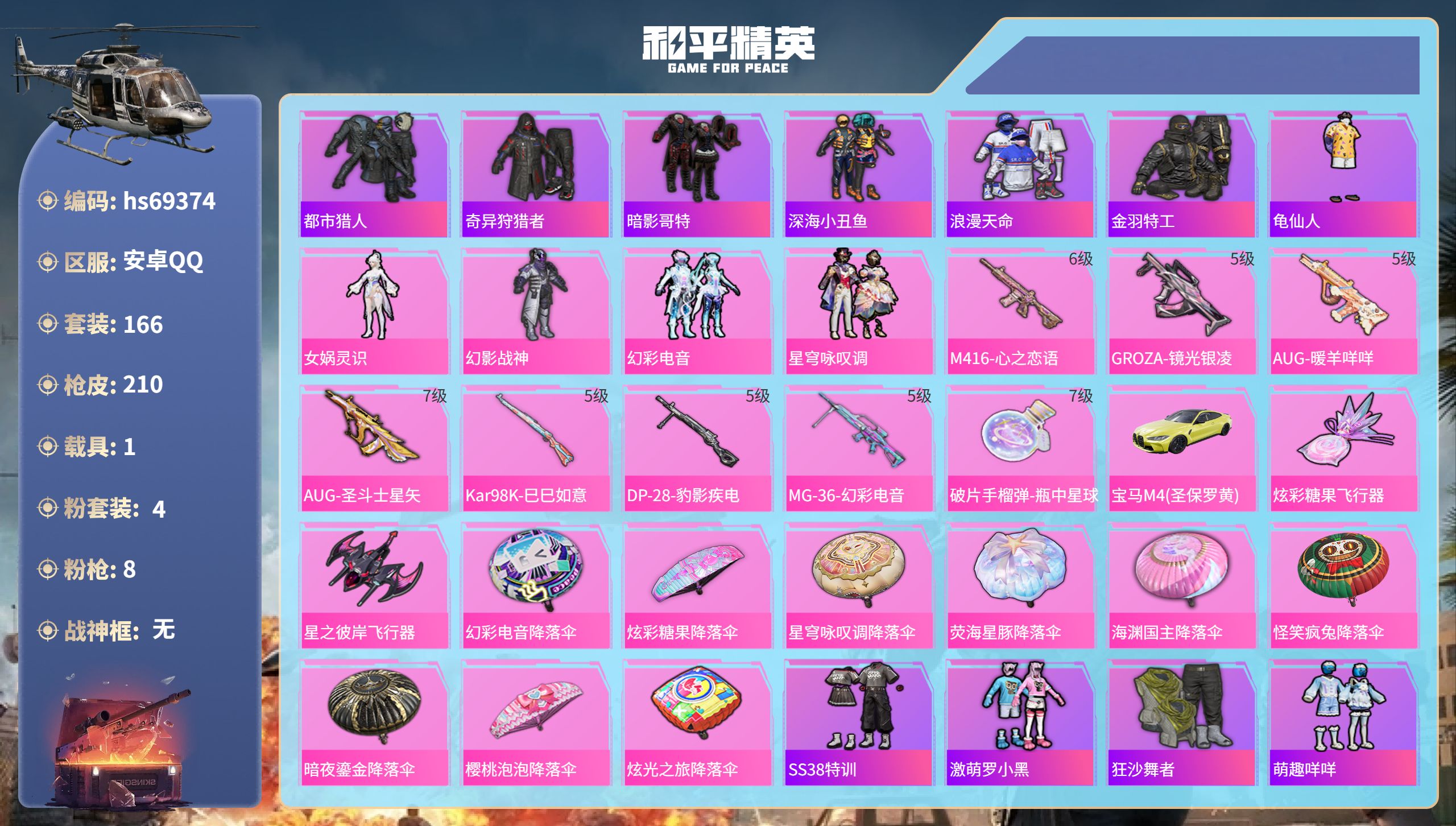 PX_2563371-,安卓手Q-7王牌印记-4粉装-8特效枪-1载具-62382热力值-166套装-210枪皮-2卓越印记-1传奇印记 【4粉装】角色-女娲灵识,套装-幻彩电音,套装-幻影战神,套装-星穹咏叹调 【8特效枪】DP-28-豹影疾电/5级,Kar98K-巳巳如意/5级,M416-心之恋语/6级,MG-36-幻彩电音/5级,AUG-圣斗士星矢/7级,AUG-暖羊咩咩/5级,破片手榴弹-瓶中星球/7级,GROZA-镜光银凌/5级 【7稀有紫装】都市猎人,奇异狩猎者,暗影哥特,深海小丑鱼,浪漫天命,金羽特工,龟仙人 【1稀有载具】宝马M4(圣保罗黄) 【166稀有时装】女娲灵识,幻影战神,幻彩电音,星穹咏叹调,SS38特训,都市猎人,浪漫天命,奇异狩猎者,龟仙人,暗影哥特,深海小丑鱼,金羽特工,激萌罗小黑,狂沙舞者,萌趣咩咩,龙魂突击队,异域银装,蜜桃派对,鱼渊荷华,创世·追猎,青团波波,大橘大利,燕燕于飞,风玲,战术大师,雏菊兔兔,糖糖葫芦,蝶变,巳巳如意,粉恋花,元素星魂,彩虹兔,极速光影,霓虹热舞,雪绒豹,星影赞美诗,狂鲨锋刃,夜瞳黯灵,游乐,炫彩糖果,萌鸡速递,元气之梦,薄荷星砂,云朵鹅,顶瓜瓜,雪国风尚,蓝冰羽,恋语绒绒,青翼流星,紫幽梦,SS35特训,SS29特训,萝兰蝴蝶,SS31特训,SS33特训,SS32特训,SS16特训,SS36特训,军械专家,福星高照,精密机核,雪兔飞飞,都市漫游者,虎虎生威吉莉,龙的传人,萌黄之夏,SS37特训,SS28特训,特训学院,猎鹰,青年教官,橘黑制服,红色运动,黄色运动,蓝色运动,黄色伏地魔,白色伏地魔,酒红色名流,湖蓝色名流,黄色名流,酷潮明星,绯格组合,涂山之恋,SS26特训,空岛之星,黑色伏地魔,黎明保卫者,炫蓝之夏,SS34特训,骑行爱好者,竞技名士,蓝色守护者,深蓝色名流,猛禽,雨林探路者,SS30特训,长空猛禽,旭日情侣,甜蜜告白,街头潮人,冷焰舞者,惊鸿侠骨,魅力单车,灼焰舞者,幻世战舞者,战地督导,特殊使命,青涩时光,牛气满满,娇憨猪猪,冰川特警,龙腾端午,极速红龙,狙击之神,麻辣教官,鹰眼刺客,完美偶像,人气偶像,幻影武者,破蛋小黄鸡,蓝彩潮人,绮丽涂鸦,耀眼新星,竞技达人朋克,野性战心,海岛探路者,破晓战魂,和煦暖阳,霓虹街区,田园牧歌,都市魅力,萌趣颜团子,轻风白浪,特种颜团子,耀粉歌者,SS27特训,牛气冲天,飞行日记,SS17特训,蓝调潮人,SS19特训,光之冒险,SS20特训,血色贵族,SS21特训,玉兔迎春,SS22特训,SS23特训,缤纷果语,滨海厨神,神气柴柴,忍者信条,格斗先锋,海盐绵绵冰,吉莉礼服,王牌教练,荣耀,暗夜之虎,柠萌假日,SS24特训,鹤鸣,懵萌河马,SS25特训,锦衣飞扬,黑夜传说,SS15特训 【211稀有枪械】M416-心之恋语/6级,GROZA-镜光银凌/5级,AUG-暖羊咩咩/5级,AUG-圣斗士星矢/7级,Kar98K-巳巳如意/5级,DP-28-豹影疾电/5级,MG-36-幻彩电音/5级,破片手榴弹-瓶中星球/7级,DBS-乌木金纹,P1911-创世·救赎,Vector-创世·救赎,SCAR-L-海盐豹豹,野牛-雏菊兔兔,Mk14-冰河战士,平底锅-雏菊兔兔,M762-雏菊兔兔,Mini14-雏菊兔兔,R1895-雏菊兔兔,撬棍-突变脉冲,UZI-冰河战士,M16A4-冰河战士,MK20-H-乌木金纹,MK20-H-圣域龙灵,Mini14-鸡智如我,AKM-绿洲时空,Win94-乌木金纹,MK12-乌木金纹,G36C-桃粉嫣然,PKM-紫幽梦,MG3-霓彩脉冲,DBS-幻彩电音,R45-幻彩电音,Mk14-紫幽梦,M24-幻彩电音,蜜獾-乌木金纹,M762-云朵鹅,S1897-紫幽梦,SVD-云朵鹅,P92-紫幽梦,SPAS-12-狂鲨锋刃,MK20-H-狂鲨锋刃,铝热弹-炫彩糖果,UZI-炫彩糖果,大砍刀-像素花束,平底锅-紫幽梦,破片手榴弹-海盐豹豹,UMP45-海盐豹豹,平底锅-宁雨蝶,AKS-74U-乌木金纹,AKM-涂鸦街区,Famas-乌木金纹,Famas-霓彩脉冲,SPAS-12-云朵鹅,M249-无面战甲,破片手榴弹-拽到爆炸,S1897-糯团青竹,Mk14-薄荷星砂,AKS-74U-鸡智如我,沙漠之鹰-云朵鹅,烟雾弹-冰氧夏日,Mk14-紫晶流影,MG-36-薄荷星砂,大砍刀-云朵鹅,PKM-啾咪啾咪,SLR-霓彩脉冲,SCAR-L-彩虹符号,AUG-紫晶流影,S12K-霓彩脉冲,AMR-鸡智如我,AKM-霓彩脉冲,M416-红色方程式,M416-蓝色火焰,M416-糯团青竹,AKM-影袭,AKM-星兔领航员,AKM-彩虹符号,AKM-破晓战魂,AKM-龙的传人,AKM-2P战斗服款,AKM-灼热熔岩,AKM-虎虎生威,AKM-萌趣颜团子,SCAR-L-红色方程式,SCAR-L-玉兔迎春,SCAR-L-黄金龙骨,M16A4-红色方程式,M16A4-蓝色火焰,M16A4-幻世战舞者,GROZA-影袭,GROZA-田园牧歌,GROZA-懵萌河马,GROZA-彩虹符号,AUG-耀粉歌者,QBZ-未来歌姬,QBZ-彩虹符号,M762-天星战神,M762-天降萌叽,Mk47-百万伏特,Mk47-乌木金纹,Mk47-洛神天依,G36C-乌木金纹,G36C-懵萌河马,AC-VAL-天降萌叽,AC-VAL-乌木金纹,蜜獾-天降萌叽,蜜獾-娇憨猪猪,Kar98K-乌木金纹,Kar98K-红色方程式,Kar98K-彩虹符号,M24-乌木金纹,M24-影袭,M24-炫彩节奏,AWM-黄金龙骨,莫辛纳甘-乌木金纹,莫辛纳甘-懵萌河马,AMR-乌木金纹,M200-惊鸿侠骨,SKS-迅猛狂鲨,SKS-糯团青竹,SKS-炫彩节奏,VSS-田园牧歌,VSS-彩虹符号,Mini14-耀粉歌者,Mini14-炫彩节奏,Mk14-暗星紫秘,Mk14-乌木金纹,SLR-娇憨猪猪,M417-惊鸿侠骨,MK20-H-莲影清波,UZI-炫彩节奏,UZI-红色方程式,UZI-娇憨猪猪,UZI-啾咪啾咪,UMP45-涂山之恋,UMP45-蓝色火焰,UMP45-生命誓言,UMP45-海渊国主,Vector-生命誓言,Vector-彩虹符号,Vector-田园牧歌,汤姆逊-耀粉歌者,汤姆逊-天降萌叽,汤姆逊-幻影战神,汤姆逊-炫彩节奏,野牛-乌木金纹,野牛-夜灯,MP5K-乌木金纹,P90-乌木金纹,P90-玩趣呆呆,S686-彩虹符号,S686-红色方程式,S686-生命誓言,S1897-乌木金纹,S12K-守护天翼,S12K-破晓战魂,S12K-玩趣呆呆,S12K-幻影战神,S12K-娇憨猪猪,S12K-垂柳戏鸭,DBS-彩虹符号,SPAS-12-田园牧歌,M249-破晓战魂,M249-彩虹符号,M249-糯团青竹,M249-乌木金纹,DP-28-旋转彩虹,MG3-惊鸿侠骨,MG3-幻世战舞者,MG3-乌木金纹,PKM-懵