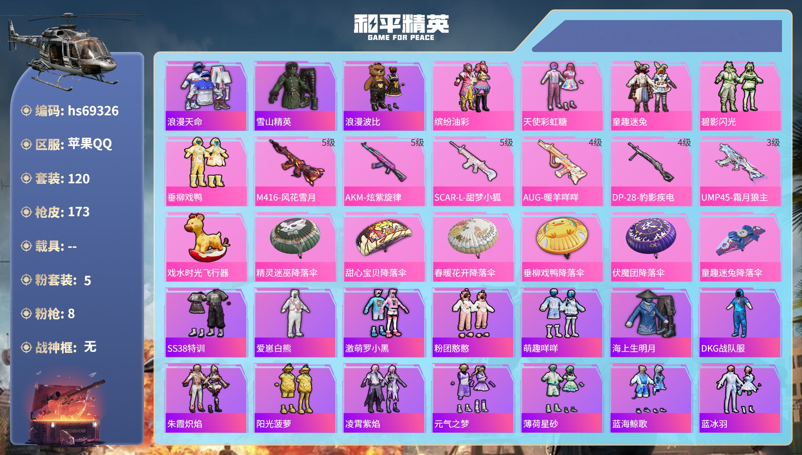 PX_2563370-,苹果手Q-5王牌印记-5粉装-8特效枪-52856热力值-120套装-173枪皮 【5粉装】套装-童趣迷兔,套装-缤纷油彩,套装-天使彩虹糖,套装-碧影闪光,套装-垂柳戏鸭 【8特效枪】DP-28-鸢尾珑雾/4级,DP-28-豹影疾电/4级,破片手榴弹-贪吃小熊/4级,AKM-炫紫旋律/5级,SCAR-L-甜梦小狐/5级,UMP45-霜月狼主/3级,AUG-暖羊咩咩/4级,M416-风花雪月/5级 【3稀有紫装】浪漫天命,雪山精英,浪漫波比 【119稀有时装】缤纷油彩,天使彩虹糖,童趣迷兔,碧影闪光,垂柳戏鸭,SS38特训,浪漫天命,雪山精英,浪漫波比,爱崽白熊,激萌罗小黑,粉团憨憨,萌趣咩咩,海上生明月,DKG战队服,朱霞炽焰,阳光菠萝,凌霄紫焰,元气之梦,薄荷星砂,蓝海鲸歌,蓝冰羽,恋语绒绒,紫幽梦,迷域探索者,机械英豪,机械征服者,SS5特训,冰原使者,SS33特训,SS32特训,暗夜傀儡,拳皇97八神庵,蔷薇魔法师,黑色刀锋,福星高照,虎虎生威吉莉,夏日音浪,清香五月粽,SS8特训,萌黄之夏,SS37特训,热血青春,SS9特训,白月香洋装,酷潮明星,绯格组合,SS34特训,骑行爱好者,竞技名士,蓝色守护者,长空猛禽,神奈川冲浪里,竞技勇士朋克,特战装甲,灰色格斗者,甜蜜告白,魅力单车,雪山征服者,奶芙汪汪,恶魔喵喵,丛林猎人,缤纷假日,传奇侦探,青春校园,牛气满满,娇憨猪猪,SS11特训,人气偶像,SS4特训,破蛋小黄鸡,疯狂小兔子,圣诞大吉,凛冬战士,北国孤狼,SS6特训,炽焰拳师,绮丽涂鸦,格斗专家,耀眼新星,坚韧舞者,奇迹天团,竞技达人朋克,跃动心情,SS7特训,核芯基因,精神漫游,霓虹街区,都市魅力,萌趣颜团子,SS10特训,沙漠兵团,耀粉歌者,风华少年志,SS12特训,牛气冲天,SS18特训,冰凉西瓜,治愈之星,清新柠檬,科技之星,SS17特训,熠彩粉晶,异彩先驱,霓虹极客,装甲骑士,SS21特训,玉兔迎春,莱茵河畔,灿烂千阳,SS14特训,妙红点点,幻彩翩翩,老实芭蕉,刚毅裁决者,王牌教练,柠萌假日,SS15特训,深蓝冒险家 【164稀有枪械】M416-风花雪月/5级,AKM-炫紫旋律/5级,SCAR-L-甜梦小狐/5级,AUG-暖羊咩咩/4级,DP-28-豹影疾电/4级,PKM-紫幽梦,Mk14-紫幽梦,蜜獾-乌木金纹,S1897-紫幽梦,P92-紫幽梦,ARX-像素花束,JS9-凌霄紫焰,MG-36-凌霄紫焰,平底锅-紫幽梦,ARX-凌霄紫焰,AKS-74U-乌木金纹,AKM-涂鸦街区,P92-凌霄紫焰,Famas-乌木金纹,平底锅-凌霄紫焰,烟雾弹-冰氧夏日,AKS-74U-粉粉喵呜,S686-雪月幻音,M416-魔法学院,M416-红色方程式,M416-神秘黑猫,M416-乌木金纹,M416-糯团青竹,AKM-夜灯,AKM-玉龙,AKM-灼热熔岩,AKM-虎虎生威,AKM-萌趣颜团子,AKM-霓虹街区,SCAR-L-红色方程式,SCAR-L-玉兔迎春,SCAR-L-乌木金纹,M16A4-机械英豪,M16A4-红色方程式,M16A4-生命誓言,GROZA-乌木金纹,GROZA-黑色刀锋,GROZA-异彩先驱,GROZA-治愈之星,GROZA-生命誓言,AUG-乌木金纹,AUG-耀粉歌者,AUG-凝视深渊,QBZ-乌木金纹,M762-拳皇97,M762-牛气冲天,M762-甜心宝贝,M762-天降萌叽,Mk47-乌木金纹,Mk47-妙红点点,G36C-不夜海上花,G36C-乌木金纹,G36C-金风玉露,AC-VAL-天降萌叽,蜜獾-垂柳戏鸭,蜜獾-娇憨猪猪,Kar98K-梦幻火箭,Kar98K-红色方程式,Kar98K-古堡领主,Kar98K-彩虹符号,Kar98K-勇闯险境,M24-冰封烈焰,M24-仲夏莫吉托,M24-治愈之星,AWM-天降萌叽,AWM-乌木金纹,AWM-不夜海上花,AWM-垂柳戏鸭,Win94-机械英豪,莫辛纳甘-乌木金纹,AMR-妙红点点,SKS-勇闯险境,SKS-夜灯,VSS-乌木金纹,VSS-黑色刀锋,VSS-荒野猎神,Mini14-金鼠迎春,Mini14-耀粉歌者,Mini14-乌木金纹,Mini14-异彩先驱,Mini14-春暖花开,Mk14-治愈之星,SLR-娇憨猪猪,QBU-不夜海上花,UZI-炫彩节奏,UZI-乌木金纹,UZI-红色方程式,UZI-娇憨猪猪,UZI-古堡领主,UZI-天降萌叽,UMP45-蓝色火焰,UMP45-生命誓言,UMP45-天启纪元,Vector-乌木金纹,Vector-生命誓言,Vector-音爆索尼克,Vector-彩虹符号,Vector-治愈之星,Vector-黑色刀锋,汤姆逊-耀粉歌者,汤姆逊-天降萌叽,汤姆逊-乌木金纹,汤姆逊-异彩先驱,汤姆逊-暗夜鎏金,汤姆逊-勇闯险境,野牛-乌木金纹,野牛-机械英豪,MP5K-异彩先驱,S686-冰封烈焰,S686-不夜海上花,S686-生命誓言,S1897-神秘黑猫,S1897-春暖花开,S1897-星之信仰,S1897-乌木金纹,S1897-天启纪元,S1897-勇闯险境,S12K-乌木金纹,S12K-娇憨猪猪,S12K-垂柳戏鸭,S12K-音爆索尼克,S12K-机械英豪,S12K-夜灯,DBS-第五大道,M249-拳皇97,M249-乌木金纹,M249-妙红点点,DP-28-甜心宝贝,DP-28-彩虹符号,DP-28-清新柠檬,DP-28-乌木金纹,MG3-第五大道,MG3-幻世战舞者,MG3-妙红点点,MG3-甜梦小狐,MG3-乌木金纹,P92-拳皇97,P1911-冰封烈焰,平底锅-缤纷糖果,平底锅-机械英豪,平底锅-勇闯险境,平底锅-治愈之星,平底锅-娇憨猪猪,平底锅-妙红点点,平底锅-拳皇97,平底锅-异彩先驱,平底锅-不夜海上花,平底锅-黑色刀锋,平底锅-冰封烈焰,撬棍-甜心宝贝,撬棍-绯红前夜,撬棍-传奇侦探,破片手榴弹-潮萌小黄鸭,Famas-霜月狼主,UMP45-霜月狼主/3级,P90-霜月狼主,大砍刀-霜月狼主,SLR-乌木金纹,VSS-香桃花海 【3稀有飞行器】戏水时光飞行器,霓虹街区飞行器,粉色滑翔尾迹 【29稀有背包】暗夜玫瑰背包(3级),垂柳戏鸭背包(3级),萌神柯基背包(3级),暖熊萌萌背包(3级),戏水时光背包(3级),凌霄紫焰背包(3级),薄荷星砂背包(3级),霜月狼主背包(3级),萌趣颜团子背包(3级),华贵君王背包(3级),不夜海上花背包(3级),甜心宝贝背包(3级),霓虹街区背包(3级),天启纪元背包(3级),治愈之星背包(3级),黑色刀锋背包(3级),PEC最牛战神背包(3级),冰封烈焰背包(3级),荒原烈焰背包(3级),SS11赛季背包(3级),SS10赛季背包(3级),金曜白虎背包(3级),SS8赛季背包(3级),春暖花开背包(3级),SS7赛季背包(3级),异彩先驱背包(3级),机