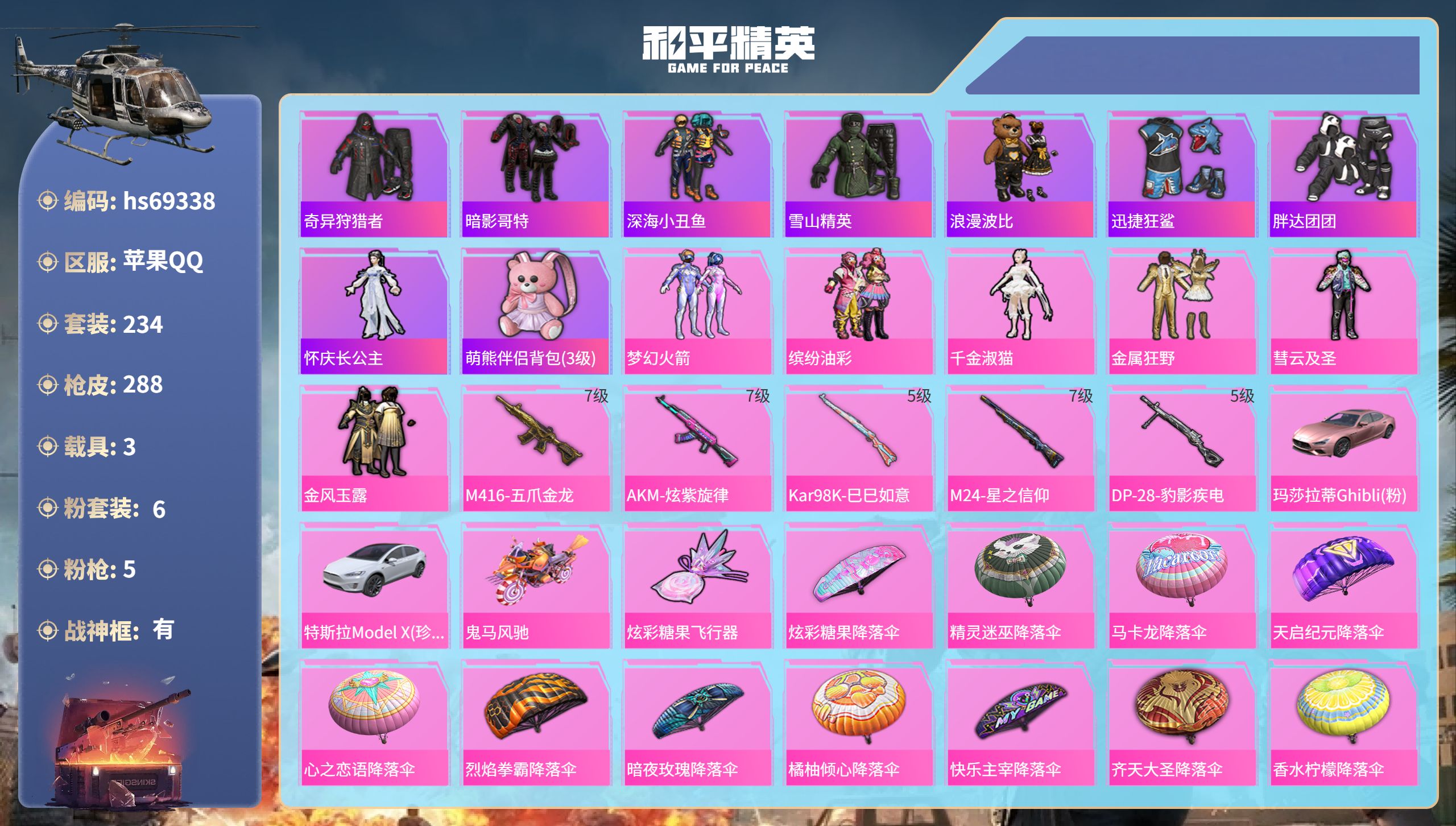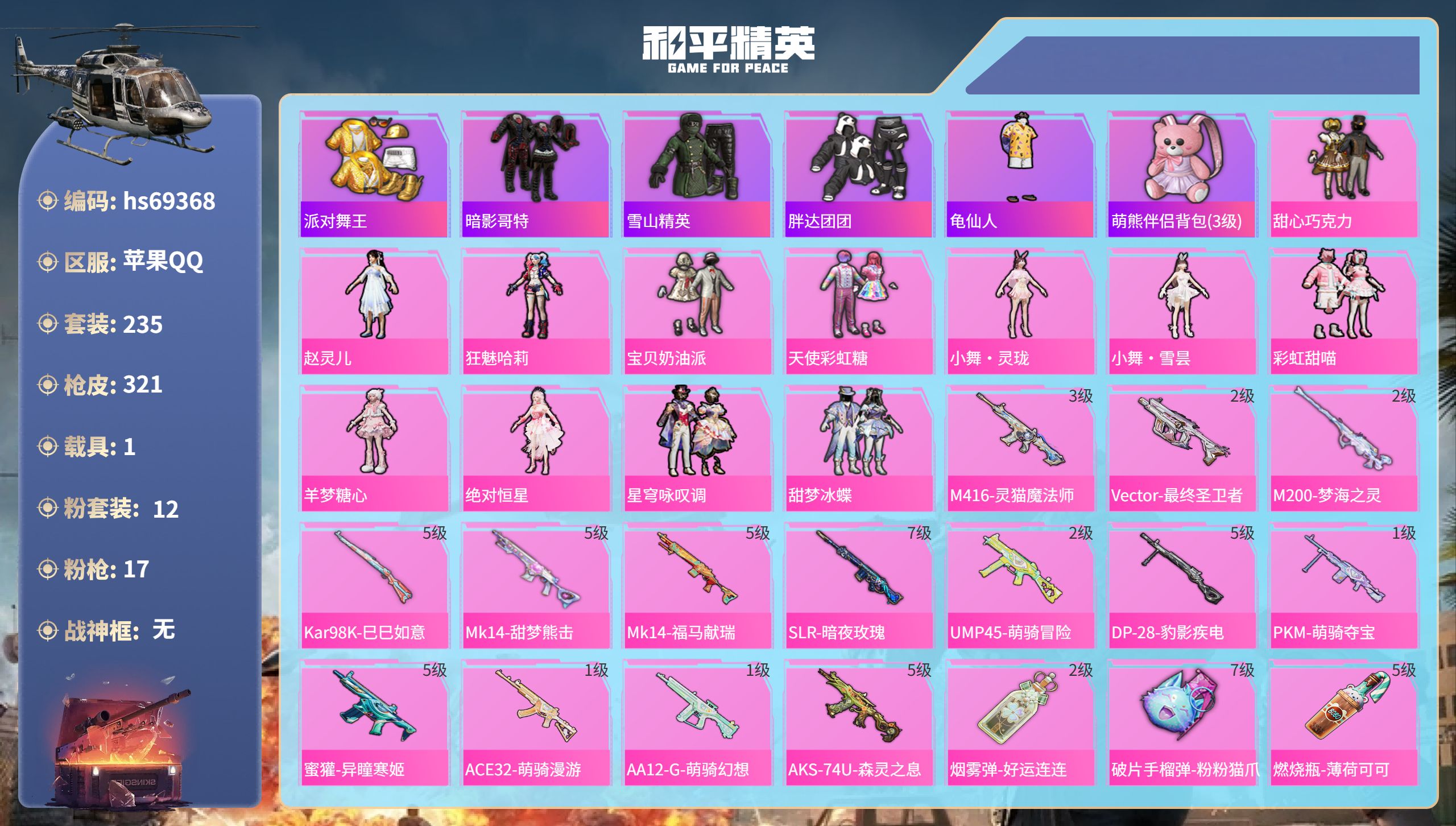 PX_2563373-,苹果手Q-10王牌印记-12粉装-17特效枪-1载具-99566热力值-235套装-321枪皮-3卓越印记 【12粉装】人物-小舞·雪昙,套装-彩虹甜喵,套装-星穹咏叹调,套装-天使彩虹糖,角色-狂魅哈莉,套装-甜梦冰蝶,女娲后裔-赵灵儿,套装-甜心巧克力,套装-宝贝奶油派,人物-小舞·灵珑,角色-绝对恒星,角色-羊梦糖心 【17特效枪】M416-灵猫魔法师/3级,PKM-萌骑夺宝/1级,AKS-74U-森灵之息/5级,Mk14-甜梦熊击/5级,Vector-最终圣卫者/2级,DP-28-豹影疾电/5级,烟雾弹-好运连连/2级,Kar98K-巳巳如意/5级,蜜獾-异瞳寒姬/5级,破片手榴弹-粉粉猫爪/7级,M200-梦海之灵/2级,Mk14-福马献瑞/5级,燃烧瓶-薄荷可可/5级,SLR-暗夜玫瑰/7级,UMP45-萌骑冒险/2级,ACE32-萌骑漫游/1级,AA12-G-萌骑幻想/1级 【6稀有紫装】派对舞王,暗影哥特,雪山精英,胖达团团,龟仙人,萌熊伴侣背包(3级) 【1稀有载具】暮色幽蹄 【1僚机】僚机-萌兔起飞 【234稀有时装】甜心巧克力,赵灵儿,狂魅哈莉,宝贝奶油派,天使彩虹糖,小舞·灵珑,小舞·雪昙,彩虹甜喵,羊梦糖心,绝对恒星,星穹咏叹调,甜梦冰蝶,TianBa追光队服,迅捷龙虾,SS38特训,胖达团团,龟仙人,雪山精英,暗影哥特,派对舞王,萌趣咩咩,星河浪客,异域银装,白糯汤圆,星渊小夜曲,街头风暴,鱼渊荷华,大橘大利,燕燕于飞,TianBa战队服,战术大师,智谋强哥,紫俏灵猫,马上有钱,巳巳如意,粉恋花,元素星魂,午间小调,琴音绮想,极速光影,霓虹热舞,雪绒豹,画境星梦,狂鲨锋刃,夜瞳黯灵,游乐,粉黛兰香,炫彩糖果,绯色魅影,萌鸡速递,小鸟芋圆,元气之梦,书海巡游,风迹短诗,混沌火种,薄荷星砂,秘语星愿,云朵鹅,顶瓜瓜,雪国风尚,蓝冰羽,恋语绒绒,孙斩天,青翼流星,紫幽梦,SS35特训,机械征服者,SS5特训,SS31特训,SS33特训,SS32特训,SS16特训,SS36特训,军械专家,金鼠迎春,炫光向阳,福星高照,都市漫游者,虎虎生威吉莉,夏日音浪,龙的传人,潮流炫酷,SS8特训,果汁能量,白熊同盟,萌黄之夏,SS37特训,SS28特训,特训学院,猎鹰,青年教官,橘黑制服,红色运动,黄色运动,蓝色运动,黄色伏地魔,飞驰魅影,白色伏地魔,音速流光,热血青春,登山爱好者,SS9特训,酒红色名流,阳光火鸡,湖蓝色名流,黄色名流,绯格组合,涂山之恋,伏击者,SS26特训,漫步者,空岛之星,霸义无双,黑色伏地魔,黎明保卫者,炫蓝之夏,SS34特训,骑行爱好者,雪鹰学院,竞技名士,蓝色守护者,深蓝色名流,猛禽,长空猛禽,竞技勇士朋克,特战装甲,旭日情侣,六六大吉,甜蜜告白,街头潮人,冷焰舞者,惊鸿侠骨,魅力单车,灼焰舞者,丛林猎人,传奇侦探,幻世战舞者,战地督导,特殊使命,牛气满满,娇憨猪猪,春日漫步,冰川特警,龙腾端午,夏雨游龙,滨海假日,极速红龙,狙击之神,红釉青花,麻辣教官,鹰眼刺客,雨过天青,福马献瑞,玲珑侠影,完美偶像,SS11特训,人气偶像,幻影武者,青春冒险家,破蛋小黄鸡,潮流游乐家,疯狂小兔子,圣诞大吉,特战英豪,白虎圣者,暗金炫舞,北国孤狼,蓝彩潮人,SS6特训,千禧之恋,拳皇97草薙京,炽焰拳师,绮丽涂鸦,格斗专家,耀眼新星,竞技达人朋克,野性战心,原初圣火,逆风勇士,海岛探路者,跃动心情,SS7特训,精神漫游,破晓战魂,霓虹街区,都市魅力,萌趣颜团子,SS10特训,沙漠兵团,烈火街头,耀粉歌者,探宝勇士,SS12特训,SS27特训,牛气冲天,SS18特训,SS13特训,飞行日记,SS17特训,竞技角斗士,瑞龙福将,团圆交子,异彩先驱,霓虹极客,空投萌叽,SS19特训,光之冒险,SS20特训,SS21特训,玉兔迎春,SS22特训,SS23特训,夏日倾情,飞狐塔尔斯,缤纷果语,滨海厨神,青涩年华,SS14特训,灵蜜圈圈,忍者信条,妙红点点,幻彩翩翩,格斗先锋,吉莉礼服,刚毅裁决者,王牌教练,荣耀,柠萌假日,SS24特训,鹤鸣,SS25特训,锦衣飞扬,黑夜传说,SS15特训 【319稀有枪械】M416-灵猫魔法师/3级,Vector-最终圣卫者/2级,M200-梦海之灵/2级,Kar98K-巳巳如意/5级,Mk14-甜梦熊击/5级,Mk14-福马献瑞/5级,SLR-暗夜玫瑰/7级,UMP45-萌骑冒险/2级,DP-28-豹影疾电/5级,PKM-萌骑夺宝/1级,蜜獾-异瞳寒姬/5级,ACE32-萌骑漫游/1级,AA12-G-萌骑幻想/1级,AKS-74U-森灵之息/5级,烟雾弹-好运连连/2级,破片手榴弹-粉粉猫爪/7级,燃烧瓶-薄荷可可/5级,AC-VAL-梦海之灵,UZI-梦海之灵,DBS-乌木金纹,DBS-风迹短诗,莫辛纳甘-风迹短诗,MG-36-绯果甜心,Win94-乌木金纹,MK12-风迹短诗,MK12-乌木金纹,破片手榴弹-爆破雪人,PKM-紫幽梦,汤姆逊-灵猫魔法师,MG3-霓彩脉冲,R45-幻彩电音,ACE32-画境星梦,M1加兰德-画境星梦,MP5K-画境星梦,Mk14-紫幽梦,蜜獾-乌木金纹,M762-云朵鹅,S1897-紫幽梦,SVD-云朵鹅,P92-紫幽梦,AWM-绿洲时空,SPAS-12-狂鲨锋刃,MK20-H-狂鲨锋刃,AUG-冰晶雪宝,铝热弹-炫彩糖果,UZI-炫彩糖果,UMP45-绿洲时空,ARX-像素花束,UMP45-极意拳锋,Mini14-绯穹魔姬,大砍刀-像素花束,TMP-9-萌萌史莱姆,AA12-G-画境星梦,G36C-星穹咏叹调,平底锅-画境星梦,短管霰弹-星穹咏叹调,M249-冰晶雪宝,Mk47-风迹短诗,平底锅-紫幽梦,燃烧瓶-甜梦桃焰,破片手榴弹-海盐豹豹,UMP45-海盐豹豹,M417-圣辉之星,AKS-74U-乌木金纹,AKM-涂鸦街区,电击枪-喜羊羊与灰太狼,蜜獾-风迹短诗,Famas-乌木金纹,Famas-霓彩脉冲,SPAS-12-云朵鹅,破片手榴弹-拽到爆炸,十字弩-异瞳寒姬,S1897-糯团青竹,信号枪-异瞳寒姬,Mk14-薄荷星砂,AKS-74U-鸡智如我,汤姆逊-智耀战神,沙漠之鹰-云朵鹅,烟雾弹-冰氧夏日,Mk14-紫晶流影,MG-36-薄荷星砂,SCAR-L-绿洲时空,大砍刀-云朵鹅,PKM-啾咪啾咪,SLR-圣穹绘梦,撬棍-双重狂想,S1897-荧海星豚,SLR-霓彩脉冲,平底锅-属我最6,SCAR-L-彩虹符号,蜜獾-绿洲时空,M16A4-最终圣