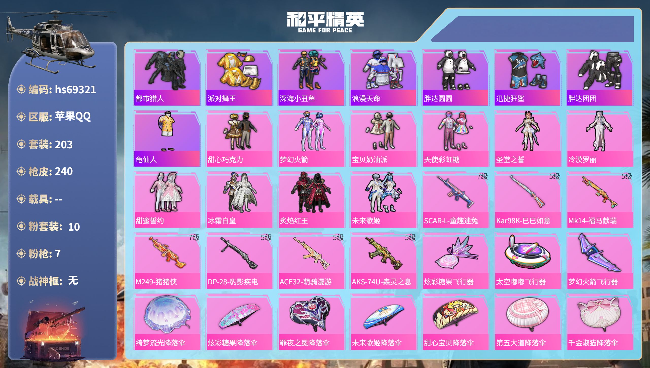 PX_2525247-,苹果手Q-28王牌印记-有战神框-14粉装-18特效枪-热力值-255套装-379枪皮-10卓越印记-6传奇印记 【14粉装】套装-仲夏莫吉托,套装-蓝莓炮弹,角色-初号机款机体服,套装-闪光银龙,套装-怪诞乔克,套装-PEL轰鸣竞梦者,角色-复仇流浪者,套装-炫光之旅,套装-梦幻火箭,套装-金丰海韵,套装-宝贝奶油派,套装-星之彼岸,角色-零号机款机体服,角色-2号机款机体服 【18特效枪】M416-电玩时刻/4级,Vector-环太平洋/5级,P90-能量风暴/6级,AUG-圣斗士星矢/7级,ACE32-萌骑漫游/5级,MG3-梦幻舞会/6级,M416-心之恋语/7级,AMR-炫光之旅/5级,GROZA-镜光银凌/5级,Mk14-福马献瑞/5级,AKM-炫紫旋律/5级,DP-28-豹影疾电/5级,SCAR-L-纯梦嫁纱/5级,Kar98K-巳巳如意/4级,DP-28-圣堂之誓/4级,AUG-暖羊咩咩/5级,UMP45-雪国精灵/7级,AKS-74U-信仰神谕/5级 【17稀有紫装】冥河战士,都市猎人,Mark.06,派对舞王,寒蝎幽灵,赤蝎幽灵,奇异狩猎者,暗影哥特,浪漫天命,雪山精英,明日香款战斗服,金羽特工,小丑鱼,龟仙人,零款战斗服,真理款战斗服,真嗣款战斗服 【256稀有时装】梦幻火箭,怪诞乔克,零号机款机体服,初号机款机体服,2号机款机体服,宝贝奶油派,蓝莓炮弹,复仇流浪者,PEL轰鸣竞梦者,炫光之旅,闪光银龙,金丰海韵,仲夏莫吉托,星之彼岸,都市猎人,浪漫天命,寒蝎幽灵,奇异狩猎者,龟仙人,Mark.06,雪山精英,暗影哥特,小丑鱼,金羽特工,零款战斗服,明日香款战斗服,赤蝎幽灵,冥河战士,派对舞王,萌熊伴侣,龙宫之主,粉团憨憨,萌趣咩咩,红熊茄茄,龙魂突击队,异域银装,街头风暴,冰河战士,鱼渊荷华,俏兔智灵,萌熊伴侣,青团波波,燕燕于飞,战术大师,真理款战斗服,诡面顽熊,真嗣款战斗服,雏菊兔兔,马上有钱,糖糖葫芦,薰款战斗服,时希公主,琴音绮想,雪绒豹,画境星梦,朱霞炽焰,狂鲨锋刃,凌霄紫焰,炫彩糖果,绯色魅影,萌鸡速递,薄荷星砂,云朵鹅,顶瓜瓜,冰公主,雪国风尚,蓝冰羽,青翼流星,紫幽梦,SS35特训,迷域探索者,机械英豪,机械征服者,SS29特训,萝兰蝴蝶,SS31特训,SS33特训,SS32特训,SS16特训,暴风机械师,时空追击者,星辰守护者,SS36特训,焰鹰斗篷,暗夜傀儡,红酒骑士,英勇保护者,军械专家,黑色刀锋,爆裂葡萄,炫光向阳,福星高照,暗夜契约,都市漫游者,虎虎生威吉莉,夏日音浪,龙的传人,军刀雅典娜,潮流炫酷,SS8特训,众神之王,智慧之神,果汁能量,白熊同盟,萌黄之夏,黄色格斗者,SS37特训,海滨突袭者,超能拳王,摇滚狂鲨,恶魔宝贝,黄色运动,飞驰魅影,音速流光,热血青春,冰川格斗者,SS9特训,白月香洋装,阳光火鸡,湖蓝色名流,丝绸行者,酷潮明星,绯格组合,SS26特训,薄荷蓝莓,空岛之星,热情海星,黑色伏地魔,纯真浪花,SS34特训,竞技名士,蓝色守护者,浑天鲲鹏,猛禽,长空猛禽,竞技勇士朋克,特战装甲,战地菁英,怒火燎原,惊鸿侠骨,魅力单车,春光漫游,猎梦纪元,丛林猎人,甜心亚梦,虚音幻奏,传奇侦探,贵族骑装,幻世战舞者,甜蜜菠萝,青春校园,暖心熊熊,牛气满满,迎春赐吉,娇憨猪猪,春日漫步,冰川特警,龙腾端午,燃烧卡路里,滨海假日,极速红龙,狙击之神,红釉青花,雨过天青,沙暴袭击者,完美偶像,SS11特训,幻影武者,青春冒险家,暖心橘喵,破蛋小黄鸡,潮流游乐家,快闪甜心,白虎圣者,北国孤狼,SS6特训,拳皇97草薙京,炽焰拳师,绮丽涂鸦,格斗专家,耀眼新星,野性战心,原初圣火,逆风勇士,跃动心情,SS7特训,核芯基因,精神漫游,霓虹街区,田园牧歌,萌趣颜团子,轻风白浪,SS10特训,特种颜团子,沙漠兵团,镭射皇者,风华少年志,探宝勇士,SS12特训,暗黑裁决,SS27特训,牛气冲天,迅捷之星,SS18特训,治愈之星,银白舞王,科技之星,SS13特训,飞行日记,SS17特训,瑞龙福将,团圆交子,金耀舞者,熠彩粉晶,缤纷焰火,异彩先驱,霓虹极客,空投萌叽,SS19特训,SS20特训,SS21特训,弄潮海豚,梦起落英,深海梦境,SS22特训,星河入梦,SS23特训,夏日倾情,甜蜜熊情侣,缤纷果语,莱茵河畔,香榭午后,SS14特训,天籁歌者,神气柴柴,灵蜜圈圈,妙红点点,捷德奥特曼,幻彩翩翩,格斗先锋,幻羽潜行,海盐绵绵冰,吉莉礼服,王牌教练,柠萌假日,SS24特训,鹤鸣,暖风夏荷,绚紫流光,懵萌河马,SS25特训,快乐星愿,锦衣飞扬,星梦畅游,SS15特训,深蓝冒险家 【380稀有枪械】M416-心之恋语/7级,M416-电玩时刻/4级,AKM-炫紫旋律/5级,SCAR-L-纯梦嫁纱/5级,GROZA-镜光银凌/5级,AUG-暖羊咩咩/5级,AUG-圣斗士星矢/7级,Kar98K-巳巳如意/4级,AMR-炫光之旅/5级,Mk14-福马献瑞/5级,UMP45-雪国精灵/7级,Vector-环太平洋/5级,P90-能量风暴/6级,DP-28-豹影疾电/5级,DP-28-圣堂之誓/4级,MG3-梦幻舞会/6级,ACE32-萌骑漫游/5级,AKS-74U-信仰神谕/5级,QBZ-纯真浪花,AWM-纯真浪花,汤姆逊-纯真浪花,DBS-乌木金纹,AA12-G-纯真浪花,平底锅-纯真浪花,DBS-创世·救赎,GROZA-海盐豹豹,野牛-雏菊兔兔,Mk14-冰河战士,平底锅-雏菊兔兔,M762-雏菊兔兔,Mini14-雏菊兔兔,R1895-雏菊兔兔,UZI-冰河战士,M16A4-冰河战士,MK20-H-乌木金纹,Win94-乌木金纹,MK12-乌木金纹,撬棍-冷漠罗丽,PKM-紫幽梦,ACE32-画境星梦,M1加兰德-画境星梦,MP5K-画境星梦,Mk14-紫幽梦,蜜獾-乌木金纹,M762-云朵鹅,S1897-紫幽梦,SVD-云朵鹅,P92-紫幽梦,SPAS-12-狂鲨锋刃,MK20-H-狂鲨锋刃,突击盾牌-绝对恒星,铝热弹-炫彩糖果,UZI-炫彩糖果,AA12-G-画境星梦,平底锅-画境星梦,JS9-凌霄紫焰,MG-36-凌霄紫焰,平底锅-紫幽梦,ARX-凌霄紫焰,AKS-74U-乌木金纹,AKM-涂鸦街区,P92-凌霄紫焰,Famas-乌木金纹,SPAS-12-云朵鹅,破片手榴弹-拽到爆炸,平底锅-凌霄紫焰,沙漠之鹰-云朵鹅,TMP-9-雪月幻音,Mk14-