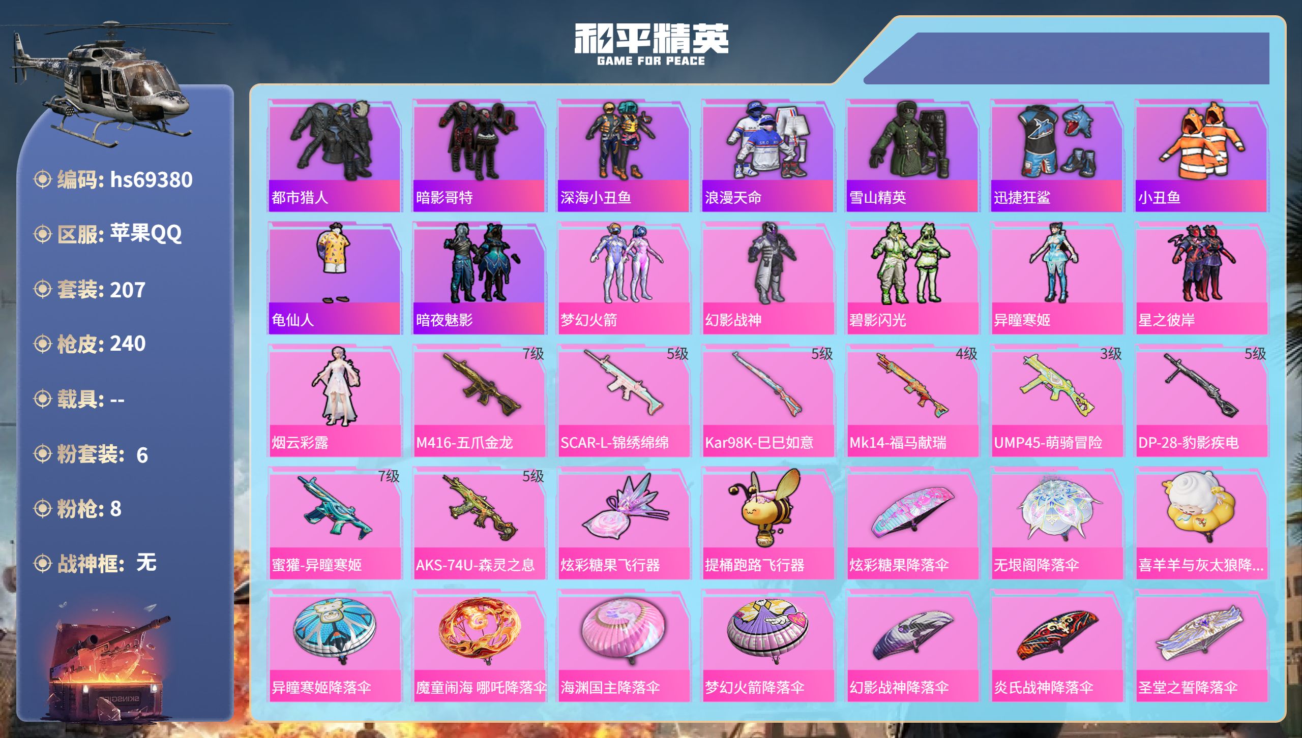 PX_2525004-,苹果手Q-6王牌印记-2粉装-7特效枪-41033热力值-102套装-150枪皮 【2粉装】套装-未来领航者,角色-冷漠罗丽 【7特效枪】AMR-智耀战神/7级,Kar98K-巳巳如意/5级,DP-28-豹影疾电/5级,M416-电玩时刻/5级,GROZA-镜光银凌/5级,Mk14-甜梦熊击/5级,AUG-暖羊咩咩/5级 【5稀有紫装】Mark.06,暗影哥特,浪漫天命,龟仙人,怀庆长公主 【102稀有时装】冷漠罗丽,未来领航者,浪漫天命,龟仙人,Mark.06,暗影哥特,龙魂突击队,异域银装,白糯汤圆,绒宝小鹅,街头风暴,星途旅人,冰河战士,青团波波,大橘大利,达芬奇,战术大师,智谋强哥,怀庆长公主,雏菊兔兔,糖糖葫芦,香桃花海,蝶变,巳巳如意,粉恋花,元素星魂,彩虹兔,时希公主,霓虹热舞,雪绒豹,乐游熊熊,阳光菠萝,游乐,粉黛兰香,炫彩糖果,萌鸡速递,元气之梦,薄荷星砂,云朵鹅,顶瓜瓜,雪国风尚,蓝冰羽,紫幽梦,SS35特训,SS29特训,萝兰蝴蝶,SS31特训,SS33特训,SS32特训,SS36特训,焰鹰斗篷,菲菲,潮流炫酷,SS37特训,蝶吟花词,SS28特训,红色运动,黄色运动,白色伏地魔,湖蓝色名流,顽皮玉兔,绯格组合,SS26特训,漫步者,空岛之星,热情海星,纯真浪花,SS34特训,竞技名士,猛禽,SS30特训,长空猛禽,特战装甲,旭日情侣,街头潮人,冷焰舞者,魅力单车,浪漫假日,幻世战舞者,青涩时光,青春校园,燃烧卡路里,极速红龙,狙击之神,鹰眼刺客,冰冻风暴,幽夜迷踪,破蛋小黄鸡,蓝彩潮人,绮丽涂鸦,海岛探路者,破晓战魂,霓虹街区,SS27特训,缤纷果语,电音精灵,幻羽潜行,海盐绵绵冰,老实芭蕉,吉莉礼服,王牌教练,柠萌假日 【150稀有枪械】M416-电玩时刻/5级,GROZA-镜光银凌/5级,AUG-暖羊咩咩/5级,Kar98K-巳巳如意/5级,AMR-智耀战神/7级,Mk14-甜梦熊击/5级,DP-28-豹影疾电/5级,QBZ-纯真浪花,AWM-纯真浪花,汤姆逊-纯真浪花,DBS-乌木金纹,AA12-G-纯真浪花,平底锅-纯真浪花,蜜獾-精灵梦叶罗丽,SCAR-L-海盐豹豹,GROZA-海盐豹豹,SLR-金丰海韵,野牛-雏菊兔兔,Mk14-冰河战士,平底锅-雏菊兔兔,M762-雏菊兔兔,Mini14-雏菊兔兔,R1895-雏菊兔兔,UZI-冰河战士,平底锅-涂鸦旋风,M16A4-冰河战士,MK20-H-乌木金纹,Win94-乌木金纹,MK12-乌木金纹,破片手榴弹-爆破雪人,S12K-极意拳锋,PKM-紫幽梦,MG3-霓彩脉冲,Mk14-紫幽梦,M24-幻彩电音,蜜獾-乌木金纹,M762-云朵鹅,S1897-紫幽梦,SVD-云朵鹅,P92-紫幽梦,AWM-绿洲时空,SPAS-12-狂鲨锋刃,M417-玩趣呆呆,MK20-H-狂鲨锋刃,AUG-冰晶雪宝,铝热弹-炫彩糖果,UZI-炫彩糖果,UMP45-绿洲时空,短管霰弹-星穹咏叹调,SKS-乐游熊熊,平底锅-紫幽梦,燃烧瓶-甜梦桃焰,UMP45-海盐豹豹,AKS-74U-乌木金纹,AKM-涂鸦街区,SCAR-L-乐游熊熊,Famas-乌木金纹,Famas-霓彩脉冲,SPAS-12-云朵鹅,M249-无面战甲,破片手榴弹-拽到爆炸,Mk14-薄荷星砂,AKS-74U-鸡智如我,汤姆逊-智耀战神,沙漠之鹰-云朵鹅,烟雾弹-冰氧夏日,Mk14-紫晶流影,MG-36-薄荷星砂,大砍刀-云朵鹅,PKM-啾咪啾咪,撬棍-双重狂想,SVD-霓彩脉冲,SLR-霓彩脉冲,平底锅-属我最6,AC-VAL-六号稻草人,蜜獾-鸡智如我,AUG-紫晶流影,AMR-鸡智如我,AKM-霓彩脉冲,M416-红色方程式,M416-蓝色火焰,AKM-破晓战魂,AKM-恐龙拽拽,AKM-霓虹街区,SCAR-L-红色方程式,SCAR-L-夜灯,M16A4-红色方程式,GROZA-影袭,AUG-耀粉歌者,M762-彩虹符号,Mk47-炫光之旅,蜜獾-天降萌叽,Kar98K-红色方程式,Kar98K-彩虹符号,Kar98K-影袭,M24-影袭,AWM-焰鹰斗篷,AMR-乌木金纹,SKS-夜幕颂歌,UZI-影袭,UZI-天降萌叽,UZI-啾咪啾咪,UMP45-蓝色火焰,UMP45-生命誓言,UMP45-夜灯,Vector-焰鹰斗篷,汤姆逊-耀粉歌者,汤姆逊-天降萌叽,汤姆逊-炫彩节奏,MP5K-乌木金纹,P90-玩趣呆呆,S686-生命誓言,S12K-破晓战魂,S12K-夜灯,DBS-焰鹰斗篷,DBS-圣堂之誓,M249-糯团青竹,DP-28-焰鹰斗篷,DP-28-彩虹符号,MG3-幻世战舞者,平底锅-空岛之星,平底锅-焰鹰斗篷,战术弩-江南烟雨,破片手榴弹-呆爆全场,Kar98K-顶峰精英,GROZA-绿洲幻境,ACE32-冰晶雪宝,AUG-异域银装,MP5K-未来领航者,MK20-H-糖糖葫芦,MK20-H-星途旅人,M200-乌木金纹,十字弩-异域银装,SCAR-L-星途旅人,大砍刀-鬼刀,S686-巳巳如意,蜜獾-糖糖葫芦,UMP45-糖糖葫芦,SPAS-12-乌木金纹,平底锅-糖糖葫芦,破片手榴弹-星途旅人,GROZA-福马献瑞,P18C-糖糖葫芦,GROZA-紫矿核心,VSS-香桃花海,Mini14-香桃花海,P90-巳巳如意,破片手榴弹-巳巳如意,M416-绿洲时空,S12K-绿洲幻境 【12稀有飞行器】极意拳锋飞行器,狂鲨锋刃飞行器,鸡智如我飞行器,炫彩糖果飞行器,登顶巅峰飞行器,破刃行动尾迹,空岛之星尾迹,祥瑞锦鲤飞行器,顶峰精英尾迹,英伦信使飞行器,异域银装飞行器,镜光幻境飞行翼 【25稀有背包】狂鲨锋刃背包(3级),星穹咏叹调背包(3级),炫彩糖果背包(3级),粉黛兰香背包(3级),紫幽梦背包(3级),萌鸡速递背包(3级),薄荷星砂背包(3级),巳巳如意背包(3级),云朵鹅背包(3级),龟仙人龟壳背包(3级),破晓战魂背包(3级),焰鹰斗篷背包(3级),纯真浪花背包(3级),蝶变背包(3级),圣堂之誓背包(3级),竞速先锋背包(3级),异域银装背包(3级),江南烟雨背包(3级),初号机,觉醒Ver.背包(3级),环太平洋背包(3级),福马献瑞背包(3级),雏菊兔兔背包(3级),智谋强哥背包(3级),香桃花海背包(3级),冰河战士背包(3级) 【43稀有降落伞】海盐豹豹降落伞,纯真浪花降落伞,创世·救赎降落伞,SS35王牌降落伞,SS36王牌降落伞,幻彩电音降落伞,乐游熊熊降落伞,属我最6降落伞,炫彩糖果降落伞,狂鲨锋刃降落伞,星穹咏叹调降落伞,绯穹魔姬降落伞,紫幽梦降落伞,SS34王牌降落伞,SS33王牌降落伞,云朵鹅降落伞,果冻柠檬降落伞,霓虹街区降落伞,焰鹰斗篷降落伞,月下萌萌兔降