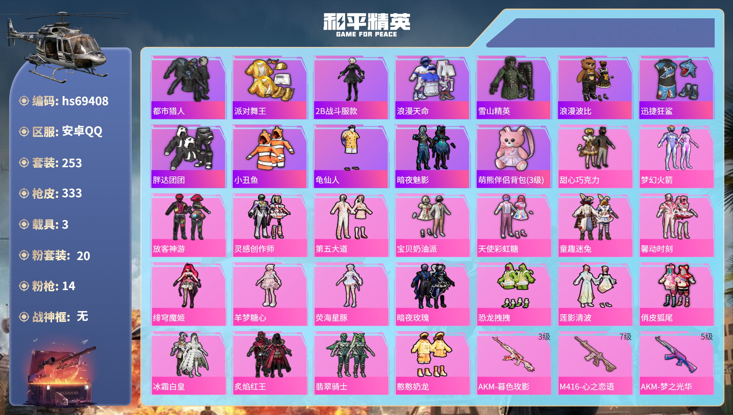 PX_2563361-,安卓手Q-28王牌印记-20粉装-14特效枪-3载具-热力值-253套装-333枪皮-4卓越印记-3传奇印记 【20粉装】套装-馨动时刻,套装-灵感创作师,角色-绯穹魔姬,套装-第五大道,套装-翡翠骑士,套装-憨憨奶龙,套装-天使彩虹糖,套装-冰霜白皇,套装-俏皮狐尾,套装-宝贝奶油派,角色-荧海星豚,套装-暗夜玫瑰,套装-放客神游,套装-莲影清波,套装-恐龙拽拽,套装-甜心巧克力,套装-炙焰红王,套装-梦幻火箭,角色-羊梦糖心,套装-童趣迷兔 【14特效枪】UMP45-恐龙拽拽/7级,蜜獾-荧海星豚/6级,Mk14-精灵梦叶罗丽/5级,Kar98K-巳巳如意/5级,DP-28-豹影疾电/5级,ACE32-萌骑漫游/4级,AKM-梦之光华/5级,SCAR-L-纯梦嫁纱/7级,AKM-暮色玫影/3级,Mk14-福马献瑞/5级,AKM-甜心宝贝/6级,M762-激战未来/5级,M416-心之恋语/7级,M417-第五大道/2级 【12稀有紫装】都市猎人,派对舞王,2B战斗服款,浪漫天命,雪山精英,浪漫波比,迅捷狂鲨,胖达团团,小丑鱼,龟仙人,暗夜魅影,萌熊伴侣背包(3级) 【3稀有载具】宾利添越(浅瞪羚棕),宾利欧陆GT敞篷(火焰橘),黑曜夜骑 【252稀有时装】甜心巧克力,梦幻火箭,放客神游,灵感创作师,第五大道,宝贝奶油派,天使彩虹糖,童趣迷兔,馨动时刻,绯穹魔姬,羊梦糖心,荧海星豚,暗夜玫瑰,恐龙拽拽,莲影清波,俏皮狐尾,冰霜白皇,炙焰红王,翡翠骑士,憨憨奶龙,迅捷龙虾,SS38特训,都市猎人,胖达团团,浪漫天命,龟仙人,雪山精英,小丑鱼,迅捷狂鲨,浪漫波比,派对舞王,2B战斗服款,好奇恐龙,激萌罗小黑,狂沙舞者,潮萌小黄鸭,粉团憨憨,萌趣咩咩,海上生明月,狂花道·雅典娜,异域银装,星渊小夜曲,街头风暴,星途旅人,蜜桃派对,冰河战士,鱼渊荷华,青团波波,大橘大利,燕燕于飞,战术大师,雏菊兔兔,马上有钱,糖糖葫芦,香桃花海,萌主吾皇,棉花软糖,午间小调,琴音绮想,雪绒豹,画境星梦,朱霞炽焰,狂鲨锋刃,凌霄紫焰,粉黛兰香,炫彩糖果,绯色魅影,萌鸡速递,元气之梦,书海巡游,风迹短诗,甜心蒙太奇,蜜露汐语,薄荷星砂,秘语星愿,蓝海鲸歌,云朵鹅,雪国风尚,恋语绒绒,青翼流星,暗夜魅影,SS35特训,SS29特训,萝兰蝴蝶,SS5特训,SS31特训,SS33特训,SS32特训,SS16特训,暴风机械师,时空追击者,SS36特训,浴火魔神,牛仔情诗,焰鹰斗篷,粉彩缠枝,童真绒兔,冰爽风暴,湖雨初晴,福星高照,豚鼠丹丹,雪兔飞飞,虎虎生威吉莉,夏日音浪,龙的传人,潮流炫酷,SS8特训,白熊同盟,萌黄之夏,SS37特训,击剑大师,SS28特训,超能拳王,特训学院,猎鹰,5.56爱好者,热血青春,SS9特训,酷潮明星,SS26特训,漫步者,热情海星,黎明保卫者,炫蓝之夏,纯真浪花,SS34特训,骑行爱好者,竞技名士,SS30特训,长空猛禽,竞技勇士朋克,特战装甲,战地菁英,旭日情侣,灰色格斗者,软羊咩咩,甜蜜告白,街头潮人,怒火燎原,惊鸿侠骨,魅力单车,灼焰舞者,春光漫游,夜莺强袭者,野性战魂,SS2特训,浪漫假日,极地朋克,幻世战舞者,特殊使命,青涩时光,暖心熊熊,特种空勤,牛气满满,和平特警,娇憨猪猪,风暴特警,冰川特警,雷霆特警,滨海假日,狙击之神,红釉青花,麻辣教官,鹰眼刺客,雨过天青,福马献瑞,SS3特训,冰冻风暴,SS11特训,灵动马戏师,SS4特训,青春冒险家,破蛋小黄鸡,潮流游乐家,日照花林,疯狂小兔子,圣诞大吉,特战英豪,北国孤狼,SS6特训,千禧之恋,神秘领域,绮丽涂鸦,坚韧舞者,淡雅花蕊,玲珑飞花,原初圣火,逆风勇士,跃动心情,SS7特训,娴静芝兰,霓虹街区,田园牧歌,都市魅力,萌趣颜团子,轻风白浪,SS10特训,特种颜团子,沙漠兵团,闪金天王,镭射皇者,耀粉歌者,探宝勇士,静谧青瓷,SS12特训,牛气冲天,迅捷之星,SS18特训,治愈之星,银白舞王,科技之星,SS13特训,SS17特训,瑞龙福将,团圆交子,遗落祭司,熠彩粉晶,光影梦想家,异彩先驱,霓虹极客,空投萌叽,金戈铁马,SS19特训,SS20特训,SS21特训,玉兔迎春,弄潮海豚,SS22特训,SS23特训,呆萌铁蟹,夏日倾情,莱茵河畔,青涩年华,香榭午后,SS14特训,神气柴柴,妙红点点,幻彩翩翩,格斗先锋,幻羽潜行,海盐绵绵冰,吉莉礼服,王牌教练,荣耀,柠萌假日,粉红小猪,鹤鸣,懵萌河马,SS25特训,锦衣飞扬,蝎王蛇后,SS15特训 【332稀有枪械】AKM-暮色玫影/3级,M416-心之恋语/7级,AKM-梦之光华/5级,AKM-甜心宝贝/6级,SCAR-L-纯梦嫁纱/7级,M762-激战未来/5级,Kar98K-巳巳如意/5级,Mk14-福马献瑞/5级,Mk14-精灵梦叶罗丽/5级,UMP45-恐龙拽拽/7级,DP-28-豹影疾电/5级,M417-第五大道/2级,蜜獾-荧海星豚/6级,ACE32-萌骑漫游/4级,QBZ-纯真浪花,AWM-纯真浪花,汤姆逊-纯真浪花,DBS-乌木金纹,AA12-G-纯真浪花,平底锅-纯真浪花,Vector-创世·救赎,QBZ-萌萌彩虹球,蜜獾-精灵梦叶罗丽,S1897-精灵梦叶罗丽,SCAR-L-海盐豹豹,野牛-雏菊兔兔,平底锅-雏菊兔兔,M762-雏菊兔兔,Mini14-雏菊兔兔,R1895-雏菊兔兔,UZI-冰河战士,MK20-H-乌木金纹,DBS-风迹短诗,莫辛纳甘-风迹短诗,Win94-乌木金纹,MK12-风迹短诗,MK12-乌木金纹,破片手榴弹-爆破雪人,AKM-灵猫魔法师,汤姆逊-灵猫魔法师,撬棍-灵猫魔法师,ACE32-画境星梦,M1加兰德-画境星梦,MP5K-画境星梦,蜜獾-乌木金纹,M762-云朵鹅,SVD-云朵鹅,SPAS-12-狂鲨锋刃,MK20-H-狂鲨锋刃,AUG-冰晶雪宝,突击盾牌-绝对恒星,铝热弹-炫彩糖果,UZI-炫彩糖果,大砍刀-像素花束,AA12-G-画境星梦,平底锅-画境星梦,Mk47-风迹短诗,JS9-凌霄紫焰,MG-36-凌霄紫焰,UMP45-海盐豹豹,ARX-凌霄紫焰,AKS-74U-乌木金纹,电击枪-喜羊羊与灰太狼,蜜獾-风迹短诗,P92-凌霄紫焰,AMR-喜羊羊与灰太狼,Famas-乌木金纹,SPAS-12-云朵鹅,破片手榴弹-拽到爆炸,信号枪-异瞳寒姬,平底锅-凌霄紫焰,Mk