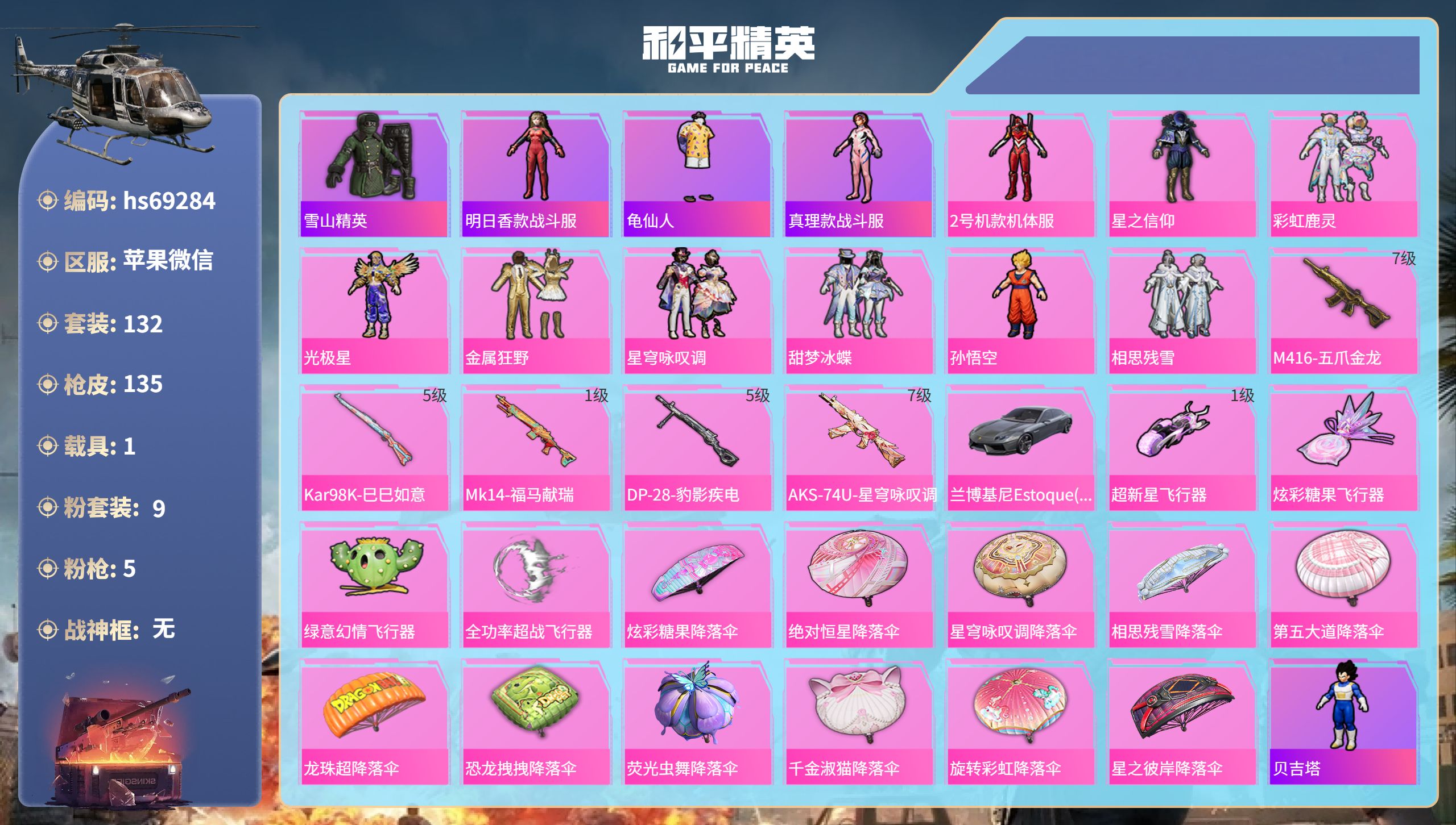 PX_2563359-,苹果微信-20王牌印记-9粉装-5特效枪-1载具-50285热力值-132套装-135枪皮-10卓越印记-1传奇印记 【9粉装】超级赛亚人-孙悟空,套装-彩虹鹿灵,套装-甜梦冰蝶,套装-金属狂野,套装-星之信仰,角色-2号机款机体服,角色-光极星,套装-相思残雪,套装-星穹咏叹调 【5特效枪】DP-28-豹影疾电/5级,M416-五爪金龙/7级,Kar98K-巳巳如意/5级,Mk14-福马献瑞/1级,AKS-74U-星穹咏叹调/7级 【4稀有紫装】雪山精英,明日香款战斗服,龟仙人,真理款战斗服 【1稀有载具】兰博基尼Estoque(银翼灰) 【133稀有时装】2号机款机体服,星之信仰,彩虹鹿灵,光极星,金属狂野,星穹咏叹调,甜梦冰蝶,孙悟空,贝吉塔,相思残雪,迅捷龙虾,SS38特训,龟仙人,雪山精英,明日香款战斗服,龙魂突击队,卖崽青蛙,异域银装,街头风暴,星途旅人,冰河战士,战术大师,真理款战斗服,蝶变,巳巳如意,月烬之祷,狂鲨锋刃,炫彩糖果,萌鸡速递,元气之梦,薄荷星砂,顶瓜瓜,雪国风尚,恋语绒绒,青翼流星,SS35特训,SS29特训,SS31特训,SS33特训,SS32特训,SS16特训,华灯初上,SS36特训,决胜时刻,焰山流火,银河圣歌,闪耀星光,福星高照,虎虎生威吉莉,夏日音浪,龙的传人,甜梦熊熊,青玉碎影,萌黄之夏,SS37特训,海滨突袭者,SS28特训,S6赛事,青年教官,暗黑骑手,阳光火鸡,涂山之恋,SS26特训,空岛之星,荧惑魅影,黑色伏地魔,炫蓝之夏,SS34特训,蓝色守护者,SS30特训,特战装甲,战地菁英,旭日情侣,街头潮人,冥星暗影,冷焰舞者,夜莺强袭者,SS2特训,幻世战舞者,青涩时光,青春校园,春日漫步,燃烧卡路里,滨海假日,狙击之神,福马献瑞,SS3特训,SS4特训,破蛋小黄鸡,绮丽涂鸦,霓虹街区,萌趣颜团子,特种颜团子,探宝勇士,SS27特训,情公主,SS18特训,SS17特训,空投萌叽,SS19特训,SS20特训,SS21特训,玉兔迎春,贝吉塔,SS23特训,甜蜜熊情侣,缤纷果语,滨海厨神,莱茵河畔,迪迦奥特曼,赛罗奥特曼,神气柴柴,艾克斯奥特曼,欧布奥特曼,捷德奥特曼,格斗先锋,海盐绵绵冰,老实芭蕉,吉莉礼服,刚毅裁决者,SS1特训,王牌教练,荣耀,柠萌假日,微雨春柳,SS24特训,鹤鸣,暖风夏荷,懵萌河马,短笛,SS25特训,鹤发童颜,SS15特训 【135稀有枪械】M416-五爪金龙/7级,Kar98K-巳巳如意/5级,Mk14-福马献瑞/1级,DP-28-豹影疾电/5级,AKS-74U-星穹咏叹调/7级,DBS-乌木金纹,SCAR-L-海盐豹豹,GROZA-海盐豹豹,Mk14-冰河战士,撬棍-突变脉冲,UZI-冰河战士,M16A4-冰河战士,MK20-H-乌木金纹,Win94-乌木金纹,MK12-乌木金纹,MG3-霓彩脉冲,蜜獾-乌木金纹,SPAS-12-狂鲨锋刃,M417-玩趣呆呆,MK20-H-狂鲨锋刃,AUG-冰晶雪宝,铝热弹-炫彩糖果,UZI-炫彩糖果,大砍刀-像素花束,M249-冰晶雪宝,破片手榴弹-海盐豹豹,UMP45-海盐豹豹,AKS-74U-乌木金纹,爆炸猎弓-喜羊羊与灰太狼,Famas-乌木金纹,Famas-霓彩脉冲,破片手榴弹-拽到爆炸,S1897-糯团青竹,烟雾弹-冰氧夏日,AKS-74U-粉粉喵呜,MG-36-薄荷星砂,PKM-啾咪啾咪,SLR-霓彩脉冲,平底锅-属我最6,S12K-霓彩脉冲,AKM-霓彩脉冲,M416-乌木金纹,M416-蓝色火焰,M416-糯团青竹,M416-绯红前夜,AKM-生命誓言,AKM-彩虹符号,AKM-江南烟雨,AKM-星之信仰,AKM-萌趣颜团子,AKM-霓虹街区,SCAR-L-红色方程式,SCAR-L-夏日绵绵冰,SCAR-L-炫彩节奏,M16A4-红色方程式,M16A4-乌木金纹,M16A4-生命誓言,GROZA-懵萌河马,GROZA-彩虹符号,AUG-耀粉歌者,AUG-天降萌叽,QBZ-相思残雪,M762-乌木金纹,M762-天降萌叽,Mk47-乌木金纹,Mk47-林间仙鹿,G36C-乌木金纹,G36C-暗夜玫瑰,G36C-懵萌河马,AC-VAL-乌木金纹,蜜獾-天降萌叽,Kar98K-乌木金纹,Kar98K-彩虹符号,Kar98K-炫彩节奏,M24-乌木金纹,莫辛纳甘-乌木金纹,莫辛纳甘-懵萌河马,AMR-乌木金纹,SKS-炫彩节奏,VSS-碧影闪光,VSS-彩虹符号,Mini14-生命誓言,Mini14-炫彩节奏,Mini14-涂山之恋,Mk14-乌木金纹,QBU-全功率超战,UZI-炫彩节奏,UZI-乌木金纹,UZI-天降萌叽,UZI-啾咪啾咪,UMP45-涂山之恋,UMP45-乌木金纹,UMP45-金玉无双,汤姆逊-天降萌叽,汤姆逊-炫彩节奏,野牛-乌木金纹,MP5K-乌木金纹,P90-乌木金纹,P90-玩趣呆呆,S1897-乌木金纹,S12K-玩趣呆呆,DBS-彩虹符号,M249-彩虹符号,M249-糯团青竹,DP-28-相思残雪,DP-28-彩虹符号,MG3-第五大道,MG3-幻世战舞者,MG3-乌木金纹,PKM-懵萌河马,PKM-梦幻舞会,沙漠之鹰-全功率超战,平底锅-空岛之星,平底锅-光之冒险,平底锅-懵萌河马,平底锅-相思残雪,平底锅-炫紫旋律,破片手榴弹-呆爆全场,破片手榴弹-萌趣颜团子,撬棍-冰晶雪宝,M417-虹云熊熊,AC-VAL-荒原烈焰,S686-千金淑猫,ACE32-冰晶雪宝,AUG-异域银装,M200-乌木金纹,十字弩-异域银装,SCAR-L-星途旅人,SPAS-12-乌木金纹,破片手榴弹-星途旅人,GROZA-福马献瑞,SLR-乌木金纹,VSS-香桃花海,Mini14-香桃花海,P90-巳巳如意 【12稀有飞行器】超新星飞行器/1级,狂鲨锋刃飞行器,马上有福飞行器,鸡智如我飞行器,炫彩糖果飞行器,破刃行动尾迹,空岛之星尾迹,红色滑翔尾迹,绿意幻情飞行器,顶峰精英尾迹,异域银装飞行器,全功率超战飞行器 【26稀有背包】懵萌河马背包(3级),狂鲨锋刃背包(3级),炫彩糖果背包(3级),薄荷星砂背包(3级),巳巳如意背包(3级),天降萌叽背包(3级),龟仙人龟壳背包(3级),萌趣颜团子背包(3级),虹云熊熊背包(3级),海盐豹豹背包(3级),蝶变背包(3级),异域银装背包(3级),龙的传人背包(3级),胶囊背包(3级),星之彼岸背包(3级),蝴蝶花灵背包(3级),特殊使命背包(3级),闲梦青缨背包(3级),金羽特工背包(3级),福马献瑞背包(3级),香桃花海背包(3级),天星战神背包(3级),星之信仰背包(3级),冰河战士背包(3级),相思残雪背包(3级),暗星紫秘背包(3级) 【64稀有降