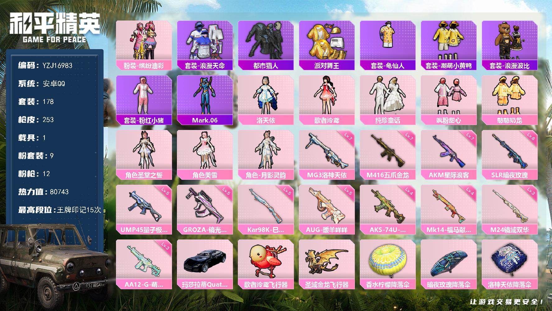 PX_2562740-可二次-安卓Q-4稀有1载具9粉装12特效枪18热门【精品公主身法号,高印记,优质主要面板,玛莎拉蒂蓝Q,猪妹,洛天依,泠鸢,美雪,都市,金鞋,小黄鸭,激萌罗小黑,浪漫波比,绒宝小鹅,白兰地假日,白光莹,蓝螳螂,鲨鱼裤,天命,菠萝头,巴啦啦小魔仙背包,满级五爪,满级AK星际浪客,满级MG3洛神天依,1级圣域金龙飞行器,6张改名卡】178套装253枪皮,80743热力值,15印记,历史绝世王牌14星,【4稀有】,都市猎人,浪漫天命,派对舞王,派对舞王(金靴子),【1载具】,玛莎拉蒂Q蓝色,【9粉装】,圣堂之誓,美雪,憨憨奶龙,洛天依,月影灵韵,飒粉甜心,缤纷油彩,歌者泠鸢,纯珍童话,【12特效枪】,M416-五爪金龙,(7级),AKS-74U-森灵之息,(4级),Kar98K-巳巳如意,(5级),AUG-暖羊咩咩,(5级),UMP45-量子极限,(5级),M24-镜域双华,(3级),GROZA-镜光银凌,(5级),AKM-星际浪客,(7级),SLR-暗夜玫瑰,(6级),MG3-洛神天依,(7级),Mk14-福马献瑞,(4级),AA12-G-萌骑幻想,(3级),【18热门】,Mark.06,龟仙人,潮萌小黄鸭,万圣娃娃,激萌罗小黑,迅捷狂鲨,浪漫波比,梦起落英,团圆交子,瑞龙福将,粉红小猪,破蛋小黄鸡,风华少年志,AKM-奇异狩猎者,M762-奇异狩猎者,M762-瑞龙福将,M24-奇异狩猎者,S686-奇异狩猎者,【1飞行器】,歌者泠鸢飞行器,【4头盔】,梦幻火箭头盔,幻影战神头盔,深海小丑鱼头盔,夏日绵绵冰头盔,营地ID:758784486
