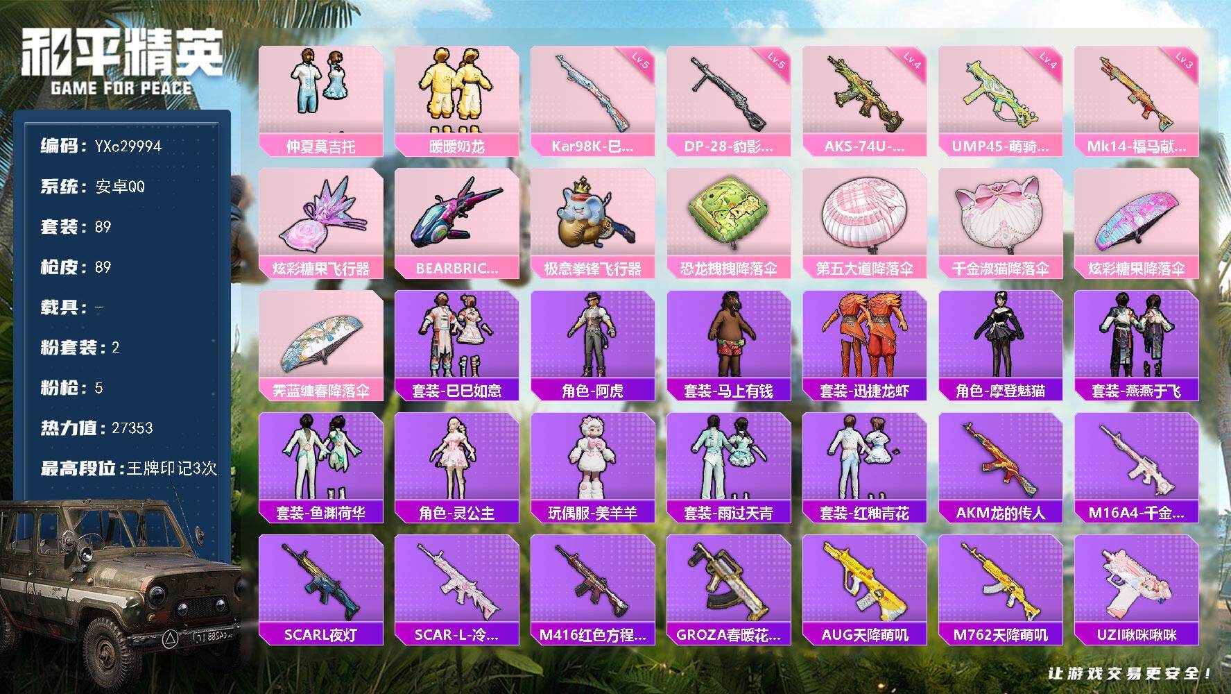 PX_2562690-??铁天赋】YXc29994-【可二次】【因赛季更新游戏段付以上号为准!】 ,安卓Q-2粉装5特效枪2热门89套装89枪皮,,3印记,历史卓越王牌10星, 【2粉装】,暖暖奶龙,仲夏莫吉托, 【5特效枪】,AKS-74U-森灵之息,(4级),Kar98K-巳巳如意,(5级),DP-28-豹影疾电,(5级),Mk14-福马献瑞,(3级),UMP45-萌骑冒险,(4级), 【2热门】,破蛋小黄鸡,极速红龙,