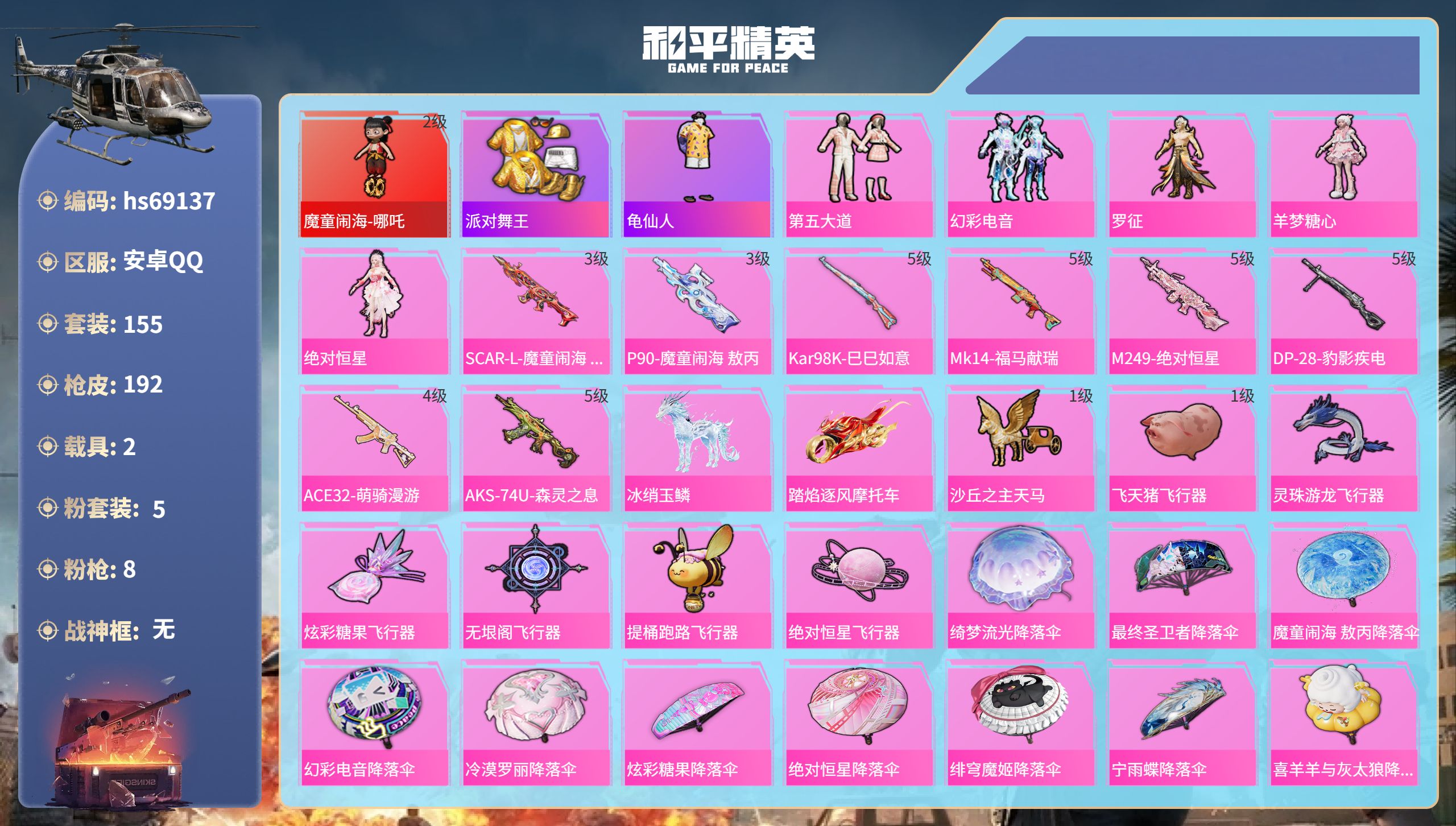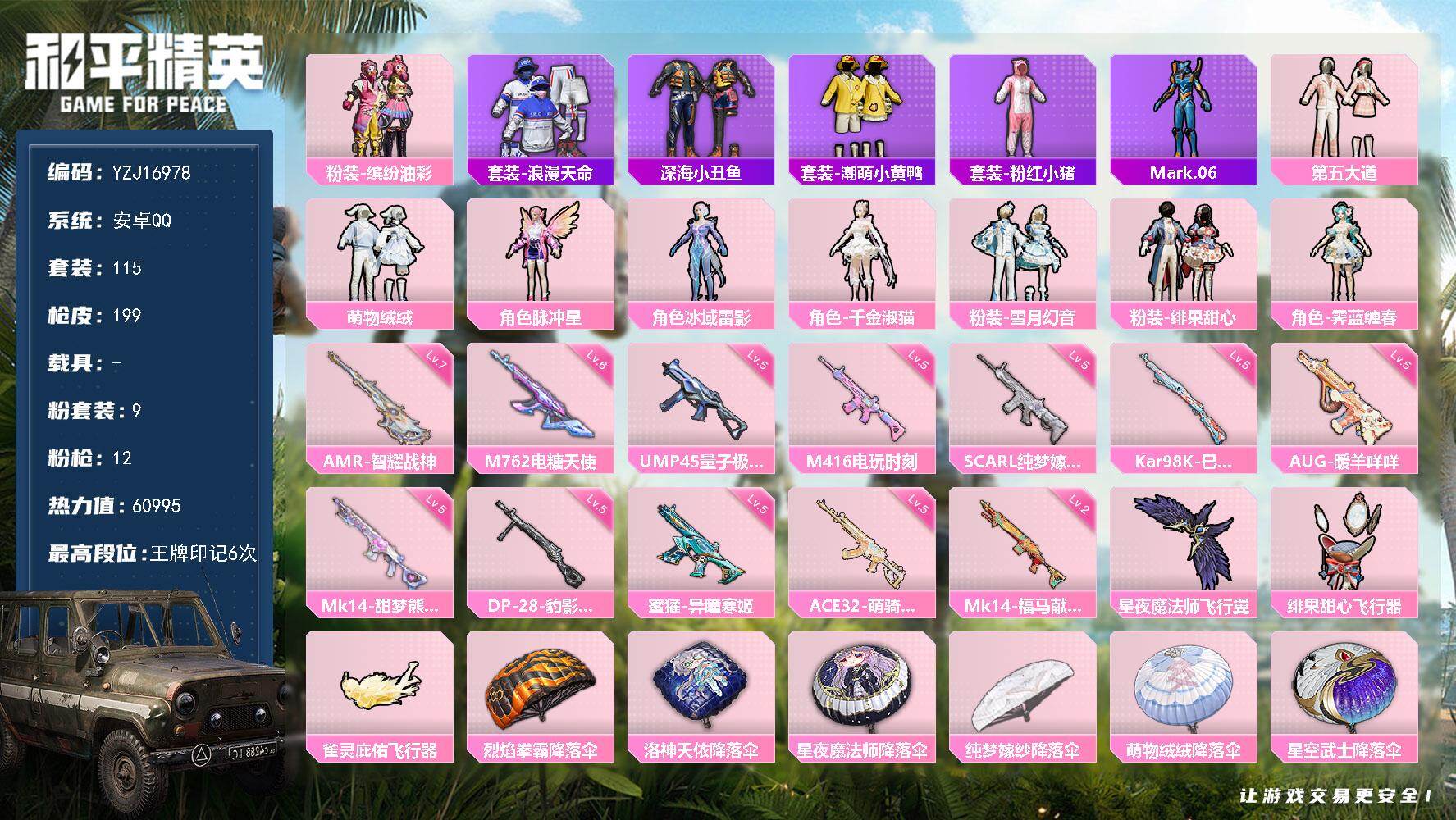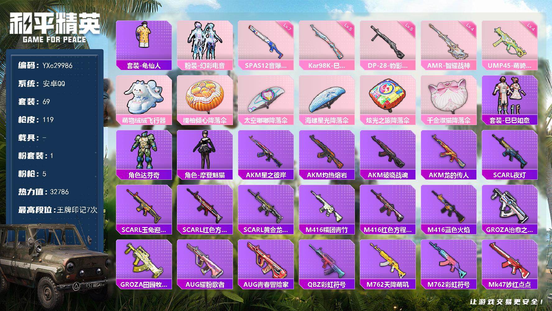PX_2562720-??铁天赋】YXc29986-【无二次协助处理】【因赛季更新游戏段付以上号为准!】 ,安卓Q-1粉装5特效枪1热门69套装119枪皮,,7印记,历史超级王牌10星, 【1粉装】,幻彩电音, 【5特效枪】,Kar98K-巳巳如意,(5级),DP-28-豹影疾电,(5级),AMR-智耀战神,(4级),UMP45-萌骑冒险,(4级),SPAS-12-音爆索尼克,(7级), 【1热门】,龟仙人, 【1飞行器】,萌物绒绒飞行器, 【1头盔】,甜心宝贝头盔