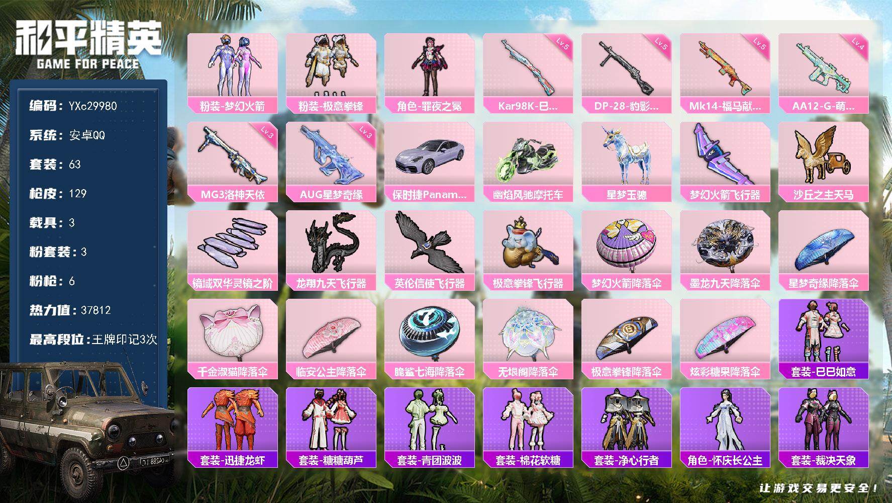 PX_2562741-??捷,新101,3级AUG星梦,满地铁天赋】YXc29980-【可二次】【因赛季更新游戏段付以上号为准!】 ,安卓Q-3载具3粉装6特效枪2热门63套装129枪皮,3印记,历史传奇王牌8星, 【3载具】,保时捷Panamera(星辰紫),星梦玉骢,幽焰风驰摩托车, 【3粉装】,梦幻火箭,极意拳锋,罪夜之冕, 【6特效枪】,Kar98K-巳巳如意,(5级),DP-28-豹影疾电,(5级),AUG-星梦奇缘,(3级),MG3-洛神天依,(3级),Mk14-福马献瑞,(5级),AA12-G-萌骑幻想,(4级), 【2热门】,破蛋小黄鸡,黑色刀锋, 【2飞行器】,龙翔九天飞行器,梦幻火箭飞行器, 【1头盔】,梦幻火箭头盔, 【1背包】,梦幻火箭背包,