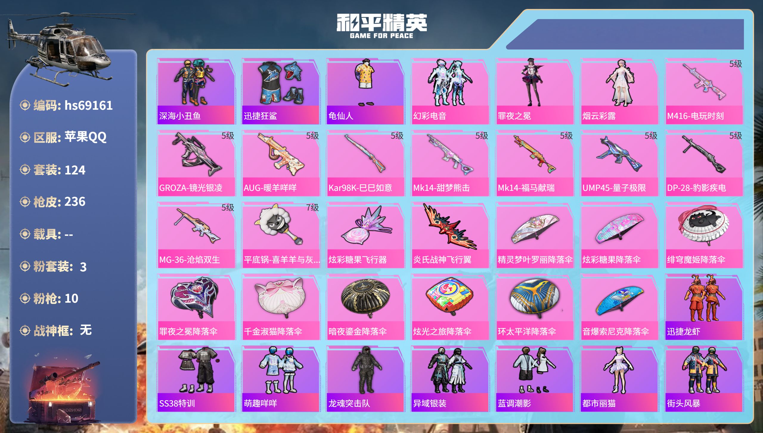 PX_2562687-5-【无二次协助处理】【因赛季更新游戏段付以上号为准!】 ,苹果Q-4粉装5特效枪16热门119套装157枪皮,,2印记,历史传奇王牌10星, 【4粉装】,天启纪元,金曜白虎,麻辣鲜香锅,星之彼岸, 【5特效枪】,M416-五爪金龙,(5级),Mini14-龙虾霸霸,(5级),AKM-幻海仙踪,(5级),Mk14-福马献瑞,(1级),UMP45-萌骑冒险,(2级), 【16热门】,仓鼠灰灰,雪山精英,梦魇先生,鹰眼刺客,软萌银虎,九霄,神秘黑猫,暗夜契约,漫步者,破蛋小黄鸡,软嫩糖心蛋,黑色刀锋,赛博空间,M416-仓鼠灰灰,M24-奇异狩猎者,M24-香水柠檬, 【2飞行器】,阿狸红飞行器,星之信仰飞行翼, 【2头盔】,折纸暴龙头盔,金风玉露头盔, 【3背包】,九霄背包,梦幻火箭背包,折纸暴龙背包,