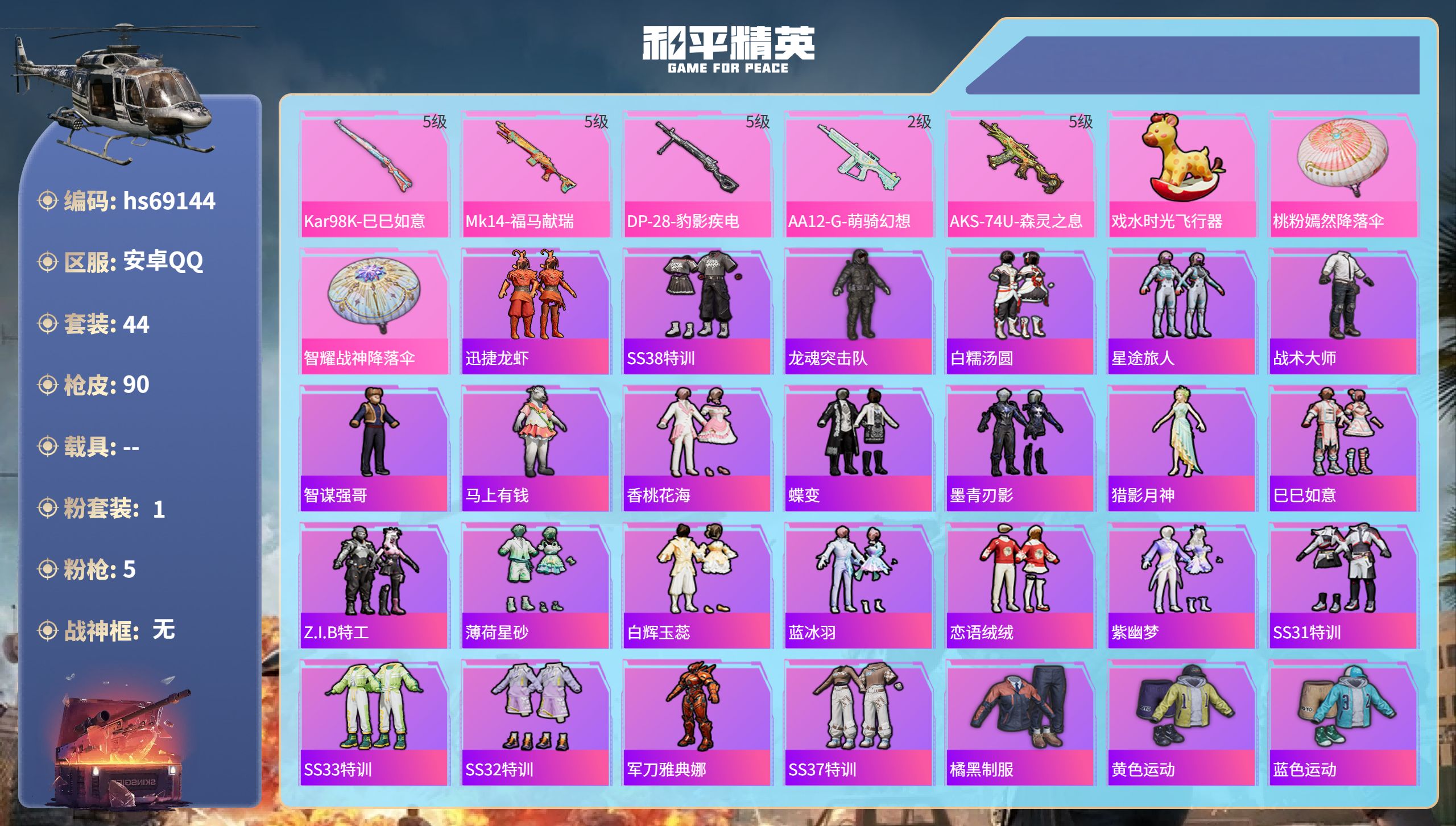 PX_2562714-,安卓手Q-0王牌印记-1粉装-5特效枪-20477热力值-44套装-90枪皮 【1粉装】角色-鸢尾珑雾 【5特效枪】Mk14-福马献瑞/5级,AA12-G-萌骑幻想/2级,Kar98K-巳巳如意/5级,DP-28-豹影疾电/5级,AKS-74U-森灵之息/5级 【41稀有时装】迅捷龙虾,SS38特训,龙魂突击队,白糯汤圆,星途旅人,战术大师,智谋强哥,马上有钱,香桃花海,蝶变,墨青刃影,猎影月神,巳巳如意,Z.I.B特工,薄荷星砂,白辉玉蕊,蓝冰羽,恋语绒绒,紫幽梦,SS31特训,SS33特训,SS32特训,军刀雅典娜,SS37特训,橘黑制服,黄色运动,蓝色运动,黑色伏地魔,SS34特训,猛禽,长空猛禽,冷焰舞者,狙击之神,福马献瑞,幻影武者,疯狂小兔子,绮丽涂鸦,海岛探路者,呆萌铁蟹,老实芭蕉,鹤鸣 【91稀有枪械】Kar98K-巳巳如意/5级,Mk14-福马献瑞/5级,DP-28-豹影疾电/5级,AA12-G-萌骑幻想/2级,AKS-74U-森灵之息/5级,DBS-乌木金纹,Mk14-冰河战士,Vector-突变脉冲,UZI-冰河战士,MK20-H-乌木金纹,PKM-紫幽梦,Mk14-紫幽梦,蜜獾-乌木金纹,S1897-紫幽梦,P92-紫幽梦,S1897-戏水时光,M417-玩趣呆呆,MK20-H-狂鲨锋刃,UZI-炫彩糖果,ARX-像素花束,M249-萌萌史莱姆,大砍刀-像素花束,TMP-9-萌萌史莱姆,平底锅-紫幽梦,R1895-棋盘冕主,AKS-74U-乌木金纹,Famas-乌木金纹,S1897-糯团青竹,Mk14-薄荷星砂,汤姆逊-智耀战神,S12K-智耀战神,AKS-74U-粉粉喵呜,MG3-智耀战神,PKM-啾咪啾咪,野牛-果冻柠檬,蝎式手枪-六号稻草人,M762-果冻柠檬,P1911-果冻柠檬,AUG-紫晶流影,AKM-霓彩脉冲,M416-红色方程式,AKM-破晓战魂,AKM-龙的传人,SCAR-L-夜灯,SCAR-L-炫彩节奏,GROZA-影袭,AUG-耀粉歌者,M762-天降萌叽,AWM-天降萌叽,SKS-糯团青竹,SKS-炫彩节奏,Mini14-耀粉歌者,UZI-天降萌叽,UMP45-夜灯,汤姆逊-耀粉歌者,汤姆逊-天降萌叽,汤姆逊-炫彩节奏,S686-彩虹符号,S12K-破晓战魂,S12K-夜灯,DBS-彩虹符号,M249-破晓战魂,M249-彩虹符号,DP-28-彩虹符号,MG3-幻世战舞者,撬棍-环太平洋,Kar98K-顶峰精英,DBS-绿洲时空,MG3-火熔核心,突击盾牌-虎痴许褚,AUG-异域银装,VSS-虎痴许褚,MK20-H-星途旅人,M200-乌木金纹,SCAR-L-星途旅人,S686-巳巳如意,SPAS-12-乌木金纹,AKS-74U-鬼刀,破片手榴弹-星途旅人,GROZA-福马献瑞,蜜獾-启元战纹,SLR-乌木金纹,燃烧瓶-福马献瑞,Vector-荒原烈焰,VSS-香桃花海,Mini14-香桃花海,汤姆逊-像素花束,P90-巳巳如意,破片手榴弹-巳巳如意,DBS-绿洲时空,MG3-火熔核心 【4稀有飞行器】马上有福飞行器,戏水时光飞行器,顶峰精英尾迹,异域银装飞行器 【11稀有背包】喜羊羊与灰太狼背包(3级),巳巳如意背包(3级),六号稻草人背包(3级),桃粉嫣然背包(3级),蝶变背包(3级),异域银装背包(3级),龙的传人背包(3级),福马献瑞背包(3级),荒原烈焰背包(3级),香桃花海背包(3级),冰河战士背包(3级) 【19稀有降落伞】桃粉嫣然降落伞,萌萌史莱姆降落伞,福马献瑞降落伞,紫幽梦降落伞,智耀战神降落伞,一举夺葵降落伞,果冻柠檬降落伞,六号稻草人降落伞,2023祥云降落伞,绚烂橙彩降落伞,普通降落伞,化学天才降落伞,白昼之火降落伞,闻鸡启五降落伞,异域银装降落伞,香桃花海降落伞,干得PEL亮降落伞,冰河战士降落伞,幻世战舞者降落伞 【11稀有头盔】狂鲨锋刃头盔(3级),紫幽梦头盔(3级),圣辉之星头盔(3级),智耀战神头盔(3级),环太平洋头盔(3级),异域银装头盔(3级),荒原烈焰头盔(3级),忍者神龟头盔(3级),福马献瑞头盔(3级),香桃花海头盔(3级),冰河战士头盔(3级)