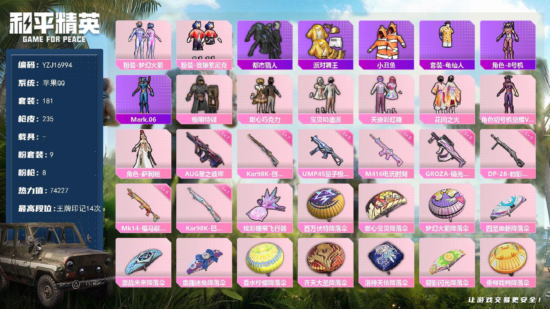 PX_2536432-??号!金鞋,新101,智耀战神,猪妹,满级五爪,番茄,胖达,哥特,国宝头,粉熊包,满地铁天赋】YXc28606-【可二次】【因赛季更新游戏段付以上号为准!】 ,安卓Q-3稀有2载具13粉装11特效枪12热门159套装223枪皮,,13印记,历史超级王牌14星, 【3稀有】,浪漫天命,派对舞王,派对舞王(金靴子), 【2载具】,冰绡玉鳞,星梦玉骢, 【13粉装】,梦幻火箭,光极星,千金淑猫,烟云彩露,羊梦糖心,智耀战神,幻彩电音,缤纷油彩,莲影清波,第五大道,岚岚物语,山涧鹿灵,彩虹鹿灵, 【11特效枪】,M416-五爪金龙,(7级),SCAR-L-锦绣绵绵,(5级),M416-电玩时刻,(5级),AKS-74U-星穹咏叹调,(6级),Kar98K-巳巳如意,(5级),DP-28-豹影疾电,(5级),M417-第五大道,(4级),AKM-梦之光华,(7级),Mk14-福马献瑞,(4级),ACE32-萌骑漫游,(5级),平底锅-桃粉嫣然,(3级), 【12热门】,龟仙人,红熊茄茄,潮萌小黄鸭,呆萌铁蟹,鹰眼刺客,激萌罗小黑,胖达团团,暗影哥特,漫步者,破蛋小黄鸡,极速红龙,Mini14-林间仙鹿, 【2飞行器】,梦幻火箭飞行器,祥瑞锦鲤飞行器, 【2头盔】,国宝胖达头盔,梦幻火箭头盔, 【2背包】,梦幻火箭背包,萌熊伴侣背包,