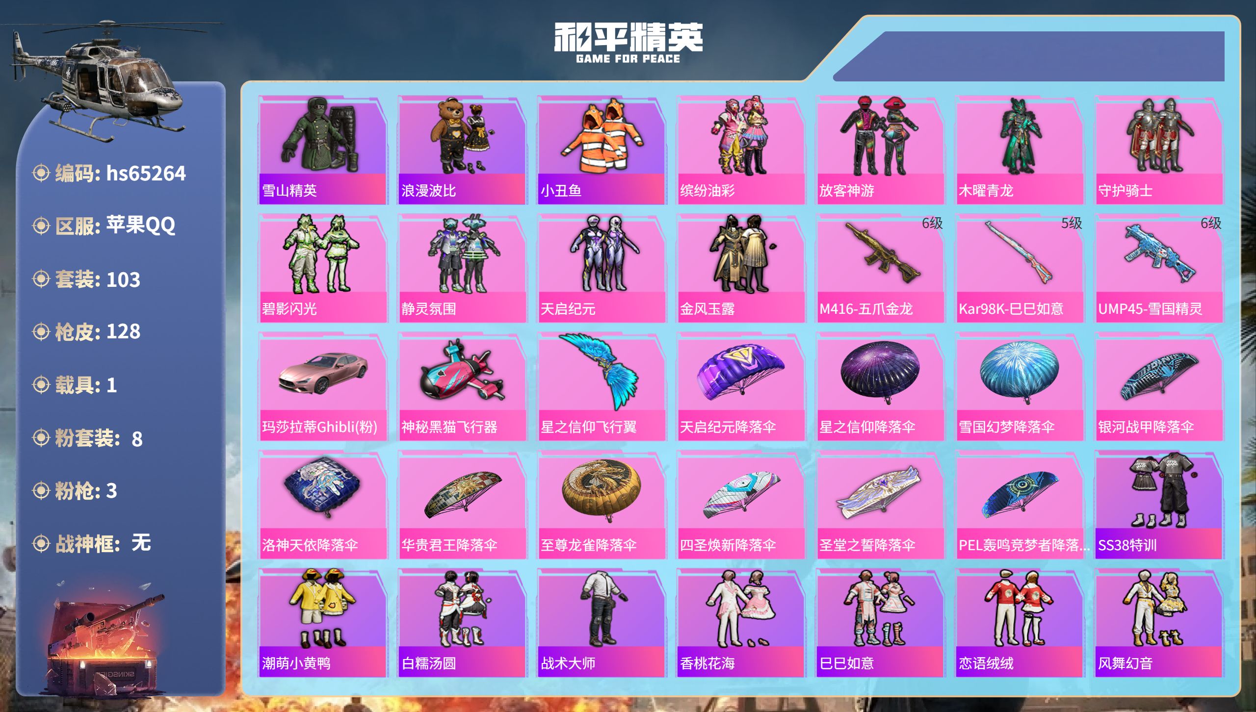 PX_2562364--7粉装-9特效枪-0载具-3粉色飞行器-65303热力值-10王牌印记-166套装-238枪皮 【热门品类】:套装-龟仙人 【粉色套装】:粉装-极限特训,粉装-天使彩虹糖,粉装-炙焰红王,粉装-山涧鹿灵,粉装-赤焰黑爵,角色-月影灵韵,角色-异瞳寒姬 【粉色枪皮等级】:SCAR-L-锦绣绵绵(五级),M416-电玩时刻(五级),GROZA-镜光银凌(五级),AUG-暖羊咩咩(五级)
