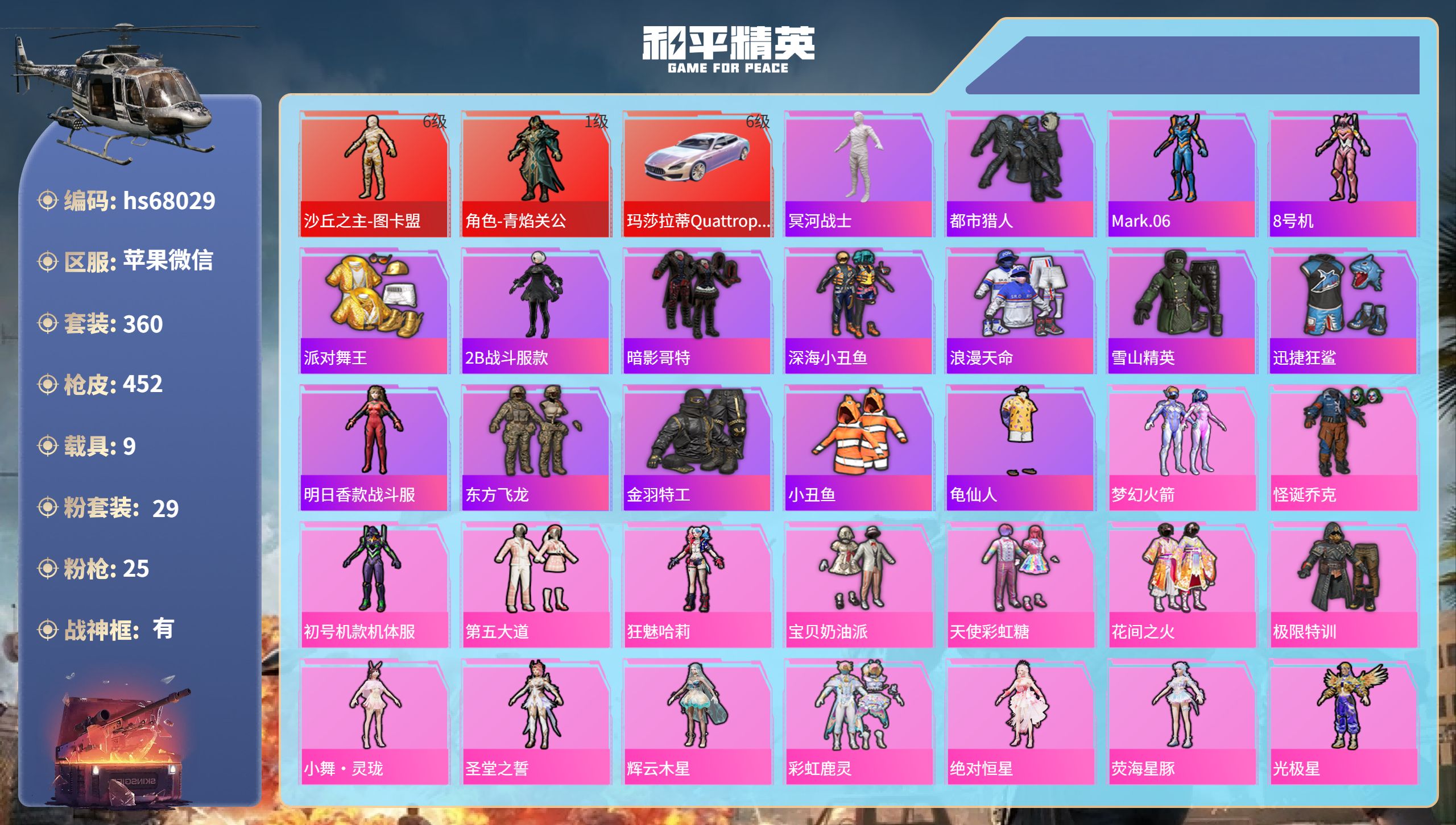 PX_2562359-,苹果微信-19王牌印记-有战神框-2红装-29粉装-25特效枪-9载具-热力值-360套装-452枪皮-15卓越印记-15传奇印记 【2红装】角色-青焰关公/1级,沙丘之主-图卡盟/6级 【29粉装】套装-恐龙拽拽,角色-月影灵韵,角色-辉云木星,套装-寒光使者,套装-金属狂野,套装-彩虹鹿灵,套装-炙焰红王,角色-白兰星,套装-暗夜玫瑰,套装-星之彼岸,角色-绝对恒星,套装-梦幻火箭,角色-初号机款机体服,套装-太空嘟嘟,角色-精灵菇菇,角色-守护天翼,套装-天使彩虹糖,人物-小舞·灵珑,角色-荧海星豚,套装-宝贝奶油派,套装-花间之火,套装-怪诞乔克,套装-极限特训,套装-第五大道,角色-狂魅哈莉,套装-冰霜白皇,角色-圣堂之誓,套装-仲夏莫吉托,角色-光极星 【25特效枪】DP-28-豹影疾电/5级,燃烧瓶-薄荷可可/6级,Kar98K-巳巳如意/5级,镰刀-幽影之判/7级,M249-绝对恒星/5级,UMP45-恐龙拽拽/5级,GROZA-旋转彩虹/5级,M416-墨龙九天/1级,Mk14-福马献瑞/1级,P90-能量风暴/5级,AKM-炫紫旋律/2级,UZI-畅跳缤纷/5级,P90-沙丘之主/1级,平底锅-仲夏莫吉托/4级,SCAR-L-童趣迷兔/5级,Mk14-辉云木星/5级,M416-至情至圣/9级,Vector-飒粉甜心/5级,AKM-甜心宝贝/5级,M416-灵猫魔法师/1级,破片手榴弹-粉粉猫爪/6级,AUG-星之彼岸/1级,M417-第五大道/1级,M416-五爪金龙/1级,AUG-星梦奇缘/9级 【17稀有紫装】冥河战士,巡查衣,都市猎人,Mark.06,8号机,派对舞王,2B战斗服款,暗影哥特,深海小丑鱼,浪漫天命,雪山精英,迅捷狂鲨,明日香款战斗服,东方飞龙,金羽特工,小丑鱼,龟仙人 【9稀有载具】玛莎拉蒂Quattroporte(幻星粉)/6级,保时捷Taycan,旅行版(冰莓粉),擎天重拳,时空跃影(星辉银),宾利欧陆GT敞篷(火焰橘),合金龙骨(蓝),黑曜夜骑,赤兔,辉羽雀灵自行车 【1僚机】僚机-萌酷奶龙 【356稀有时装】图卡盟/6级,青焰关公/1级,梦幻火箭,怪诞乔克,初号机款机体服,第五大道,狂魅哈莉,宝贝奶油派,天使彩虹糖,花间之火,极限特训,小舞·灵珑,圣堂之誓,辉云木星,彩虹鹿灵,绝对恒星,荧海星豚,光极星,暗夜玫瑰,恐龙拽拽,白兰星,金属狂野,月影灵韵,寒光使者,守护天翼,太空嘟嘟,冰霜白皇,炙焰红王,仲夏莫吉托,星之彼岸,绝对防御上衣,NV追光队服,PAI追光队服,迅捷龙虾,SS38特训,都市猎人,浪漫天命,龟仙人,Mark.06,雪山精英,暗影哥特,深海小丑鱼,小丑鱼,东方飞龙,8号机,金羽特工,迅捷狂鲨,明日香款战斗服,冥河战士,派对舞王,2B战斗服款,暗夜行者,狂沙舞者,潮萌小黄鸭,Alan,Walker,粉雾星云,萌趣咩咩,石蕴玉辉,鹿角斗士,龙魂突击队,小熊娃娃,狂花道·雅典娜,鲛海歌灵,异域银装,纯白跃动,都市丽猫,摩登魅猫,街头风暴,星途旅人,光矢逐梦,霜纹水星,冰河战士,鱼渊荷华,青团波波,绿头鱼,大橘大利,燕燕于飞,幽秘之星,风玲,战术大师,怪笑疯兔,智谋强哥,诡面顽熊,雏菊兔兔,马上有钱,多纳泰罗,糖糖葫芦,晶辉守护,香桃花海,蝶变,瑰梦爱神,墨青刃影,巳巳如意,镭金极速,粉恋花,曼妙人鱼,棉花软糖,薰款战斗服,午间小调,彩虹兔,琴音绮想,雪绒豹,画境星梦,星影赞美诗,朱霞炽焰,狂鲨锋刃,夜瞳黯灵,阳光菠萝,绛羽幽主,游乐,凌霄紫焰,粉黛兰香,无面战甲,擎苍青焰,炫彩糖果,萌鸡速递,元气之梦,书海巡游,风迹短诗,甜心蒙太奇,诡诞巡游,超能元气,混沌火种,蜜露汐语,漫游都市,薄荷星砂,秘语星愿,超感刻度,云朵鹅,虚空漩涡,顶瓜瓜,银尘,雪国风尚,蓝冰羽,恋语绒绒,青翼流星,紫幽梦,SS35特训,SS29特训,萝兰蝴蝶,SS5特训,SS31特训,SS33特训,SS32特训,SS16特训,SS36特训,贝斯之夜,焰鹰斗篷,军械专家,决胜时刻,S5赛事,金鼠迎春,银河圣歌,忠猛周仓,豚鼠丹丹,雪兔飞飞,夏日音浪,龙的传人,潮流炫酷,SS8特训,甜梦熊熊,精灵菇菇,白熊同盟,青玉碎影,萌黄之夏,紧急救援,黄色格斗者,SS37特训,海滨突袭者,SS28特训,S6赛事,猎鹰,浓情蜜辣,极速竞梦,飞驰魅影,音速流光,登山爱好者,活力之心,SS9特训,帅气教官,阳光火鸡,边境牛仔,顽皮玉兔,绯格组合,涂山之恋,伏击者,SS26特训,迅猛虎鲸,野性山猫,漫步者,空岛之星,荧惑魅影,热情海星,黑色伏地魔,炫蓝之夏,纯真浪花,SS34特训,骑行爱好者,竞技名士,蓝色守护者,S3赛事,深蓝色名流,灰色守护者,S4赛事,雨林探路者,SS30特训,长空猛禽,沙漠探路者,竞技勇士朋克,特战装甲,战地菁英,旭日情侣,灰色格斗者,六六大吉,甜蜜告白,街头潮人,惊鸿侠骨,魅力单车,青羽突袭者,春光漫游,夜莺强袭者,野性战魂,水银刺客,猎梦纪元,丛林猎人,甜心亚梦,SS2特训,虚音幻奏,派对绅士,传奇侦探,极地朋克,幻世战舞者,甜蜜菠萝,特殊使命,半糖蓝莓,街舞之王,午夜朋克,青涩时光,暖心熊熊,战地名士,牛气满满,迎春赐吉,娇憨猪猪,春日漫步,龙腾端午,燃烧卡路里,滨海假日,极速红龙,狙击之神,沙漠毒蛇,红釉青花,麻辣教官,鹰眼刺客,雨过天青,沙暴袭击者,苍穹猎鹰,福马献瑞,SS3特训,冰冻风暴,玲珑侠影,冷酷挑战者,SS11特训,人气偶像,幽夜迷踪,SS4特训,破蛋小黄鸡,疯狂小兔子,摇滚舞王,圣诞大吉,特战英豪,快闪甜心,红潮炫舞,梦幻奶油,酸甜橘柚,北国孤狼,SS6特训,千禧之恋,绮丽涂鸦,耀眼新星,坚韧舞者,竞技达人朋克,淡雅花蕊,野性战心,玲珑飞花,超能勇士,海岛探路者,跃动心情,SS7特训,和煦暖阳,霓虹街区,森林游猎者,田园牧歌,轻风白浪,SS10特训,风行保卫者,极光玫瑰,烈火街头,摩艾涂鸦,探宝勇士,无烬之地,SS12特训,SS27特训,牛气冲天,SS18特训,冰凉西瓜,清新柠檬,特工青苹果,飞行日记,SS17特训,摩登王国,自由不朽