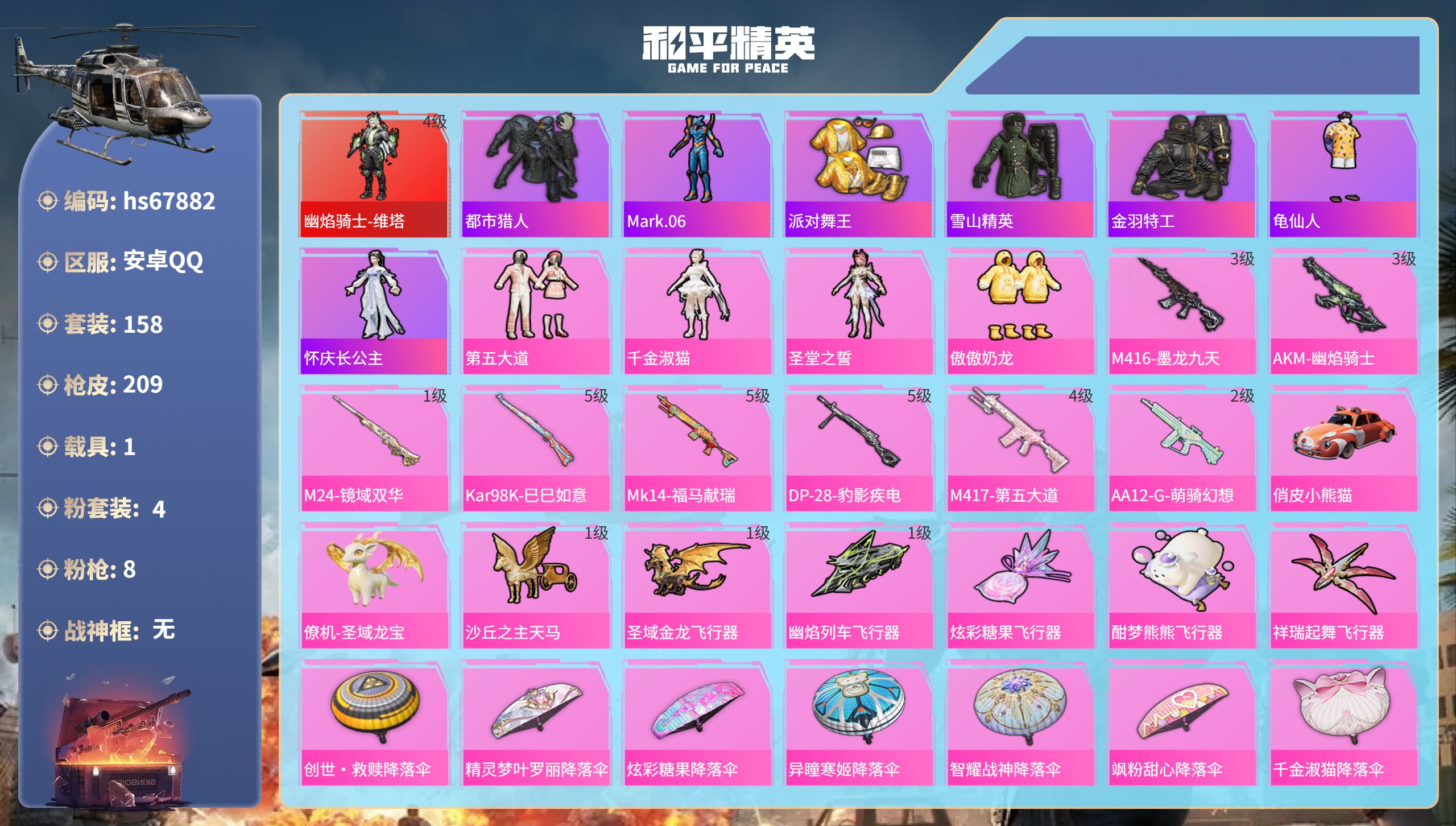 PX_2562336-,安卓手Q-18王牌印记-1红装-4粉装-8特效枪-1载具-68425热力值-158套装-209枪皮-4卓越印记-4传奇印记 【1红装】幽焰骑士-维塔/4级 【4粉装】角色-千金淑猫,套装-第五大道,套装-傲傲奶龙,角色-圣堂之誓 【8特效枪】M417-第五大道/4级,AKM-幽焰骑士/3级,AA12-G-萌骑幻想/2级,Kar98K-巳巳如意/5级,M24-镜域双华/1级,M416-墨龙九天/3级,DP-28-豹影疾电/5级,Mk14-福马献瑞/5级 【7稀有紫装】都市猎人,Mark.06,派对舞王,雪山精英,金羽特工,龟仙人,怀庆长公主 【1稀有载具】俏皮小熊猫 【1僚机】僚机-圣域龙宝 【158稀有时装】维塔/4级,第五大道,千金淑猫,圣堂之誓,傲傲奶龙,迅捷龙虾,都市猎人,龟仙人,Mark.06,雪山精英,金羽特工,派对舞王,萌趣咩咩,异域银装,都市丽猫,摩登魅猫,街头风暴,星途旅人,冰河战士,鱼渊荷华,创世·追猎,青团波波,大橘大利,燕燕于飞,战术大师,智谋强哥,怀庆长公主,马上有钱,糖糖葫芦,香桃花海,蝶变,猎影月神,巳巳如意,粉恋花,棉花软糖,琴音绮想,极速光影,画境星梦,狂鲨锋刃,游乐,粉黛兰香,萌鸡速递,元气之梦,书海巡游,漫游都市,薄荷星砂,顶瓜瓜,雪国风尚,蓝冰羽,恋语绒绒,紫幽梦,SS35特训,SS29特训,SS31特训,SS33特训,SS32特训,无暇誓言,SS36特训,军械专家,龙的传人,潮流炫酷,甜梦熊熊,白熊同盟,萌黄之夏,SS37特训,特训学院,青年教官,橘黑制服,红色运动,黄色运动,蓝色运动,黄色伏地魔,白色伏地魔,热血青春,酒红色名流,湖蓝色名流,黄色名流,顽皮玉兔,绯格组合,涂山之恋,漫步者,空岛之星,热情海星,黑色伏地魔,炫蓝之夏,纯真浪花,SS34特训,竞技名士,深蓝色名流,猛禽,SS30特训,长空猛禽,街头潮人,冷焰舞者,惊鸿侠骨,魅力单车,灼焰舞者,春光漫游,猎梦纪元,甜心亚梦,虚音幻奏,极地朋克,幻世战舞者,战地督导,特殊使命,牛气满满,娇憨猪猪,极速红龙,狙击之神,生化防暴队,红釉青花,麻辣教官,鹰眼刺客,雨过天青,福马献瑞,冰冻风暴,玲珑侠影,幻影武者,破蛋小黄鸡,快闪甜心,绮丽涂鸦,竞技达人朋克,野性战心,海岛探路者,破晓战魂,霓虹街区,森林游猎者,沙漠兵团,耀粉歌者,探宝勇士,牛气冲天,SS18特训,空投萌叽,SS19特训,光之冒险,晨曦薄雾,SS20特训,SS21特训,玉兔迎春,SS22特训,SS23特训,缤纷果语,滨海厨神,莱茵河畔,天籁歌者,神气柴柴,妙红点点,幻彩翩翩,海盐绵绵冰,王牌教练,荣耀,柠萌假日,粉红小猪,SS24特训,鹤鸣,懵萌河马,SS25特训,锦衣飞扬 【210稀有枪械】M416-墨龙九天/3级,AKM-幽焰骑士/3级,M24-镜域双华/1级,Kar98K-巳巳如意/5级,Mk14-福马献瑞/5级,DP-28-豹影疾电/5级,M417-第五大道/4级,AA12-G-萌骑幻想/2级,QBZ-纯真浪花,AWM-纯真浪花,汤姆逊-纯真浪花,DBS-乌木金纹,AA12-G-纯真浪花,平底锅-纯真浪花,突击盾牌-初号机,觉醒Ver.,SCAR-L-海盐豹豹,蝎式手枪-金丰海韵,UZI-冰河战士,M16A4-冰河战士,MK20-H-乌木金纹,MK12-乌木金纹,SVD-冷漠罗丽,PKM-紫幽梦,MG3-霓彩脉冲,R45-幻彩电音,ACE32-画境星梦,M1加兰德-画境星梦,MP5K-画境星梦,Mk14-紫幽梦,蜜獾-乌木金纹,S1897-紫幽梦,P92-紫幽梦,SPAS-12-狂鲨锋刃,M417-玩趣呆呆,MK20-H-狂鲨锋刃,铝热弹-炫彩糖果,UZI-炫彩糖果,大砍刀-像素花束,AA12-G-画境星梦,平底锅-画境星梦,Kar98K-星穹咏叹调,平底锅-紫幽梦,破片手榴弹-海盐豹豹,UMP45-海盐豹豹,AKS-74U-乌木金纹,AKM-涂鸦街区,Famas-乌木金纹,Famas-霓彩脉冲,破片手榴弹-拽到爆炸,S1897-糯团青竹,信号枪-异瞳寒姬,Mk14-薄荷星砂,AKS-74U-鸡智如我,汤姆逊-智耀战神,烟雾弹-冰氧夏日,Mk14-紫晶流影,MG-36-薄荷星砂,PKM-啾咪啾咪,SLR-霓彩脉冲,平底锅-属我最6,蜜獾-鸡智如我,AUG-紫晶流影,S12K-霓彩脉冲,AMR-鸡智如我,AKM-霓彩脉冲,M416-红色方程式,M416-蓝色火焰,M416-糯团青竹,AKM-环太平洋,AKM-影袭,AKM-破晓战魂,AKM-龙的传人,AKM-灼热熔岩,AKM-霓虹街区,SCAR-L-红色方程式,SCAR-L-玉兔迎春,SCAR-L-炫彩节奏,M16A4-幻世战舞者,M16A4-甜心亚梦,GROZA-影袭,GROZA-懵萌河马,AUG-耀粉歌者,AUG-甜蜜菠萝,AUG-天降萌叽,QBZ-未来歌姬,M762-彩虹符号,M762-天降萌叽,Mk47-乌木金纹,Mk47-妙红点点,G36C-懵萌河马,AC-VAL-天降萌叽,AC-VAL-快闪甜心,AC-VAL-彩虹甜喵,AC-VAL-甜心亚梦,AC-VAL-乌木金纹,蜜獾-天降萌叽,蜜獾-娇憨猪猪,Famas-镜域双华,Kar98K-影袭,Kar98K-炫彩节奏,M24-乌木金纹,M24-影袭,M24-炫彩节奏,AWM-天降萌叽,莫辛纳甘-乌木金纹,莫辛纳甘-懵萌河马,AMR-乌木金纹,AMR-妙红点点,M200-惊鸿侠骨,SKS-炫彩节奏,Mini14-耀粉歌者,Mini14-涂山之恋,Mk14-乌木金纹,SLR-娇憨猪猪,QBU-飒粉甜心,M417-惊鸿侠骨,M417-猪猪侠,MK20-H-快闪甜心,UZI-红色方程式,UZI-影袭,UZI-娇憨猪猪,UZI-天降萌叽,UMP45-涂山之恋,UMP45-蓝色火焰,汤姆逊-耀粉歌者,汤姆逊-炫彩节奏,野牛-乌木金纹,MP5K-乌木金纹,P90-乌木金纹,P90-快闪甜心,S686-奇异狩猎者,S686-生命誓言,S1897-炫彩节奏,S12K-破晓战魂,S12K-幻世战舞者,S12K-娇憨猪猪,S12K-音爆索尼克,DBS-第五大道,DBS-甜心亚梦,DBS-彩虹符号,DBS-圣堂之誓,M249-彩虹符号,M249-糯团青竹,M249-妙红点点,DP-28-甜心亚梦,MG3-惊鸿侠骨,MG3-第五大道,MG3-幻世战舞者,MG3-妙红点点,MG3-乌木金纹,PKM-懵萌河马,沙漠之鹰-快闪甜心,大砍刀-青龙偃月刀,平底锅-惊鸿侠骨,平底锅-空岛之星,平底锅-空投萌叽,平底锅-懵萌河马,平底锅-娇憨猪猪,平底锅-甜心亚梦,平底锅-妙红点点,平底锅-快闪甜心,撬棍-环太平洋,撬棍-幻世战舞者,战术弩-江南烟雨,爆炸猎弓-惊鸿侠骨,破片手榴弹-呆爆全场,MG3-火熔核心,蝎式手枪-千金淑猫,M16A4-千金