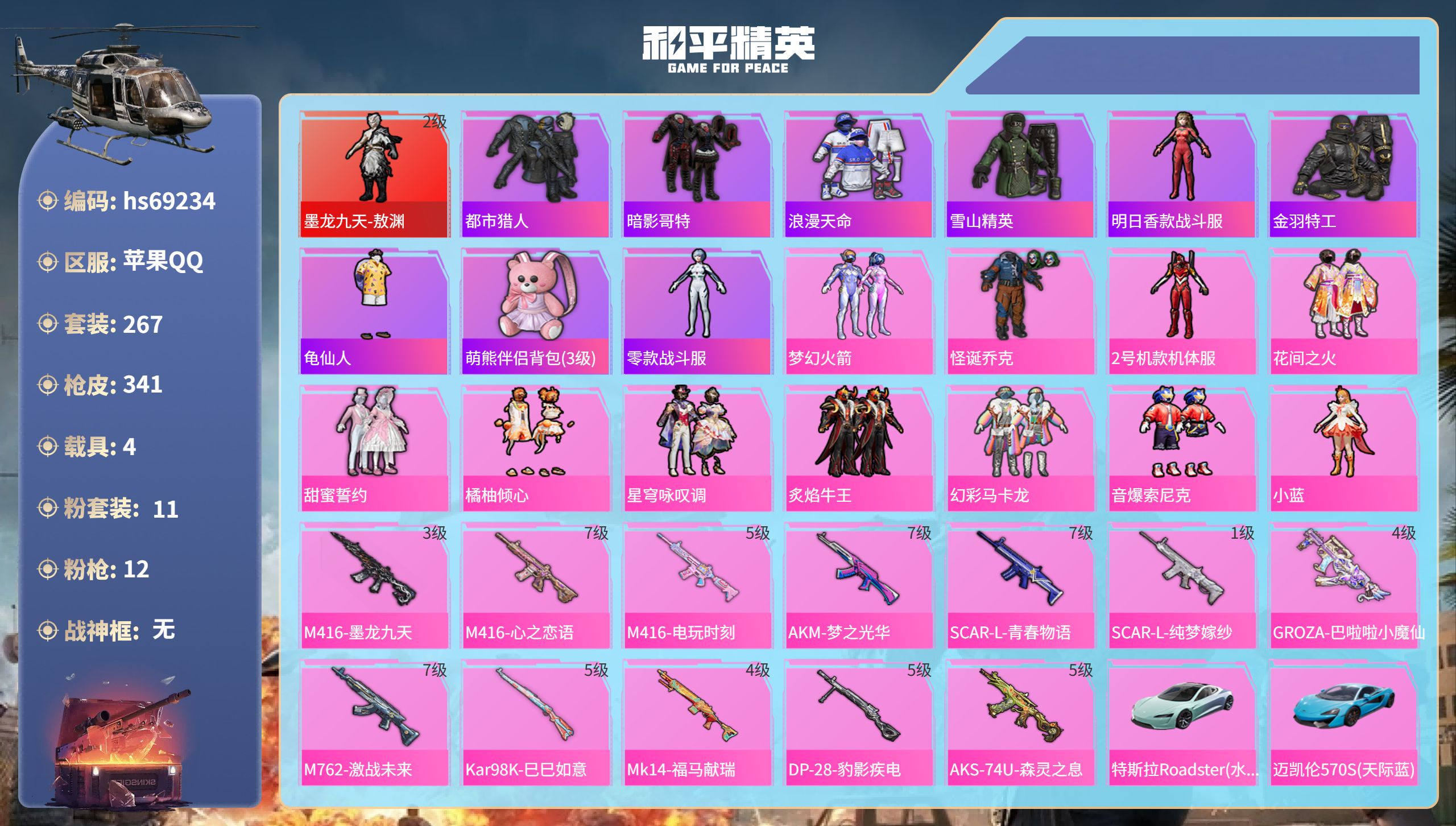 PX_2562304-,苹果手Q-19王牌印记-1红装-11粉装-12特效枪-4载具-热力值-267套装-341枪皮-3卓越印记-2传奇印记 【1红装】墨龙九天-敖渊/2级 【11粉装】套装-音爆索尼克,套装-炙焰牛王,套装-花间之火,套装-怪诞乔克,套装-梦幻火箭,套装-幻彩马卡龙,角色-小蓝,套装-星穹咏叹调,角色-2号机款机体服,套装-甜蜜誓约,套装-橘柚倾心 【12特效枪】M416-墨龙九天/3级,AKM-梦之光华/7级,DP-28-豹影疾电/5级,AKS-74U-森灵之息/5级,M416-心之恋语/7级,GROZA-巴啦啦小魔仙/4级,Kar98K-巳巳如意/5级,M416-电玩时刻/5级,SCAR-L-青春物语/7级,M762-激战未来/7级,SCAR-L-纯梦嫁纱/1级,Mk14-福马献瑞/4级 【9稀有紫装】都市猎人,暗影哥特,浪漫天命,雪山精英,明日香款战斗服,金羽特工,龟仙人,萌熊伴侣背包(3级),零款战斗服 【4稀有载具】特斯拉Roadster(水滴蓝),迈凯伦570S(天际蓝),合金龙骨(红),疾风龙骑 【267稀有时装】敖渊/2级,梦幻火箭,怪诞乔克,2号机款机体服,花间之火,甜蜜誓约,橘柚倾心,星穹咏叹调,炙焰牛王,幻彩马卡龙,音爆索尼克,小蓝,TJB追光队服,SS38特训,都市猎人,浪漫天命,龟仙人,雪山精英,暗影哥特,金羽特工,零款战斗服,明日香款战斗服,浪客战士,暗夜行者,爱崽白熊,激萌罗小黑,狂战萌兔,狂沙舞者,Alan,Walker,萌趣咩咩,软萌银虎,海上生明月,龙魂突击队,异域银装,街头风暴,星途旅人,冰河战士,TT战队服,大橘大利,JDG战队服,战术大师,智谋强哥,马上有钱,香桃花海,蝶变,巳巳如意,曼妙人鱼,月烬之祷,极速光影,游乐,萌鸡速递,元气之梦,漫游都市,薄荷星砂,顶瓜瓜,恋语绒绒,SS35特训,机械英豪,机械征服者,SS29特训,SS5特训,SS31特训,冰原使者,SS33特训,SS32特训,SS36特训,焰鹰斗篷,英勇保护者,水晶王族,智慧隐士,军械专家,决胜时刻,暗夜契约,纯白誓言,龙的传人,潮流炫酷,众神之王,智慧之神,青玉碎影,萌黄之夏,黄色格斗者,SS37特训,PEL摇滚竞梦者,破晓情侣,蝶吟花词,海滨突袭者,SS28特训,超能拳王,红色运动,黄色运动,蓝色运动,5.56爱好者,顽皮橙,飞驰魅影,白色伏地魔,音速流光,SS9特训,阳光火鸡,湖蓝色名流,酷潮明星,绯格组合,棕色飞行服,SS26特训,野性山猫,漫步者,空岛之星,荧惑魅影,热情海星,黑色伏地魔,黎明保卫者,炫蓝之夏,纯真浪花,SS34特训,雪鹰学院,竞技名士,蓝色守护者,猛禽,雨林探路者,荷鲁斯之眼,SS30特训,长空猛禽,神奈川冲浪里,竞技勇士朋克,安第斯皇冠,特战装甲,战地菁英,旭日情侣,灰色格斗者,六六大吉,甜蜜告白,本愿之火,怒火燎原,冷焰舞者,惊鸿侠骨,魅力单车,雪山征服者,夜莺强袭者,野性战魂,水银刺客,猎梦纪元,丛林猎人,甜心亚梦,SS2特训,虚音幻奏,派对绅士,传奇侦探,浪漫假日,极地朋克,贵族骑装,幻世战舞者,甜蜜菠萝,半糖蓝莓,午夜朋克,青涩时光,青春校园,特种空勤,牛气满满,和平特警,迎春赐吉,娇憨猪猪,风暴特警,春日漫步,冰川特警,潮流先锋,雷霆特警,龙腾端午,燃烧卡路里,滨海假日,狙击之神,红釉青花,麻辣教官,鹰眼刺客,雨过天青,SS3特训,冰冻风暴,完美偶像,SS11特训,幽夜迷踪,SS4特训,幻影武者,梦魇先生,暖心橘喵,破蛋小黄鸡,疯狂小兔子,圣诞大吉,玄武圣者,朱雀圣者,凛冬战士,白虎圣者,北国孤狼,SS6特训,神秘领域,耀眼新星,坚韧舞者,朋克治安官,野性战心,原初圣火,超能勇士,逆风勇士,海岛探路者,初火先锋,和煦暖阳,霓虹街区,森林游猎者,田园牧歌,轻风白浪,SS10特训,风行保卫者,沙漠兵团,闪金天王,镭射皇者,耀粉歌者,探宝勇士,静谧青瓷,无烬之地,SS12特训,SS27特训,牛气冲天,迅捷之星,情公主,SS18特训,治愈之星,银白舞王,清新柠檬,科技之星,SS13特训,飞行日记,SS17特训,绚烂繁星,SS19特训,光之冒险,SS20特训,SS21特训,玉兔迎春,SS22特训,SS23特训,夏日倾情,缤纷果语,滨海厨神,青涩年华,香榭午后,SS14特训,神气柴柴,灵蜜圈圈,忍者信条,妙红点点,幻彩翩翩,幻羽潜行,海盐绵绵冰,老实芭蕉,吉莉礼服,游猎者,刚毅裁决者,SS1特训,王牌教练,荣耀,暗夜之虎,柠萌假日,粉红小猪,SS24特训,鹤鸣,SS25特训,锦衣飞扬,万圣娃娃,黑夜传说,SS15特训,舞夜骑士 【341稀有枪械】M416-墨龙九天/3级,M416-心之恋语/7级,M416-电玩时刻/5级,AKM-梦之光华/7级,SCAR-L-青春物语/7级,SCAR-L-纯梦嫁纱/1级,GROZA-巴啦啦小魔仙/4级,M762-激战未来/7级,Kar98K-巳巳如意/5级,Mk14-福马献瑞/4级,DP-28-豹影疾电/5级,AKS-74U-森灵之息/5级,AKS-74U-白蛇盈舞,QBZ-纯真浪花,AWM-纯真浪花,汤姆逊-纯真浪花,DBS-乌木金纹,AA12-G-纯真浪花,平底锅-纯真浪花,Famas-墨龙九天,AMR-墨龙九天,SLR-墨龙九天,蜜獾-精灵梦叶罗丽,S1897-精灵梦叶罗丽,SCAR-L-海盐豹豹,GROZA-海盐豹豹,Mk14-冰河战士,UZI-冰河战士,M16A4-冰河战士,MK20-H-乌木金纹,MK12-乌木金纹,SVD-冷漠罗丽,MG3-霓彩脉冲,蜜獾-乌木金纹,M417-玩趣呆呆,ARX-像素花束,大砍刀-像素花束,破片手榴弹-海盐豹豹,UMP45-海盐豹豹,AKS-74U-乌木金纹,AKM-涂鸦街区,Famas-乌木金纹,Famas-霓彩脉冲,破片手榴弹-拽到爆炸,S1897-糯团青竹,Mk14-薄荷星砂,AKS-74U-鸡智如我,烟雾弹-冰氧夏日,MG-36-薄荷星砂,PKM-啾咪啾咪,爆炸猎弓-雪月幻音,平底锅-属我最6,SCAR-L-彩虹符号,AUG-紫晶流影,S12K-霓彩脉冲,AMR-鸡智如我,AKM-霓彩脉冲,M416-红色方程式,M416-乌木金纹,M416-蓝色火焰,M416-夜灯,M416-糯团青竹,M416-动感兔斯基,M416-黄金狮王,M416-罗小黑,AKM-筑梦精灵,AKM-影袭,AKM-锦绣火鲤,AKM-夜灯,AKM-四圣焕新,AKM-奇异狩猎者,AKM-生命誓言,AKM-乌木金纹,AKM-星之彼岸,AKM-彩虹符号,AKM-冰凉西