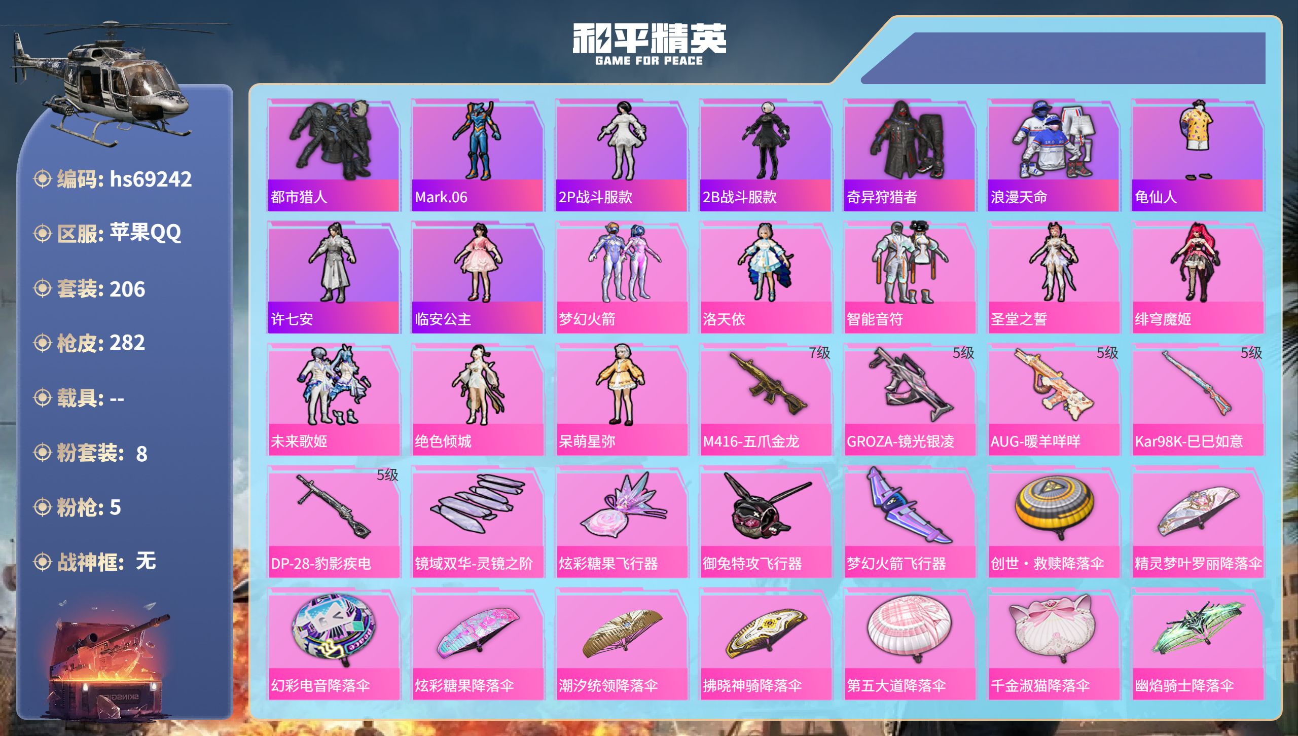 PX_2562338-,苹果手Q-11王牌印记-8粉装-5特效枪-81322热力值-206套装-282枪皮-3卓越印记 【8粉装】角色-绝色倾城,套装-智能音符,角色-洛天依,角色-呆萌星弥,套装-未来歌姬,套装-梦幻火箭,角色-圣堂之誓,角色-绯穹魔姬 【5特效枪】Kar98K-巳巳如意/5级,AUG-暖羊咩咩/5级,GROZA-镜光银凌/5级,M416-五爪金龙/7级,DP-28-豹影疾电/5级 【9稀有紫装】都市猎人,Mark.06,2P战斗服款,2B战斗服款,奇异狩猎者,浪漫天命,龟仙人,许七安,临安公主 【206稀有时装】梦幻火箭,洛天依,智能音符,圣堂之誓,绯穹魔姬,未来歌姬,绝色倾城,呆萌星弥,都市猎人,浪漫天命,奇异狩猎者,龟仙人,Mark.06,2B战斗服款,2P战斗服款,大橘为重,狂沙舞者,Alan,Walker,萌趣咩咩,海上生明月,龙魂突击队,异域银装,白糯汤圆,街头风暴,星途旅人,冰河战士,鱼渊荷华,青团波波,燕燕于飞,临安公主,战术大师,智谋强哥,许七安,雏菊兔兔,糖糖葫芦,香桃花海,米开朗基罗,蝶变,巳巳如意,粉恋花,元素星魂,极速光影,炫彩糖果,萌鸡速递,元气之梦,薄荷星砂,顶瓜瓜,冰公主,雪国风尚,蓝冰羽,恋语绒绒,孙斩天,紫幽梦,SS35特训,SS29特训,萝兰蝴蝶,SS31特训,SS33特训,SS32特训,SS16特训,SS36特训,焰鹰斗篷,金鼠迎春,童真绒兔,虎虎生威吉莉,夏日音浪,龙的传人,潮流炫酷,SS8特训,甜梦熊熊,萌黄之夏,SS37特训,蝶吟花词,SS28特训,特训学院,猎鹰,青年教官,暗黑骑手,橘黑制服,红色运动,黄色运动,蓝色运动,黄色伏地魔,白色伏地魔,热血青春,SS9特训,酒红色名流,阳光火鸡,湖蓝色名流,黄色名流,酷潮明星,绯格组合,涂山之恋,SS26特训,漫步者,空岛之星,热情海星,黑色伏地魔,黎明保卫者,炫蓝之夏,纯真浪花,SS34特训,骑行爱好者,竞技名士,蓝色守护者,深蓝色名流,灰色守护者,猛禽,SS30特训,长空猛禽,时尚圣诞,特战装甲,旭日情侣,街头潮人,怒火燎原,冷焰舞者,惊鸿侠骨,魅力单车,灼焰舞者,夜莺强袭者,甜心亚梦,虚音幻奏,贵族骑装,幻世战舞者,战地督导,青涩时光,牛气满满,迎春赐吉,娇憨猪猪,风暴特警,冰川特警,龙腾端午,极速红龙,狙击之神,沙漠毒蛇,麻辣教官,鹰眼刺客,冰冻风暴,梦之呓语,完美偶像,人气偶像,幻影武者,青春冒险家,破蛋小黄鸡,潮流游乐家,特战英豪,玄武圣者,蓝彩潮人,绮丽涂鸦,骁骑迪迦,竞技达人朋克,超能勇士,逆风勇士,海岛探路者,破晓战魂,霓虹街区,森林游猎者,都市魅力,萌趣颜团子,耀粉歌者,探宝勇士,SS27特训,SS18特训,治愈之星,银白舞王,清新柠檬,科技之星,SS17特训,瑞龙福将,团圆交子,异彩先驱,霓虹极客,空投萌叽,金戈铁马,SS19特训,光之冒险,SS20特训,血色贵族,SS21特训,玉兔迎春,SS22特训,SS23特训,摩登艾咪,夏日倾情,缤纷果语,滨海厨神,香榭午后,SS14特训,天籁歌者,电音精灵,神气柴柴,妙红点点,幻彩翩翩,幻羽潜行,海盐绵绵冰,老实芭蕉,吉莉礼服,旷野奇兵,王牌教练,荣耀,柠萌假日,SS24特训,懵萌河马,SS25特训,锦衣飞扬,SS15特训 【282稀有枪械】M416-五爪金龙/7级,GROZA-镜光银凌/5级,AUG-暖羊咩咩/5级,Kar98K-巳巳如意/5级,DP-28-豹影疾电/5级,QBZ-纯真浪花,AWM-纯真浪花,汤姆逊-纯真浪花,DBS-乌木金纹,AA12-G-纯真浪花,平底锅-纯真浪花,突击盾牌-初号机,觉醒Ver.,SCAR-L-海盐豹豹,平底锅-精灵梦叶罗丽,野牛-雏菊兔兔,Mk14-冰河战士,SPAS-12-行星泡泡,平底锅-雏菊兔兔,M762-雏菊兔兔,Mini14-雏菊兔兔,Famas-突变脉冲,Vector-突变脉冲,R1895-雏菊兔兔,M416-极冰使者,UZI-冰河战士,M16A4-冰河战士,MK20-H-乌木金纹,Mini14-鸡智如我,AKM-绿洲时空,Win94-乌木金纹,MK12-乌木金纹,PKM-紫幽梦,R45-幻彩电音,Mk14-幻星舰长,Mk14-紫幽梦,蜜獾-乌木金纹,S1897-紫幽梦,P92-紫幽梦,AWM-绿洲时空,SPAS-12-狂鲨锋刃,M417-玩趣呆呆,铝热弹-炫彩糖果,UZI-炫彩糖果,UMP45-绿洲时空,平底锅-紫幽梦,AKS-74U-乌木金纹,Famas-乌木金纹,M249-无面战甲,破片手榴弹-拽到爆炸,十字弩-异瞳寒姬,S1897-糯团青竹,信号枪-异瞳寒姬,Mk14-薄荷星砂,汤姆逊-智耀战神,MG-36-薄荷星砂,SCAR-L-绿洲时空,S1897-荧海星豚,SLR-霓彩脉冲,平底锅-属我最6,大砍刀-冰澜龙吟,蜜獾-鸡智如我,AMR-鸡智如我,M416-红色方程式,M416-蓝色火焰,M416-糯团青竹,M416-诡夜天鹅,AKM-影袭,AKM-夜灯,AKM-百万伏特,AKM-奇异狩猎者,AKM-彩虹符号,AKM-破晓战魂,AKM-江南烟雨,AKM-龙的传人,AKM-2P战斗服款,AKM-灼热熔岩,AKM-萌趣颜团子,AKM-霓虹街区,SCAR-L-红色方程式,SCAR-L-玉兔迎春,SCAR-L-未来战士,SCAR-L-夜灯,SCAR-L-炫彩节奏,M16A4-红色方程式,M16A4-蓝色火焰,M16A4-幻世战舞者,M16A4-甜心亚梦,GROZA-乌木金纹,GROZA-异彩先驱,GROZA-影袭,GROZA-懵萌河马,GROZA-彩虹符号,GROZA-马卡龙,GROZA-治愈之星,AUG-耀粉歌者,AUG-甜蜜菠萝,AUG-炫光贝贝,AUG-青春冒险家,AUG-天降萌叽,QBZ-神秘黑猫,QBZ-洛神天依,QBZ-原初圣火,QBZ-乌木金纹,QBZ-彩虹符号,M762-瑞龙福将,M762-镭射皇者,M762-牛气冲天,M762-天星战神,M762-天降萌叽,Mk47-乌木金纹,Mk47-妙红点点,Mk47-洛神天依,Mk47-青春冒险家,G36C-乌木金纹,G36C-懵萌河马,AC-VAL-天降萌叽,AC-VAL-甜心亚梦,AC-VAL-乌木金纹,蜜獾-天降萌叽,蜜獾-娇憨猪猪,Kar98K-乌木金纹,Kar98K-蓝莓炮弹,Kar98K-红色方程式,Kar98K-洛神天依,Kar98K-彩虹符号,Kar98K-影袭,M24-乌木金纹,M24-影袭,M24-奇异狩猎者,M24-治愈之星,M24-未来战士,M24-炫彩节奏,AWM-乌木金纹,AWM-焰鹰斗篷,AWM-垂柳戏鸭,Win94-瑞龙福将,Win94-粉樱探戈,莫辛纳甘-蜜语绒猫,莫辛纳甘-乌木金纹,莫辛纳甘-懵萌河马,AMR-乌木金纹,AMR-妙红点点,M200-惊鸿侠骨,SKS-糯团青竹,SKS-未来歌姬,SKS-