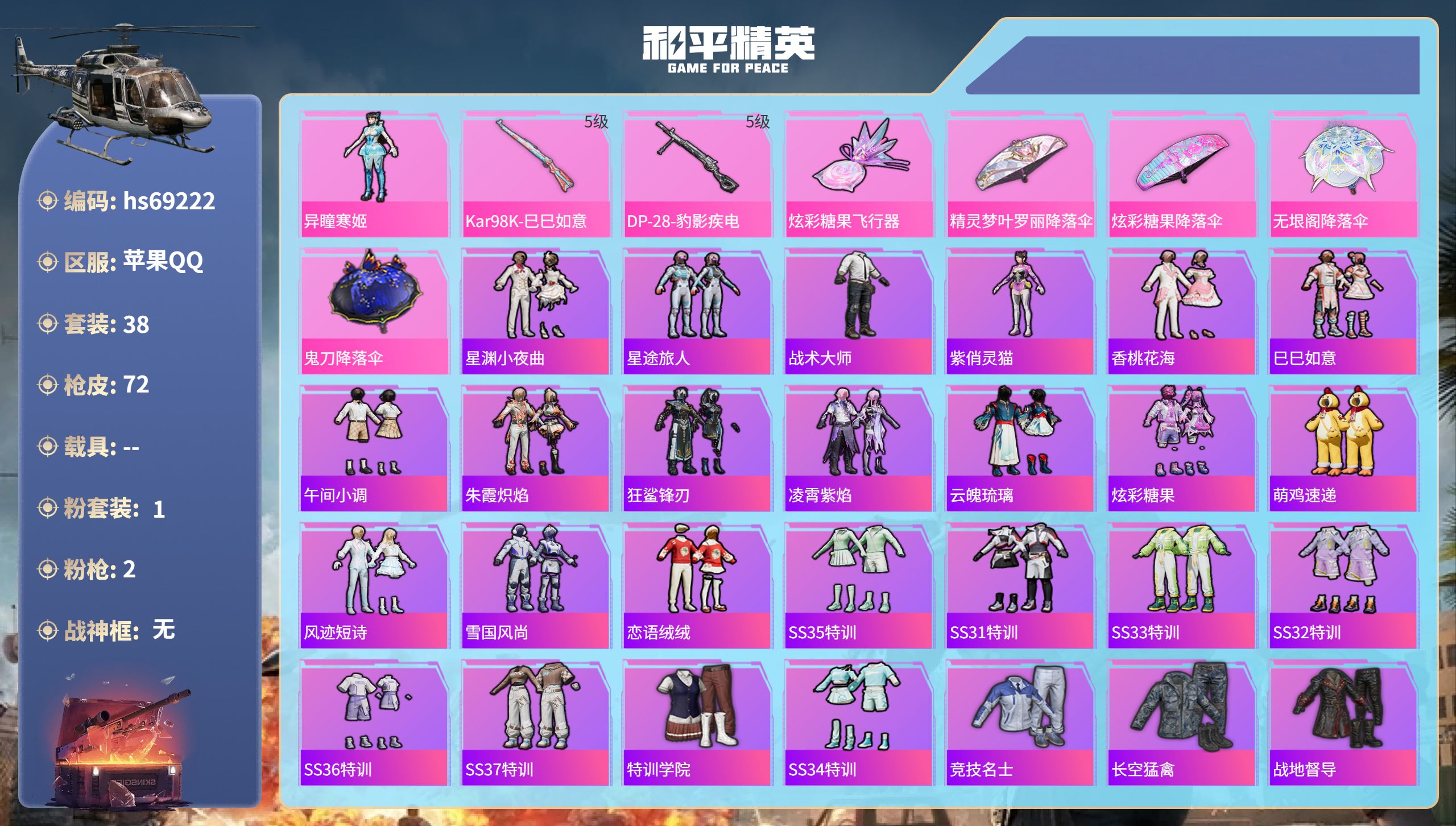 PX_2562303-,苹果手Q-3王牌印记-1粉装-2特效枪-16720热力值-38套装-72枪皮-2卓越印记 【1粉装】角色-异瞳寒姬 【2特效枪】DP-28-豹影疾电/5级,Kar98K-巳巳如意/5级 【38稀有时装】异瞳寒姬,星渊小夜曲,星途旅人,战术大师,紫俏灵猫,香桃花海,巳巳如意,午间小调,朱霞炽焰,狂鲨锋刃,凌霄紫焰,云魄琉璃,炫彩糖果,萌鸡速递,风迹短诗,雪国风尚,恋语绒绒,SS35特训,SS31特训,SS33特训,SS32特训,SS36特训,SS37特训,特训学院,SS34特训,竞技名士,长空猛禽,战地督导,玲珑侠影,幻影武者,破蛋小黄鸡,疯狂小兔子,蓝彩潮人,竞技达人朋克,幻世保卫者,耀粉歌者,老实芭蕉,柠萌假日 【72稀有枪械】Kar98K-巳巳如意/5级,DP-28-豹影疾电/5级,DBS-风迹短诗,莫辛纳甘-风迹短诗,Win94-乌木金纹,MK12-风迹短诗,MK12-乌木金纹,MG3-霓彩脉冲,蜜獾-乌木金纹,SPAS-12-狂鲨锋刃,MK20-H-狂鲨锋刃,铝热弹-炫彩糖果,UZI-炫彩糖果,G36C-星穹咏叹调,M249-冰晶雪宝,Mk47-风迹短诗,JS9-凌霄紫焰,MG-36-凌霄紫焰,破片手榴弹-海盐豹豹,UMP45-海盐豹豹,ARX-凌霄紫焰,AKS-74U-乌木金纹,蜜獾-风迹短诗,P92-凌霄紫焰,Famas-乌木金纹,Famas-霓彩脉冲,M249-无面战甲,破片手榴弹-拽到爆炸,十字弩-异瞳寒姬,平底锅-凌霄紫焰,MG-36-薄荷星砂,SVD-霓彩脉冲,SLR-霓彩脉冲,平底锅-属我最6,S12K-霓彩脉冲,AKM-霓彩脉冲,M416-红色方程式,M416-蓝色火焰,AKM-破晓战魂,SCAR-L-红色方程式,SCAR-L-玉兔迎春,SCAR-L-炫彩节奏,M16A4-红色方程式,M16A4-蓝色火焰,AUG-耀粉歌者,M762-彩虹符号,M762-天降萌叽,Kar98K-红色方程式,AWM-天降萌叽,SKS-炫彩节奏,Mini14-耀粉歌者,UZI-天降萌叽,UZI-啾咪啾咪,UMP45-蓝色火焰,UMP45-生命誓言,汤姆逊-耀粉歌者,汤姆逊-天降萌叽,S686-红色方程式,S12K-破晓战魂,M249-破晓战魂,MG3-幻世战舞者,平底锅-光之冒险,ACE32-冰晶雪宝,燃点复合弓-罪夜之冕,M200-乌木金纹,S686-巳巳如意,SPAS-12-乌木金纹,GROZA-福马献瑞,SLR-乌木金纹,燃烧瓶-福马献瑞,P90-巳巳如意,破片手榴弹-巳巳如意 【6稀有飞行器】狂鲨锋刃飞行器,马上有福飞行器,鸡智如我飞行器,炫彩糖果飞行器,破刃行动尾迹,异域银装飞行器 【9稀有背包】狂鲨锋刃背包(3级),绝对恒星背包(3级),炫彩糖果背包(3级),异瞳寒姬背包(3级),粉黛兰香背包(3级),萌鸡速递背包(3级),异域银装背包(3级),海渊国主背包(3级),智谋强哥背包(3级) 【17稀有降落伞】精灵梦叶罗丽降落伞,SS35王牌降落伞,SS36王牌降落伞,炫彩糖果降落伞,狂鲨锋刃降落伞,无垠阁降落伞,凌霄紫焰降落伞,风迹短诗降落伞,都市猎人降落伞,普通降落伞,鬼刀降落伞,异域银装降落伞,SS31王牌降落伞,寂夜之火降落伞,小狗蛇点点降落伞,香桃花海降落伞,勇者同行降落伞 【8稀有头盔】雪国风尚头盔(3级),狂鲨锋刃头盔(3级),炫彩糖果头盔(3级),异瞳寒姬头盔(3级),粉黛兰香头盔(3级),萌鸡速递头盔(3级),绝对恒星头盔(3级),异域银装头盔(3级)