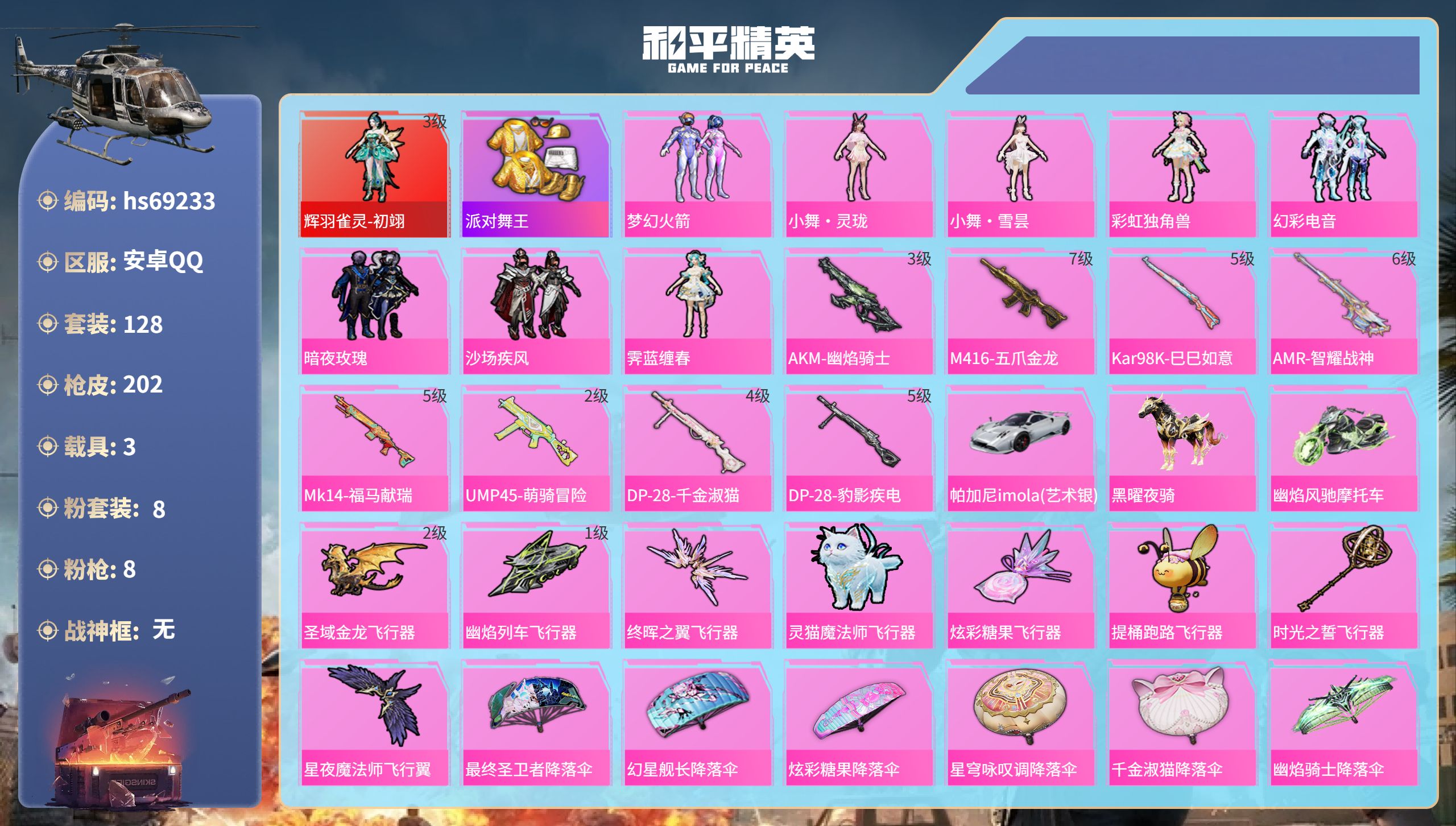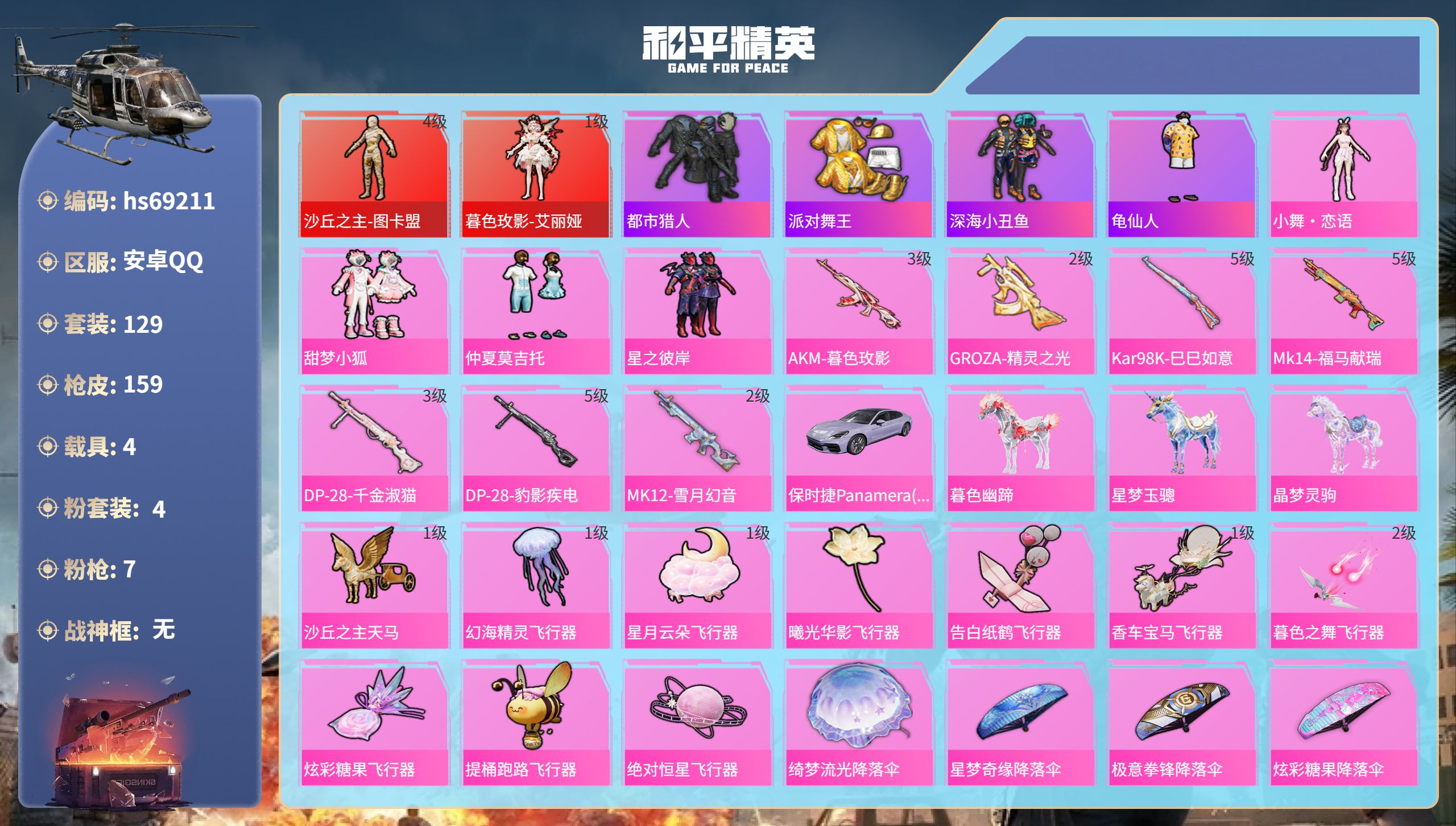 PX_2562333-,安卓手Q-8王牌印记-2红装-4粉装-7特效枪-4载具-59940热力值-129套装-159枪皮-5卓越印记-2传奇印记 【2红装】沙丘之主-图卡盟/4级,暮色玫影-艾丽娅/1级 【4粉装】套装-甜梦小狐,套装-仲夏莫吉托,套装-星之彼岸,人物-小舞·恋语 【7特效枪】Mk14-福马献瑞/5级,MK12-雪月幻音/2级,AKM-暮色玫影/3级,DP-28-千金淑猫/3级,DP-28-豹影疾电/5级,GROZA-精灵之光/2级,Kar98K-巳巳如意/5级 【4稀有紫装】都市猎人,派对舞王,深海小丑鱼,龟仙人 【4稀有载具】保时捷Panamera(星辰紫),暮色幽蹄,星梦玉骢,晶梦灵驹 【128稀有时装】图卡盟/4级,艾丽娅/1级,小舞·恋语,甜梦小狐,仲夏莫吉托,星之彼岸,迅捷龙虾,SS38特训,都市猎人,龟仙人,深海小丑鱼,派对舞王,萌神柯基,粉雾星云,软软马卡龙,晶灵使者,龙魂突击队,异域银装,都市丽猫,摩登魅猫,白糯汤圆,绒宝小鹅,街头风暴,蜜桃派对,冰河战士,鱼渊荷华,大橘大利,燕燕于飞,战术大师,智谋强哥,晶辉守护,香桃花海,巳巳如意,粉恋花,元素星魂,午间小调,彩虹兔,琴音绮想,雪绒豹,画境星梦,朱霞炽焰,狂鲨锋刃,阳光菠萝,游乐,凌霄紫焰,粉黛兰香,云魄琉璃,擎苍青焰,炫彩糖果,萌鸡速递,小鸟芋圆,元气之梦,风迹短诗,甜心蒙太奇,超能元气,漫游都市,薄荷星砂,秘语星愿,超感刻度,云朵鹅,顶瓜瓜,雪国风尚,蓝冰羽,恋语绒绒,青翼流星,紫幽梦,马上来财,晨曦轻云,SS35特训,SS31特训,SS33特训,SS32特训,SS36特训,龙的传人,SS8特训,SS37特训,海滨突袭者,顽皮橙,登山爱好者,湖蓝色名流,黄色名流,酷潮明星,顽皮玉兔,绯格组合,暖暖麦兜,漫步者,黑色伏地魔,SS34特训,竞技名士,猛禽,长空猛禽,竞技勇士朋克,旭日情侣,怒火燎原,魅力单车,灼焰舞者,极地朋克,幻世战舞者,青涩时光,牛气满满,冰川特警,狙击之神,红釉青花,鹰眼刺客,雨过天青,福马献瑞,冰冻风暴,玲珑侠影,人气偶像,破蛋小黄鸡,疯狂小兔子,暗金炫舞,北国孤狼,蓝彩潮人,SS6特训,竞技达人朋克,烈火街头,耀粉歌者,奇趣章鱼,光之冒险,玉兔迎春,夏日倾情,缤纷果语,莱茵河畔,SS14特训,格斗先锋,海盐绵绵冰,王牌教练 【159稀有枪械】AKM-暮色玫影/3级,GROZA-精灵之光/2级,Kar98K-巳巳如意/5级,Mk14-福马献瑞/5级,DP-28-千金淑猫/3级,DP-28-豹影疾电/5级,MK12-雪月幻音/2级,UZI-梦海之灵,DBS-乌木金纹,MK20-H-星梦奇缘,Mk14-冰河战士,UZI-冰河战士,M16A4-冰河战士,MK20-H-乌木金纹,DBS-风迹短诗,莫辛纳甘-风迹短诗,Win94-乌木金纹,MK12-风迹短诗,MK12-乌木金纹,破片手榴弹-爆破雪人,PKM-紫幽梦,MG3-霓彩脉冲,ACE32-画境星梦,M1加兰德-画境星梦,MP5K-画境星梦,Mk14-紫幽梦,蜜獾-乌木金纹,M762-云朵鹅,S1897-紫幽梦,SVD-云朵鹅,P92-紫幽梦,SPAS-12-狂鲨锋刃,M417-玩趣呆呆,MK20-H-狂鲨锋刃,AUG-冰晶雪宝,突击盾牌-绝对恒星,铝热弹-炫彩糖果,UZI-炫彩糖果,ARX-像素花束,大砍刀-像素花束,AA12-G-画境星梦,平底锅-画境星梦,M249-冰晶雪宝,Mk47-风迹短诗,JS9-凌霄紫焰,MG-36-凌霄紫焰,平底锅-紫幽梦,破片手榴弹-海盐豹豹,UMP45-海盐豹豹,ARX-凌霄紫焰,AKS-74U-乌木金纹,AKM-涂鸦街区,蜜獾-风迹短诗,P92-凌霄紫焰,Famas-乌木金纹,Famas-霓彩脉冲,SPAS-12-云朵鹅,M249-无面战甲,破片手榴弹-拽到爆炸,S1897-糯团青竹,平底锅-凌霄紫焰,Mk14-薄荷星砂,AKS-74U-鸡智如我,沙漠之鹰-云朵鹅,TMP-9-雪月幻音,烟雾弹-冰氧夏日,MG-36-薄荷星砂,大砍刀-云朵鹅,PKM-啾咪啾咪,爆炸猎弓-雪月幻音,SLR-霓彩脉冲,平底锅-属我最6,SCAR-L-彩虹符号,S686-雪月幻音,S12K-霓彩脉冲,AKM-霓彩脉冲,M416-红色方程式,AKM-影袭,AKM-夜灯,AKM-破晓战魂,AKM-龙的传人,AKM-霓虹街区,SCAR-L-玉兔迎春,SCAR-L-夜灯,SCAR-L-生命誓言,GROZA-影袭,AUG-甜蜜菠萝,Kar98K-彩虹符号,Kar98K-影袭,M24-影袭,SKS-乌木金纹,SKS-糯团青竹,Mini14-生命誓言,UZI-炫彩节奏,UZI-影袭,UZI-天降萌叽,UZI-啾咪啾咪,UMP45-夜灯,Vector-乌木金纹,Vector-生命誓言,汤姆逊-天降萌叽,汤姆逊-炫彩节奏,野牛-沙丘之主,MP5K-乌木金纹,P90-乌木金纹,P90-玩趣呆呆,S686-生命誓言,S1897-炫彩节奏,S12K-夜灯,M249-彩虹符号,M249-沙丘之主,M249-乌木金纹,DP-28-彩虹符号,撬棍-沙丘之主权杖,GROZA-暮色玫影,AWM-暮色玫影,AA12-G-橘猫汽水,撬棍-暮色玫影,撬棍-冰晶雪宝,M417-虹云熊熊,烟雾弹-小舞,蝎式手枪-千金淑猫,M16A4-千金淑猫,S686-千金淑猫,ACE32-冰晶雪宝,爆炸猎弓-回旋牧梦使,AUG-异域银装,汤姆逊-樱桃泡泡,MK20-H-樱桃泡泡,M24-樱桃泡泡,野牛-燕燕于飞,M200-乌木金纹,SPAS-12-燕燕于飞,蝎式手枪-燕燕于飞,十字弩-异域银装,S686-巳巳如意,SPAS-12-乌木金纹,Vector-燕燕于飞,十字弩-燕燕于飞,AKS-74U-鬼刀,G36C-霁蓝缠春,M16A4-雨过天青,GROZA-福马献瑞,蜜獾-启元战纹,AMR-雨过天青,PKM-小狗蛇点点,SLR-乌木金纹,AA12-G-雨过天青,PKM-雨过天青,沙漠之鹰-雨过天青,燃烧瓶-福马献瑞,P90-紫矿核心,Mk47-虹云熊熊,VSS-香桃花海,GROZA-晶梦幻蝶,蝎式手枪-虹云熊熊,汤姆逊-像素花束,P90-巳巳如意,破片手榴弹-巳巳如意 【17稀有飞行器】沙丘之主天马/1级,幻海精灵飞行器/1级,星月云朵飞行器/1级,曦光华影飞行器,狂鲨锋刃飞行器,马上有福飞行器,告白纸鹤飞行器,香车宝马飞行器/1级,暮色之舞飞行器/2级,鸡智如我飞行器,炫彩糖果飞行器,登顶巅峰飞行器,破刃行动尾迹,提桶跑路飞行器,绝对恒星飞行器,冰柠泡泡飞行器,异域银装飞行器 【28稀有背包】狂鲨锋刃背包(3级),绝对恒星背包(3级),画境星梦背包(3级),炫彩糖果背包(3级),凌霄紫焰背包(3级),粉黛兰香背包(3级),星月