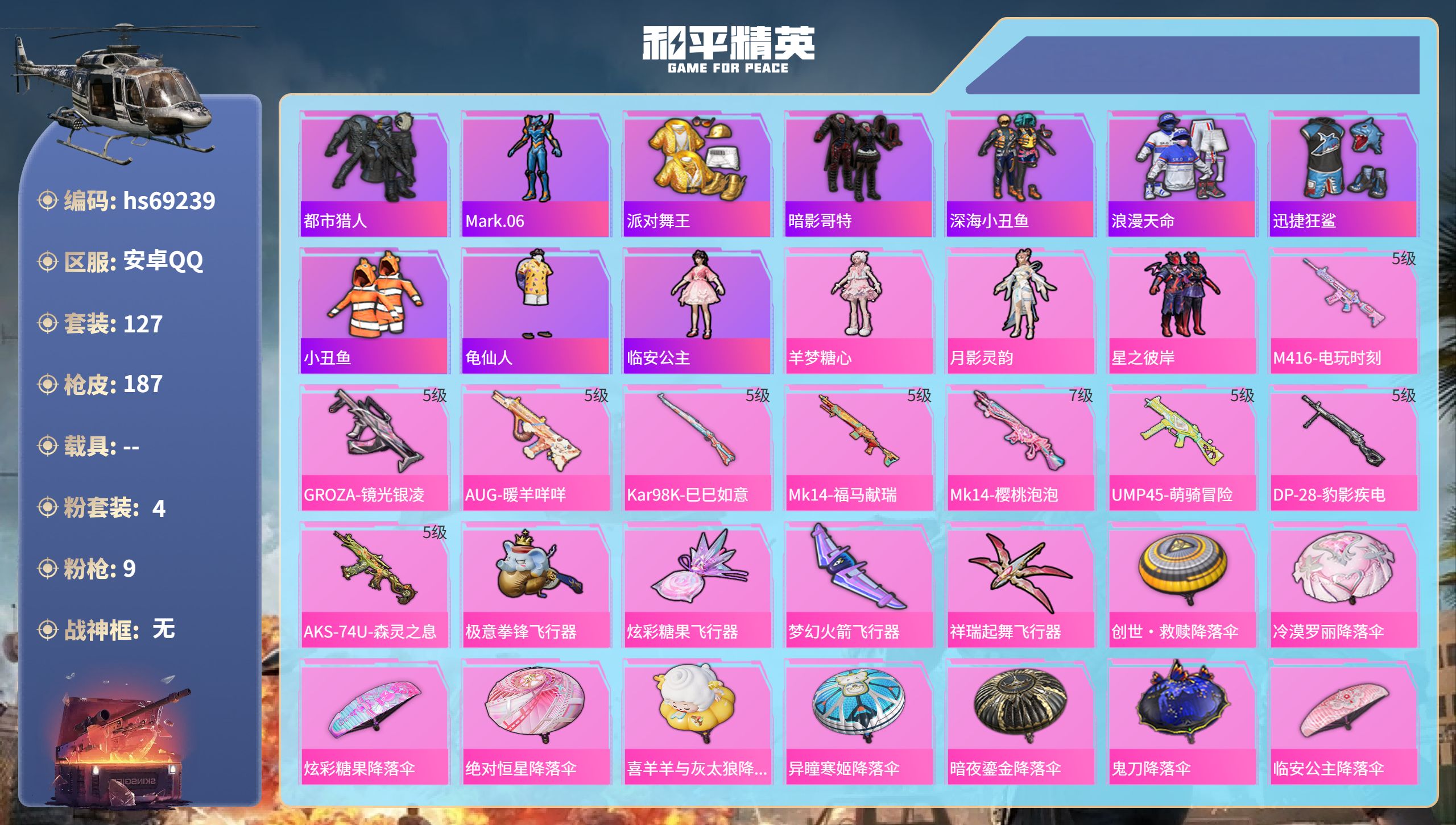 PX_2562305-,安卓手Q-4王牌印记-4粉装-9特效枪-55156热力值-127套装-187枪皮-3卓越印记-1传奇印记 【4粉装】角色-千织司命,套装-星之彼岸,角色-羊梦糖心,角色-月影灵韵 【9特效枪】AKS-74U-森灵之息/5级,M416-电玩时刻/5级,Kar98K-巳巳如意/5级,UMP45-萌骑冒险/5级,DP-28-豹影疾电/5级,Mk14-樱桃泡泡/7级,GROZA-镜光银凌/5级,Mk14-福马献瑞/5级,AUG-暖羊咩咩/5级 【10稀有紫装】都市猎人,Mark.06,派对舞王,暗影哥特,深海小丑鱼,浪漫天命,迅捷狂鲨,小丑鱼,龟仙人,临安公主 【123稀有时装】羊梦糖心,月影灵韵,星之彼岸,迅捷龙虾,SS38特训,都市猎人,浪漫天命,龟仙人,Mark.06,暗影哥特,深海小丑鱼,小丑鱼,迅捷狂鲨,派对舞王,龙魂突击队,阿虎,小熊娃娃,异域银装,酷勇熊大,绒宝小鹅,街头风暴,星途旅人,鱼渊荷华,青团波波,燕燕于飞,达芬奇,临安公主,风玲,战术大师,智谋强哥,紫俏灵猫,雏菊兔兔,马上有钱,糖糖葫芦,香桃花海,蝶变,巳巳如意,棉花软糖,午间小调,琴音绮想,画境星梦,朱霞炽焰,狂鲨锋刃,夜瞳黯灵,阳光菠萝,游乐,凌霄紫焰,粉黛兰香,擎苍青焰,炫彩糖果,绯色魅影,萌鸡速递,元气之梦,书海巡游,风迹短诗,漫游都市,薄荷星砂,秘语星愿,银尘,雪国风尚,蓝冰羽,恋语绒绒,青翼流星,SS35特训,SS29特训,萝兰蝴蝶,SS31特训,SS33特训,SS32特训,SS36特训,焰鹰斗篷,湖雨初晴,龙的传人,潮流炫酷,SS37特训,猎鹰,黄色运动,白色伏地魔,酒红色名流,阳光火鸡,黄色名流,绯格组合,SS26特训,漫步者,空岛之星,炫蓝之夏,SS34特训,竞技名士,猛禽,SS30特训,长空猛禽,旭日情侣,魅力单车,浪漫假日,幻世战舞者,燃烧卡路里,狙击之神,红釉青花,鹰眼刺客,雨过天青,福马献瑞,冰冻风暴,玲珑侠影,蓝彩潮人,竞技达人朋克,海岛探路者,森林游猎者,耀粉歌者,SS27特训,SS19特训,光之冒险,弄潮海豚,缤纷果语,耀动青春,电音精灵,幻彩翩翩,幻羽潜行,海盐绵绵冰,老实芭蕉,柠萌假日,鹤鸣,快乐星愿,星梦畅游 【182稀有枪械】M416-电玩时刻/5级,GROZA-镜光银凌/5级,AUG-暖羊咩咩/5级,Kar98K-巳巳如意/5级,Mk14-福马献瑞/5级,Mk14-樱桃泡泡/7级,UMP45-萌骑冒险/5级,DP-28-豹影疾电/5级,AKS-74U-森灵之息/5级,突击盾牌-初号机,觉醒Ver.,SCAR-L-海盐豹豹,野牛-雏菊兔兔,蝎式手枪-金丰海韵,Mk14-冰河战士,平底锅-雏菊兔兔,M762-雏菊兔兔,Mini14-雏菊兔兔,R1895-雏菊兔兔,UZI-冰河战士,M16A4-冰河战士,MK20-H-乌木金纹,DBS-风迹短诗,莫辛纳甘-风迹短诗,Win94-乌木金纹,MK12-风迹短诗,M24-快狙起手(快手),MK12-乌木金纹,破片手榴弹-爆破雪人,PKM-紫幽梦,ACE32-画境星梦,M1加兰德-画境星梦,MP5K-画境星梦,M762-登顶巅峰,Mk14-紫幽梦,蜜獾-乌木金纹,S1897-紫幽梦,蜜獾-绯穹魔姬,AWM-绿洲时空,SPAS-12-狂鲨锋刃,MK20-H-狂鲨锋刃,AUG-冰晶雪宝,突击盾牌-绝对恒星,铝热弹-炫彩糖果,UZI-炫彩糖果,ARX-像素花束,UMP45-极意拳锋,大砍刀-像素花束,AA12-G-画境星梦,平底锅-画境星梦,M249-冰晶雪宝,Mk47-风迹短诗,烟雾弹-咒蚀之裁,JS9-凌霄紫焰,MG-36-凌霄紫焰,ARX-凌霄紫焰,AKS-74U-乌木金纹,AKM-涂鸦街区,蜜獾-风迹短诗,爆炸猎弓-喜羊羊与灰太狼,P92-凌霄紫焰,Famas-乌木金纹,Famas-霓彩脉冲,M249-无面战甲,破片手榴弹-拽到爆炸,信号枪-异瞳寒姬,平底锅-凌霄紫焰,烟雾弹-冰氧夏日,Mk14-紫晶流影,MG-36-薄荷星砂,SCAR-L-绿洲时空,PKM-啾咪啾咪,SLR-霓彩脉冲,SCAR-L-彩虹符号,P1911-无面战甲,S12K-霓彩脉冲,AMR-鸡智如我,AKM-霓彩脉冲,AKM-砺玉逐花,M416-红色方程式,M416-糯团青竹,AKM-影袭,AKM-星之彼岸,AKM-破晓战魂,SCAR-L-玉兔迎春,SCAR-L-夜灯,SCAR-L-炫彩节奏,GROZA-影袭,AUG-幻影战神,AUG-耀粉歌者,AUG-甜蜜菠萝,QBZ-彩虹符号,M762-天降萌叽,Mk47-乌木金纹,Mk47-洛神天依,AC-VAL-天降萌叽,蜜獾-天降萌叽,Kar98K-洛神天依,Kar98K-彩虹符号,Kar98K-影袭,M24-乌木金纹,M24-影袭,AWM-焰鹰斗篷,AMR-乌木金纹,VSS-星之彼岸,Mk14-乌木金纹,UZI-炫彩节奏,UZI-红色方程式,UZI-影袭,UZI-天降萌叽,UMP45-蓝色火焰,UMP45-夜灯,Vector-生命誓言,Vector-焰鹰斗篷,汤姆逊-耀粉歌者,汤姆逊-天降萌叽,野牛-乌木金纹,MP5K-乌木金纹,P90-乌木金纹,P90-飞驰魅影,P90-玩趣呆呆,S12K-破晓战魂,S12K-玩趣呆呆,S12K-幻影战神,S12K-夜灯,DBS-焰鹰斗篷,M249-彩虹符号,M249-星之彼岸,M249-妙红点点,DP-28-焰鹰斗篷,MG3-幻世战舞者,平底锅-电音之王,平底锅-妙红点点,平底锅-焰鹰斗篷,撬棍-甜心宝贝,撬棍-幻世战舞者,破片手榴弹-呆爆全场,撬棍-冰晶雪宝,DBS-绿洲时空,MG3-火熔核心,ACE32-冰晶雪宝,AUG-异域银装,UMP45-绒宝小鹅,MK20-H-糖糖葫芦,MK20-H-星途旅人,野牛-燕燕于飞,M200-乌木金纹,SPAS-12-燕燕于飞,蝎式手枪-燕燕于飞,十字弩-异域银装,SCAR-L-星途旅人,大砍刀-鬼刀,S686-巳巳如意,蜜獾-糖糖葫芦,UMP45-糖糖葫芦,SPAS-12-乌木金纹,平底锅-糖糖葫芦,Vector-燕燕于飞,撬棍-信仰神谕,十字弩-燕燕于飞,AKS-74U-鬼刀,AMR-鬼刀,M16A4-雨过天青,GROZA-福马献瑞,蜜獾-启元战纹,AMR-雨过天青,SLR-乌木金纹,AA12-G-雨过天青,PKM-雨过天青,沙漠之鹰-雨过天青,燃烧瓶-福马献瑞,P90-紫矿核心,P18C-糖糖葫芦,GROZA-紫矿核心,SPAS-12-福马献瑞,VSS-香桃花海,Mini14-香桃花海,汤姆逊-像素花束,P90-巳巳如意,破片手榴弹-巳巳如意,ARX-天马神君,DBS-绿洲时空,MG3-火熔核心 【10稀有飞行器】极意拳锋飞行器,狂鲨锋刃飞行器,马上有福飞行器,鸡智如我飞行器,炫彩糖果飞行器,登顶巅峰飞行器,招财竹蜻蜓飞行器,梦幻火箭飞行器,异域银装飞行器,祥瑞起舞飞行器 【34稀有背包】冷漠罗丽背包(3