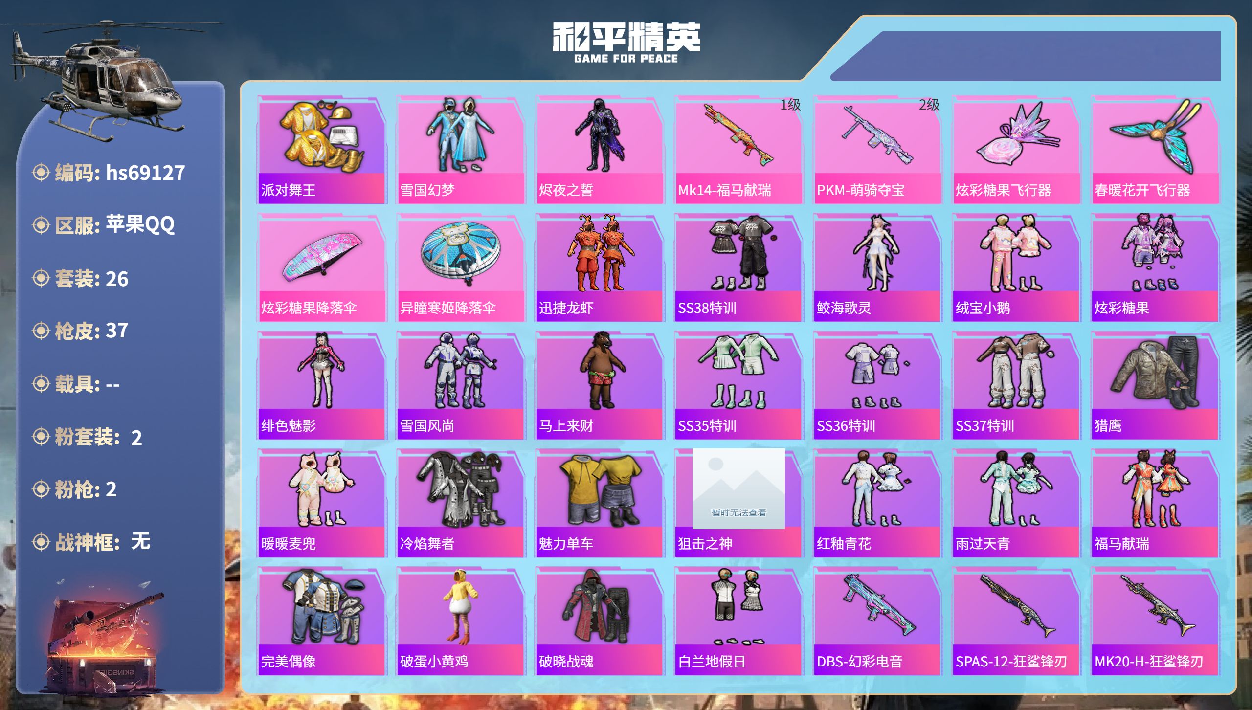 PX_2562340-,苹果手Q-2王牌印记-2粉装-2特效枪-10822热力值-26套装-37枪皮-1卓越印记-1传奇印记 【2粉装】角色-烬夜之誓,套装-雪国幻梦 【2特效枪】PKM-萌骑夺宝/2级,Mk14-福马献瑞/1级 【1稀有紫装】派对舞王 【26稀有时装】雪国幻梦,烬夜之誓,迅捷龙虾,SS38特训,派对舞王,鲛海歌灵,绒宝小鹅,炫彩糖果,绯色魅影,雪国风尚,马上来财,SS35特训,SS36特训,SS37特训,猎鹰,暖暖麦兜,冷焰舞者,魅力单车,狙击之神,红釉青花,雨过天青,福马献瑞,完美偶像,破蛋小黄鸡,破晓战魂,白兰地假日 【38稀有枪械】Mk14-福马献瑞/1级,PKM-萌骑夺宝/2级,Win94-乌木金纹,MK12-乌木金纹,DBS-幻彩电音,SPAS-12-狂鲨锋刃,MK20-H-狂鲨锋刃,AUG-冰晶雪宝,铝热弹-炫彩糖果,UZI-炫彩糖果,ARX-像素花束,大砍刀-像素花束,十字弩-异瞳寒姬,信号枪-异瞳寒姬,MG-36-薄荷星砂,AKM-龙的传人,AUG-甜蜜菠萝,M24-仲夏莫吉托,M200-仲夏莫吉托,SKS-糯团青竹,UZI-红色方程式,DBS-绿洲时空,AC-VAL-荒原烈焰,ACE32-冰晶雪宝,莫辛纳甘-辉光之愿,M16A4-雨过天青,GROZA-福马献瑞,蜜獾-启元战纹,AMR-雨过天青,SLR-乌木金纹,AA12-G-雨过天青,PKM-雨过天青,沙漠之鹰-雨过天青,燃烧瓶-福马献瑞,Vector-荒原烈焰,S12K-辉光之愿,汤姆逊-像素花束,DBS-绿洲时空 【3稀有飞行器】马上有福飞行器,炫彩糖果飞行器,春暖花开飞行器 【9稀有背包】雪国精灵背包(3级),幻彩电音背包(3级),狂鲨锋刃背包(3级),炫彩糖果背包(3级),异瞳寒姬背包(3级),仲夏莫吉托背包(3级),辉光之愿背包(3级),甜蜜菠萝背包(3级),福马献瑞背包(3级) 【8稀有降落伞】SS36王牌降落伞,炫彩糖果降落伞,狂鲨锋刃降落伞,雨过天青降落伞,福马献瑞降落伞,异瞳寒姬降落伞,普通降落伞,勇者同行降落伞 【9稀有头盔】甜蜜菠萝头盔(3级),雪国精灵头盔(3级),雪国风尚头盔(3级),狂鲨锋刃头盔(3级),炫彩糖果头盔(3级),异瞳寒姬头盔(3级),荒原烈焰头盔(3级),辉光之愿头盔(3级),福马献瑞头盔(3级)