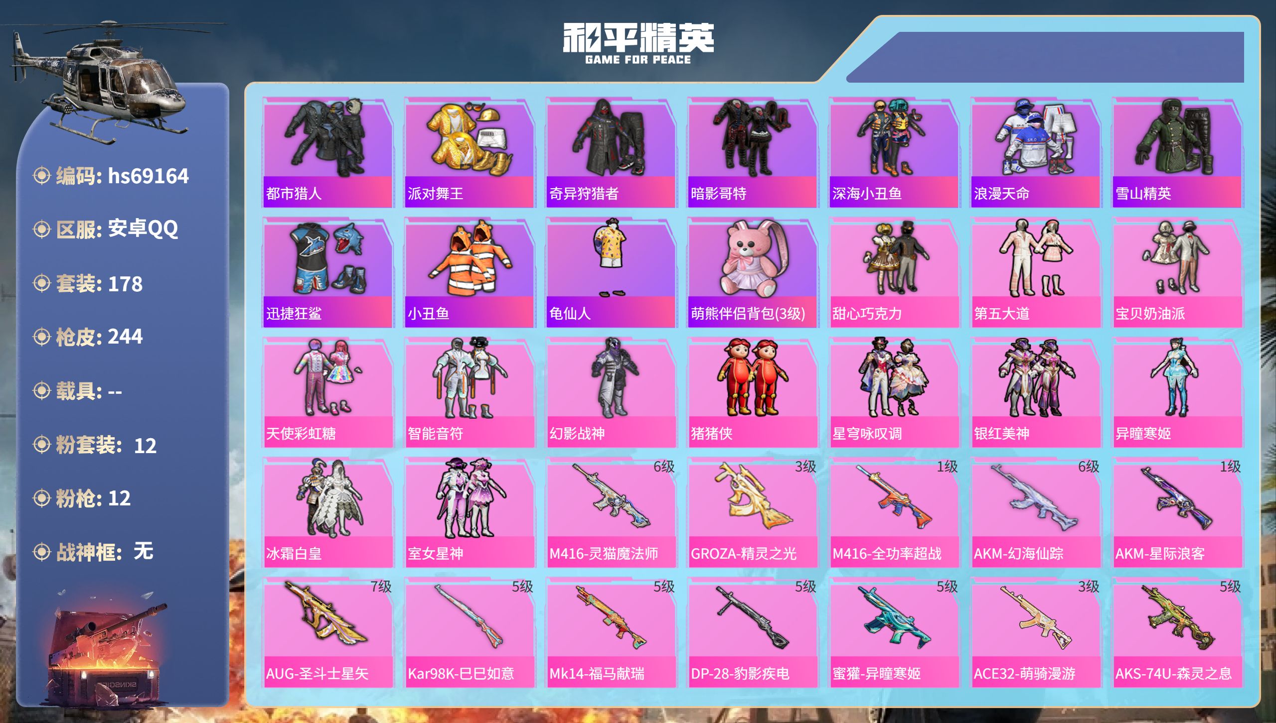 PX_2562335-,安卓手Q-12王牌印记-12粉装-12特效枪-76763热力值-178套装-244枪皮-1卓越印记 【12粉装】套装-宝贝奶油派,套装-天使彩虹糖,套装-冰霜白皇,套装-幻影战神,套装-智能音符,套装-第五大道,套装-室女星神,套装-银红美神,角色-异瞳寒姬,玩偶服-猪猪侠,套装-甜心巧克力,套装-星穹咏叹调 【12特效枪】M416-全功率超战/1级,AUG-圣斗士星矢/7级,M416-灵猫魔法师/6级,DP-28-豹影疾电/5级,AKM-幻海仙踪/6级,ACE32-萌骑漫游/3级,Kar98K-巳巳如意/5级,GROZA-精灵之光/3级,AKS-74U-森灵之息/5级,AKM-星际浪客/1级,蜜獾-异瞳寒姬/5级,Mk14-福马献瑞/5级 【11稀有紫装】都市猎人,派对舞王,奇异狩猎者,暗影哥特,深海小丑鱼,浪漫天命,雪山精英,迅捷狂鲨,小丑鱼,龟仙人,萌熊伴侣背包(3级) 【176稀有时装】甜心巧克力,第五大道,宝贝奶油派,天使彩虹糖,智能音符,幻影战神,猪猪侠,星穹咏叹调,银红美神,异瞳寒姬,冰霜白皇,室女星神,迅捷龙虾,SS38特训,都市猎人,浪漫天命,奇异狩猎者,龟仙人,雪山精英,暗影哥特,深海小丑鱼,小丑鱼,迅捷狂鲨,派对舞王,狂沙舞者,潮萌小黄鸭,粉雾星云,龙魂突击队,异域银装,鱼渊荷华,大橘大利,燕燕于飞,NV战队服,战术大师,紫俏灵猫,香桃花海,湖畔霞光,曼妙人鱼,元素星魂,午间小调,彩虹兔,琴音绮想,霓虹热舞,雪绒豹,画境星梦,朱霞炽焰,狂鲨锋刃,阳光菠萝,美羊羊,凌霄紫焰,炫彩糖果,绯色魅影,萌鸡速递,元气之梦,书海巡游,风迹短诗,薄荷星砂,秘语星愿,云朵鹅,顶瓜瓜,雪国风尚,蓝冰羽,恋语绒绒,青翼流星,紫幽梦,马上来财,风舞幻音,SS35特训,SS29特训,SS31特训,SS33特训,SS32特训,华灯初上,星际旅行,SS36特训,沙丘之歌,焰鹰斗篷,军械专家,龙的传人,潮流炫酷,甜梦熊熊,白熊同盟,青玉碎影,隐空刺,SS37特训,蝶吟花词,SS28特训,猎鹰,黄色运动,蓝色运动,白色伏地魔,冰川格斗者,酒红色名流,绯格组合,涂山之恋,SS26特训,漫步者,空岛之星,热情海星,黑色伏地魔,纯真浪花,SS34特训,竞技名士,猛禽,雨林探路者,长空猛禽,旭日情侣,街头潮人,冷焰舞者,惊鸿侠骨,魅力单车,春光漫游,浪漫假日,极地朋克,贵族骑装,特殊使命,青涩时光,春日漫步,龙腾端午,燃烧卡路里,狙击之神,红釉青花,鹰眼刺客,雨过天青,福马献瑞,冰冻风暴,玲珑侠影,冷酷挑战者,幽夜迷踪,热血骑手,破蛋小黄鸡,摇滚战魂,日照花林,快闪甜心,坚韧舞者,野性战心,海岛探路者,破晓战魂,和煦暖阳,霓虹街区,田园牧歌,轻风白浪,沙漠兵团,奈斯,SS27特训,清新柠檬,飞行日记,蓝调潮人,绚烂繁星,光之冒险,绝对偶像,弄潮海豚,SS22特训,SS23特训,呆萌铁蟹,摩登艾咪,夏日倾情,缤纷果语,香榭午后,电音精灵,神气柴柴,灵蜜圈圈,忍者信条,妙红点点,幻彩翩翩,幻羽潜行,海盐绵绵冰,老实芭蕉,王牌教练,荣耀,柠萌假日,SS24特训,鹤鸣,懵萌河马,SS25特训,锦衣飞扬 【240稀有枪械】M416-灵猫魔法师/6级,GROZA-精灵之光/3级,M416-全功率超战/1级,AKM-幻海仙踪/6级,AKM-星际浪客/1级,AUG-圣斗士星矢/7级,Kar98K-巳巳如意/5级,Mk14-福马献瑞/5级,DP-28-豹影疾电/5级,蜜獾-异瞳寒姬/5级,ACE32-萌骑漫游/3级,AKS-74U-森灵之息/5级,QBZ-纯真浪花,AWM-纯真浪花,汤姆逊-纯真浪花,DBS-乌木金纹,AA12-G-纯真浪花,平底锅-纯真浪花,S1897-精灵梦叶罗丽,MK20-H-星梦奇缘,SCAR-L-海盐豹豹,平底锅-精灵梦叶罗丽,GROZA-海盐豹豹,Mk14-冰河战士,M16A4-冰河战士,MK20-H-乌木金纹,DBS-风迹短诗,莫辛纳甘-风迹短诗,Win94-乌木金纹,MK12-风迹短诗,MK12-乌木金纹,破片手榴弹-爆破雪人,PKM-紫幽梦,DBS-幻彩电音,ACE32-画境星梦,M1加兰德-画境星梦,MP5K-画境星梦,Mk14-紫幽梦,蜜獾-乌木金纹,M762-云朵鹅,S1897-紫幽梦,SVD-云朵鹅,P92-紫幽梦,AWM-绿洲时空,SPAS-12-狂鲨锋刃,M417-玩趣呆呆,MK20-H-狂鲨锋刃,AUG-冰晶雪宝,铝热弹-炫彩糖果,破片手榴弹-咒蚀之裁,UZI-炫彩糖果,撬棍-咒蚀之裁,ARX-像素花束,MG3-鸢尾珑雾,大砍刀-像素花束,AA12-G-画境星梦,平底锅-画境星梦,M249-冰晶雪宝,Mk47-风迹短诗,JS9-凌霄紫焰,MG-36-凌霄紫焰,平底锅-紫幽梦,ARX-凌霄紫焰,AKS-74U-乌木金纹,AKM-涂鸦街区,蜜獾-风迹短诗,P92-凌霄紫焰,Famas-乌木金纹,Famas-霓彩脉冲,SPAS-12-云朵鹅,破片手榴弹-拽到爆炸,十字弩-异瞳寒姬,信号枪-异瞳寒姬,平底锅-凌霄紫焰,Mk14-薄荷星砂,沙漠之鹰-云朵鹅,烟雾弹-冰氧夏日,MG-36-薄荷星砂,大砍刀-云朵鹅,S1897-荧海星豚,SVD-霓彩脉冲,S686-雪月幻音,蜜獾-鸡智如我,S12K-霓彩脉冲,AMR-鸡智如我,AKM-霓彩脉冲,SKS-圣域龙灵,M416-糯团青竹,M416-黄金龙骨,M416-摩登王国,AKM-影袭,AKM-彩虹符号,AKM-缤纷海域,AKM-龙的传人,SCAR-L-红色方程式,SCAR-L-夜灯,SCAR-L-炫彩节奏,M16A4-蓝色火焰,GROZA-影袭,GROZA-田园牧歌,GROZA-懵萌河马,AUG-幻影战神,AUG-闲梦青缨,AUG-天降萌叽,QBZ-彩虹符号,M762-甜心宝贝,M762-天降萌叽,Mk47-妙红点点,Mk47-洛神天依,G36C-懵萌河马,AC-VAL-天降萌叽,AC-VAL-快闪甜心,AC-VAL-乌木金纹,蜜獾-天降萌叽,Famas-璀璨流光,Kar98K-2B战斗服款,Kar98K-幻影战神,Kar98K-影袭,M24-影袭,M24-奇异狩猎者,AWM-天降萌叽,AWM-黄金龙骨,AWM-雷霆特警,AWM-焰鹰斗篷,莫辛纳甘-乌木金纹,莫辛纳甘-懵萌河马,AMR-乌木金纹,AMR-妙红点点,M200-仲夏莫吉托,M200-惊鸿侠骨,SKS-迅猛狂鲨,SKS-心之恋语,SKS-糯团青竹,VSS-田园牧歌,VSS-彩虹符号,Mini14-涂山之恋,Mini14-穿刺龙虾,Mk14-纯梦嫁纱,Mk14-童趣迷兔,SLR-彩虹符号,M417-惊鸿侠骨,MK20-H-快闪甜心,MK20-H-莲影清波,UZI-诡夜天鹅,UZI-影袭,UZI-幻影战神,UZI-天降萌叽,UZI-啾咪啾咪,UMP