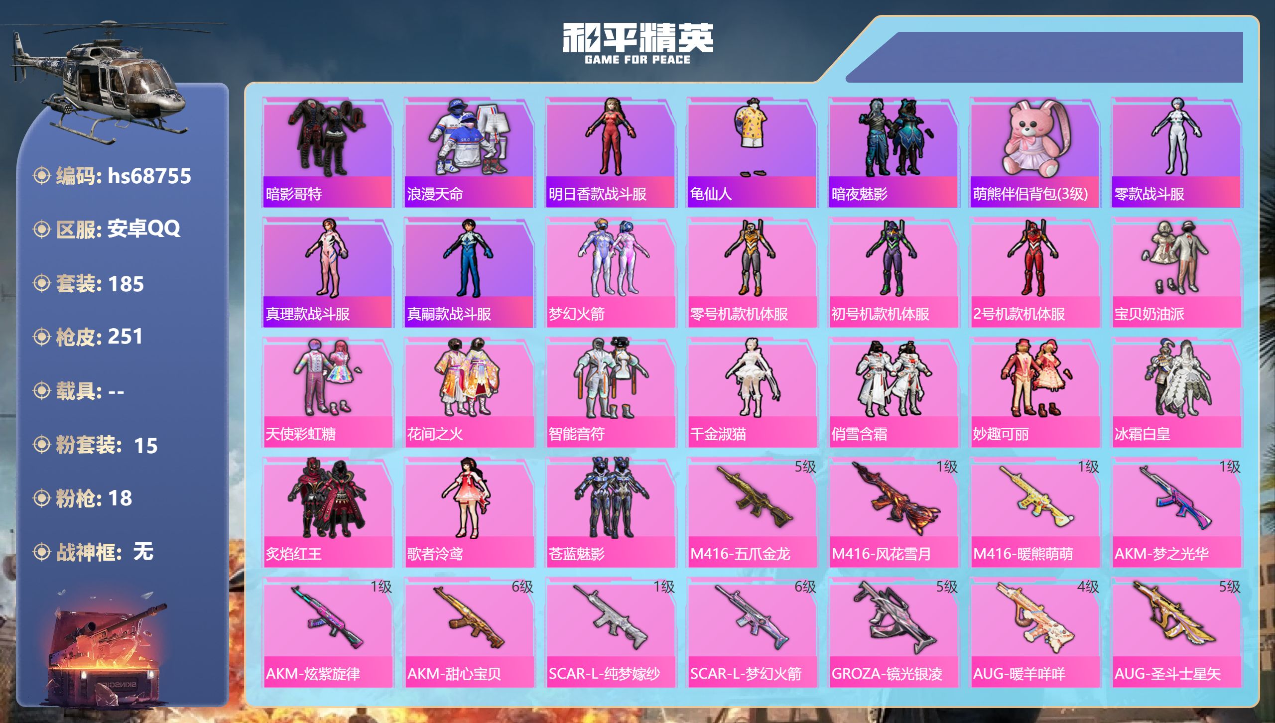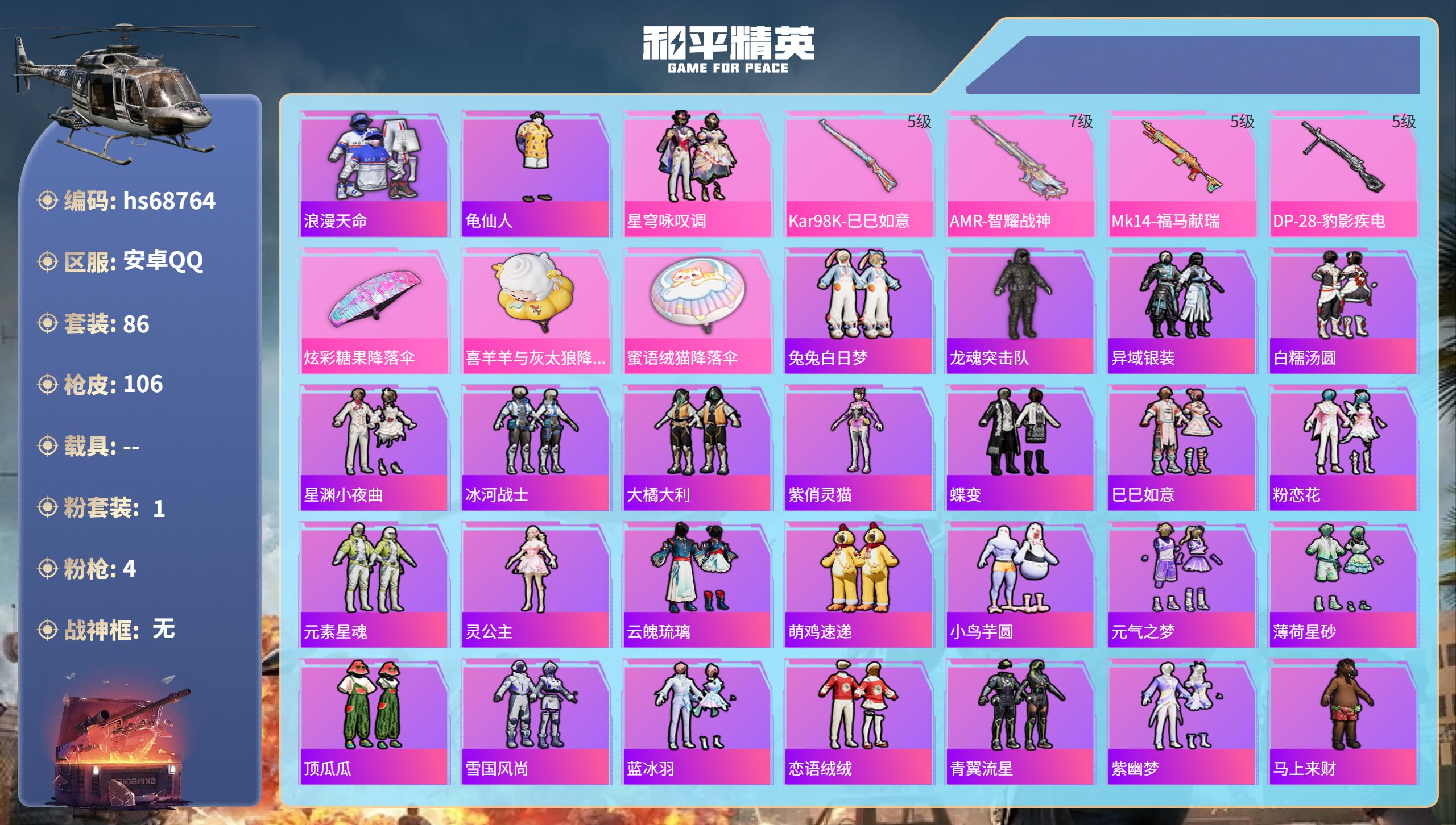 PX_2556503-,安卓手Q-16王牌印记-15粉装-18特效枪-84187热力值-185套装-251枪皮-2卓越印记-1传奇印记 【15粉装】角色-千金淑猫,角色-2号机款机体服,套装-梦幻火箭,角色-初号机款机体服,套装-宝贝奶油派,角色-零号机款机体服,套装-苍蓝魅影,套装-冰霜白皇,套装-智能音符,套装-俏雪含霜,套装-天使彩虹糖,套装-炙焰红王,角色-歌者泠鸢,套装-妙趣可丽,套装-花间之火 【18特效枪】AKM-炫紫旋律/1级,Kar98K-巳巳如意/3级,Mk14-福马献瑞/5级,AKM-甜心宝贝/6级,AUG-暖羊咩咩/4级,M762-激战未来/1级,M416-风花雪月/1级,SCAR-L-梦幻火箭/6级,DP-28-豹影疾电/4级,M416-暖熊萌萌/1级,AUG-圣斗士星矢/5级,UMP45-相思残雪/5级,GROZA-镜光银凌/5级,AWM-花间之火/4级,SCAR-L-纯梦嫁纱/1级,M416-五爪金龙/5级,M762-甜蜜誓约/5级,AKM-梦之光华/1级 【9稀有紫装】暗影哥特,浪漫天命,明日香款战斗服,龟仙人,暗夜魅影,萌熊伴侣背包(3级),零款战斗服,真理款战斗服,真嗣款战斗服 【185稀有时装】梦幻火箭,零号机款机体服,初号机款机体服,2号机款机体服,宝贝奶油派,天使彩虹糖,花间之火,智能音符,千金淑猫,俏雪含霜,妙趣可丽,冰霜白皇,炙焰红王,歌者泠鸢,苍蓝魅影,浪漫天命,龟仙人,暗影哥特,零款战斗服,明日香款战斗服,暗夜行者,狂沙舞者,Alan,Walker,萌神柯基,萌趣咩咩,海上生明月,龙魂突击队,都市丽猫,街头风暴,星途旅人,冰河战士,鱼渊荷华,青团波波,大橘大利,燕燕于飞,真理款战斗服,真嗣款战斗服,马上有钱,糖糖葫芦,蝶变,瑰梦爱神,粉恋花,棉花软糖,薰款战斗服,炫彩糖果,萌鸡速递,蓝海鲸歌,蓝冰羽,恋语绒绒,紫幽梦,暗夜魅影,风舞幻音,SS35特训,SS29特训,SS31特训,SS33特训,SS32特训,SS16特训,暴风机械师,时空追击者,SS36特训,醒狮腾龙,金鼠迎春,福星高照,暗夜契约,虎虎生威吉莉,龙的传人,甜梦熊熊,白熊同盟,青玉碎影,萌黄之夏,SS37特训,击剑大师,蓝色运动,极速竞梦,飞驰魅影,音速流光,热血青春,紫翼圣骑,湖蓝色名流,黄色名流,绯格组合,涂山之恋,SS26特训,漫步者,黑色伏地魔,黎明保卫者,炫蓝之夏,SS34特训,骑行爱好者,竞技名士,覆海蛟龙,SS30特训,长空猛禽,特战装甲,灰色格斗者,六六大吉,软羊咩咩,甜蜜告白,惊鸿侠骨,魅力单车,甜心亚梦,虚音幻奏,贵族骑装,幻世战舞者,特殊使命,醇脆可可,青涩时光,牛气满满,娇憨猪猪,冰川特警,龙腾端午,滨海假日,狙击之神,麻辣教官,鹰眼刺客,福马献瑞,冰冻风暴,完美偶像,青春冒险家,破蛋小黄鸡,潮流游乐家,疯狂小兔子,摇滚舞王,梦幻奶油,绮丽涂鸦,坚韧舞者,野性战心,破晓战魂,和煦暖阳,霓虹街区,田园牧歌,萌趣颜团子,轻风白浪,特种颜团子,沙漠兵团,耀粉歌者,探宝勇士,SS12特训,牛气冲天,迅捷之星,SS18特训,治愈之星,科技之星,SS13特训,飞行日记,SS17特训,瑞龙福将,团圆交子,金耀舞者,蓝调潮人,熠彩粉晶,缤纷焰火,异彩先驱,霓虹极客,空投萌叽,SS19特训,光之冒险,SS20特训,SS21特训,玉兔迎春,SS22特训,SS23特训,呆萌铁蟹,夏日倾情,甜蜜熊情侣,缤纷果语,SS14特训,迪迦奥特曼,神气柴柴,灵蜜圈圈,妙红点点,幻彩翩翩,老实芭蕉,吉莉礼服,王牌教练,荣耀,柠萌假日,微雨春柳,SS24特训,鹤鸣,懵萌河马,SS25特训,锦衣飞扬,SS15特训 【251稀有枪械】M416-五爪金龙/5级,M416-风花雪月/1级,M416-暖熊萌萌/1级,AKM-梦之光华/1级,AKM-炫紫旋律/1级,AKM-甜心宝贝/6级,SCAR-L-纯梦嫁纱/1级,SCAR-L-梦幻火箭/6级,GROZA-镜光银凌/5级,AUG-暖羊咩咩/4级,AUG-圣斗士星矢/5级,M762-甜蜜誓约/5级,M762-激战未来/1级,Kar98K-巳巳如意/3级,AWM-花间之火/4级,Mk14-福马献瑞/5级,UMP45-相思残雪/5级,DP-28-豹影疾电/4级,Mk14-冰河战士,UZI-冰河战士,M16A4-冰河战士,MK20-H-乌木金纹,Win94-乌木金纹,PKM-紫幽梦,MG3-霓彩脉冲,Mk14-紫幽梦,蜜獾-乌木金纹,S1897-紫幽梦,P92-紫幽梦,MK20-H-狂鲨锋刃,AUG-冰晶雪宝,铝热弹-炫彩糖果,UZI-炫彩糖果,平底锅-紫幽梦,UMP45-海盐豹豹,AKS-74U-乌木金纹,Famas-乌木金纹,Famas-霓彩脉冲,破片手榴弹-拽到爆炸,S1897-糯团青竹,汤姆逊-智耀战神,烟雾弹-冰氧夏日,AKS-74U-粉粉喵呜,MG3-智耀战神,SVD-霓彩脉冲,SLR-霓彩脉冲,S12K-霓彩脉冲,AKM-霓彩脉冲,M416-红色方程式,M416-蓝色火焰,M416-糯团青竹,M416-动感兔斯基,M416-绿野极光,M416-绯红前夜,AKM-夜灯,AKM-奇异狩猎者,AKM-生命誓言,AKM-彩虹符号,AKM-冰凉西瓜,AKM-破晓战魂,AKM-龙的传人,AKM-虎虎生威,AKM-萌趣颜团子,AKM-霓虹街区,SCAR-L-红色方程式,SCAR-L-玉兔迎春,SCAR-L-黄金龙骨,SCAR-L-炫彩节奏,M16A4-红色方程式,M16A4-幻世战舞者,M16A4-甜心亚梦,GROZA-异彩先驱,GROZA-影袭,GROZA-田园牧歌,GROZA-懵萌河马,GROZA-彩虹符号,GROZA-罗小黑,GROZA-治愈之星,AUG-甜蜜菠萝,AUG-青春冒险家,AUG-2P战斗服款,AUG-天降萌叽,QBZ-飞驰魅影,QBZ-彩虹符号,M762-瑞龙福将,M762-诡娃娃,M762-绯红前夜,M762-甜心宝贝,M762-奇异狩猎者,M762-第五大道,M762-天星战神,M762-天降萌叽,Mk47-乌木金纹,Mk47-妙红点点,Mk47-青春冒险家,G36C-乌木金纹,G36C-懵萌河马,G36C-时空追击者,AC-VAL-天降萌叽,AC-VAL-甜心亚梦,AC-VAL-乌木金纹,蜜獾-天降萌叽,蜜獾-垂柳戏鸭,蜜獾-娇憨猪猪,Kar98K-乌木金纹,Kar98K-梦幻火箭,Kar98K-电玩视界,Kar98K-飞驰魅影,Kar98K-终极赛罗,Kar98K-炫彩节奏,M24-乌木金纹,M24-歌者泠鸢,M24-影袭,M24-奇异狩猎者,M24-治愈之星,M24-炫彩节奏,AWM-天降萌叽,AWM-乌木金纹,Win94-瑞龙福将,莫辛纳甘-乌木金纹,莫辛纳甘-懵萌河马,AMR-暗夜行者,AMR-乌木金纹,AMR-妙红点点,M200-绿野极光,M200-惊鸿侠骨,SKS-时