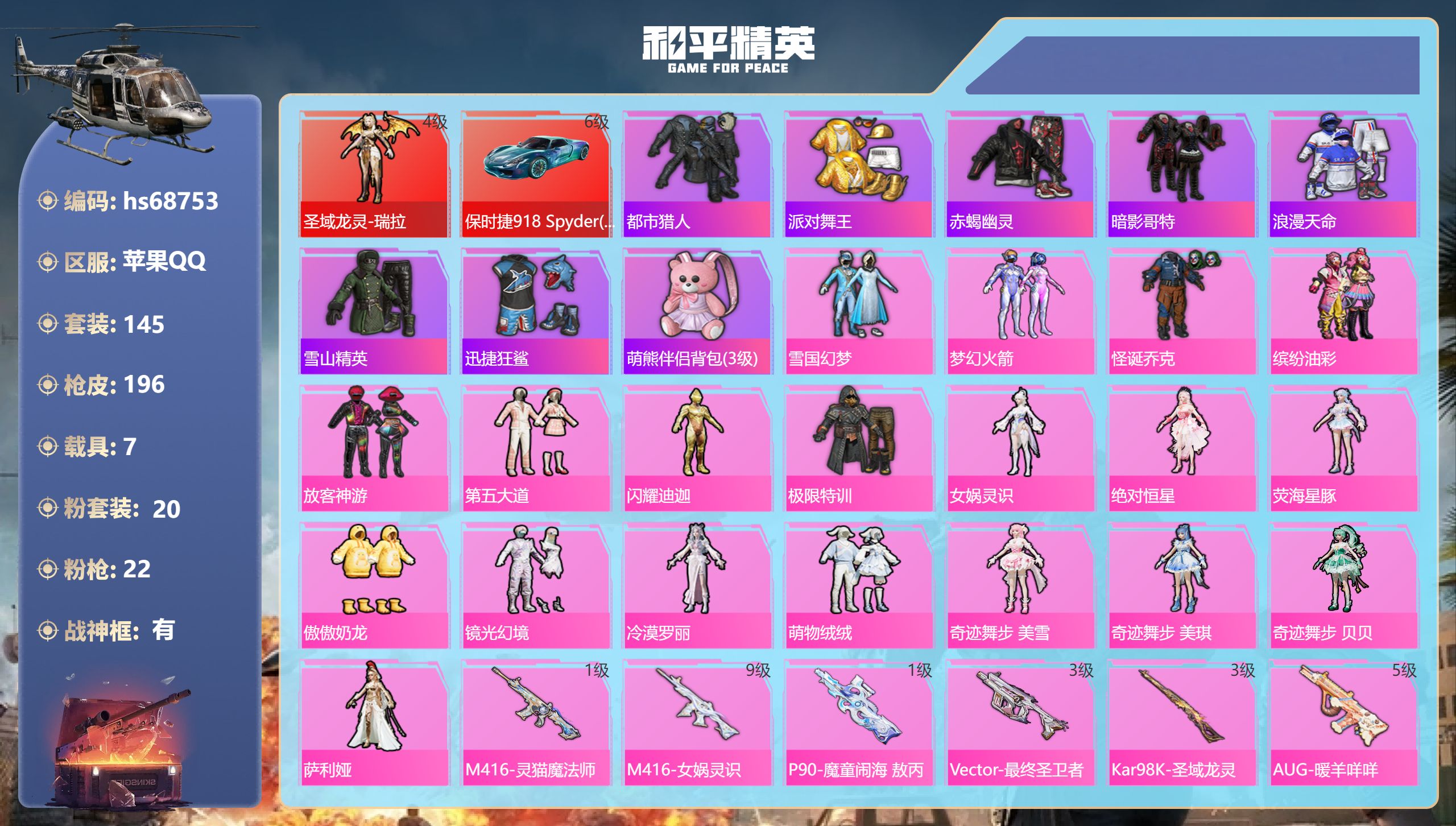 PX_2556504-,苹果手Q-5王牌印记-有战神框-1红装-20粉装-22特效枪-7载具-91975热力值-145套装-196枪皮-5卓越印记-5传奇印记 【1红装】圣域龙灵-瑞拉/4级 【20粉装】套装-萌物绒绒,角色-奇迹舞步,美琪,套装-极限特训,角色-萨利娅,套装-雪国幻梦,套装-傲傲奶龙,套装-怪诞乔克,角色-荧海星豚,套装-梦幻火箭,套装-镜光幻境,角色-冷漠罗丽,角色-女娲灵识,套装-第五大道,角色-奇迹舞步,美雪,套装-放客神游,角色-闪耀迪迦,角色-鸢尾珑雾,套装-缤纷油彩,角色-奇迹舞步,贝贝,角色-绝对恒星 【22特效枪】M416-女娲灵识/9级,撬棍-永恒法杖/7级,Kar98K-巳巳如意/5级,汤姆逊-热量炸弹/5级,Mk14-甜梦熊击/5级,M249-绝对恒星/1级,P90-冷漠罗丽/5级,AUG-暖羊咩咩/5级,M416-灵猫魔法师/1级,Kar98K-圣域龙灵/3级,Mk14-福马献瑞/3级,破片手榴弹-美味星星糖/7级,M417-第五大道/3级,P90-魔童闹海,敖丙/1级,烟雾弹-甜梦果泡/5级,DP-28-豹影疾电/5级,Vector-最终圣卫者/3级,AKS-74U-森灵之息/5级,UMP45-萌骑冒险/3级,M762-鬼刀/2级,MG-36-沧焰双生/5级,Mk14-精灵梦叶罗丽/1级 【8稀有紫装】都市猎人,派对舞王,赤蝎幽灵,暗影哥特,浪漫天命,雪山精英,迅捷狂鲨,萌熊伴侣背包(3级) 【7稀有载具】保时捷918,Spyder(玺耀绿)/6级,拉轰奶龙龙,宝马X6,M(曼岛绿),保时捷911,敞篷版(星珀红),黑曜夜骑,冰绡玉鳞,最终圣卫者摩托车 【1僚机】僚机-萌兔起飞 【142稀有时装】瑞拉/4级,雪国幻梦,梦幻火箭,怪诞乔克,缤纷油彩,放客神游,第五大道,闪耀迪迦,极限特训,女娲灵识,绝对恒星,荧海星豚,傲傲奶龙,镜光幻境,冷漠罗丽,萌物绒绒,奇迹舞步,美雪,奇迹舞步,美琪,奇迹舞步,贝贝,萨利娅,迅捷龙虾,SS38特训,都市猎人,浪漫天命,雪山精英,暗影哥特,迅捷狂鲨,赤蝎幽灵,派对舞王,兔兔白日梦,狂沙舞者,潮萌小黄鸭,软软马卡龙,红熊茄茄,糯粉咩咩,TT猎星队服,荧光绘影,暖阳柴柴,卖崽青蛙,异域银装,蓝调潮影,暗夜风云,纯白跃动,绒宝小鹅,鱼渊荷华,TT战队服,大橘大利,燕燕于飞,AG战队服,海琴烟,风玲,战术大师,紫俏灵猫,晶辉守护,香桃花海,墨青刃影,巳巳如意,粉恋花,午间小调,彩虹兔,时希公主,琴音绮想,乐音,灵公主,夜幕侵蚀,雪绒豹,画境星梦,星影赞美诗,乐游熊熊,朱霞炽焰,狂鲨锋刃,阳光菠萝,游乐,次元竞界,美羊羊,凌霄紫焰,粉黛兰香,擎苍青焰,炫彩糖果,萌鸡速递,荧光像素,小鸟芋圆,元气之梦,书海巡游,风迹短诗,甜心蒙太奇,错位像素,漫游都市,薄荷星砂,秘语星愿,超感刻度,白光莹,云朵鹅,虚空漩涡,顶瓜瓜,雪国风尚,蓝冰羽,恋语绒绒,青翼流星,紫幽梦,马上来财,SS35特训,SS31特训,SS33特训,SS32特训,SS36特训,潮流炫酷,SS37特训,恶魔宝贝,黄色运动,红剪之缘,顽皮玉兔,绯格组合,漫步者,SS34特训,竞技名士,长空猛禽,特战装甲,街头潮人,魅力单车,水银刺客,幻世战舞者,狙击之神,红釉青花,鹰眼刺客,雨过天青,福马献瑞,冰冻风暴,冷酷挑战者,破蛋小黄鸡,摇滚战魂,摇滚舞王,暗金炫舞,光之冒险,弄潮海豚,缤纷果语,莱茵河畔,香榭午后,迪迦奥特曼,赛罗奥特曼,王牌教练,鹤鸣 【191稀有枪械】M416-灵猫魔法师/1级,M416-女娲灵识/9级,P90-魔童闹海,敖丙/1级,Vector-最终圣卫者/3级,Kar98K-圣域龙灵/3级,AUG-暖羊咩咩/5级,M762-鬼刀/2级,Kar98K-巳巳如意/5级,Mk14-甜梦熊击/5级,Mk14-福马献瑞/3级,Mk14-精灵梦叶罗丽/1级,UMP45-萌骑冒险/3级,汤姆逊-热量炸弹/5级,P90-冷漠罗丽/5级,M249-绝对恒星/1级,DP-28-豹影疾电/5级,M417-第五大道/3级,MG-36-沧焰双生/5级,AKS-74U-森灵之息/5级,烟雾弹-甜梦果泡/5级,破片手榴弹-美味星星糖/7级,撬棍-永恒法杖/7级,蜜獾-精灵梦叶罗丽,S1897-精灵梦叶罗丽,平底锅-精灵梦叶罗丽,MK20-H-圣域龙灵,短管霰弹-圣域龙灵,DBS-风迹短诗,莫辛纳甘-风迹短诗,Mini14-鸡智如我,M416-错位像素,AKM-绿洲时空,Win94-乌木金纹,MK12-风迹短诗,MK12-乌木金纹,AKS-74U-荧光像素,SVD-冷漠罗丽,撬棍-冷漠罗丽,烟雾弹-冰澜龙吟,破片手榴弹-爆破雪人,AKS-74U-极光猎影,AKM-灵猫魔法师,PKM-紫幽梦,汤姆逊-灵猫魔法师,撬棍-灵猫魔法师,MG3-霓彩脉冲,QBU-夜幕侵蚀,ACE32-画境星梦,SCAR-L-冷漠罗丽,M1加兰德-画境星梦,MP5K-画境星梦,Mk14-幻星舰长,Mk14-紫幽梦,蜜獾-乌木金纹,M762-云朵鹅,S1897-紫幽梦,SVD-云朵鹅,P92-紫幽梦,AWM-绿洲时空,汤姆逊-错位像素,SPAS-12-狂鲨锋刃,M417-玩趣呆呆,MK20-H-狂鲨锋刃,AUG-冰晶雪宝,突击盾牌-绝对恒星,铝热弹-炫彩糖果,UZI-炫彩糖果,撬棍-咒蚀之裁,UMP45-绿洲时空,ARX-像素花束,AWM-奇迹舞步,信号枪-奇迹舞步,AA12-G-画境星梦,G36C-星穹咏叹调,平底锅-画境星梦,M249-冰晶雪宝,SKS-乐游熊熊,Mk47-风迹短诗,烟雾弹-咒蚀之裁,JS9-凌霄紫焰,MG-36-凌霄紫焰,平底锅-紫幽梦,燃烧瓶-甜梦桃焰,破片手榴弹-海盐豹豹,UMP45-海盐豹豹,ARX-凌霄紫焰,AKS-74U-乌木金纹,AKM-涂鸦街区,蜜獾-风迹短诗,P92-凌霄紫焰,UZI-桃源时光,SKS-棋盘冕主,SCAR-L-乐游熊熊,Famas-乌木金纹,Famas-霓彩脉冲,SPAS-12-云朵鹅,破片手榴弹-拽到爆炸,十字弩-异瞳寒姬,ACE32-钛晶裂爪,UMP45-夜幕侵蚀,S1897-糯团青竹,信号枪-异瞳寒姬,平底锅-凌霄紫焰,Mk14-薄荷星砂,AKS-74U-鸡智如我,M200-次元竞界,沙漠之鹰-云朵鹅,烟雾弹-冰氧夏日,M16A4-荧光绘影,Mk47-虚空骇客,AKS-74U-粉粉喵呜,MG-36-薄荷星砂,SCAR-L-绿洲时空,PKM-荧光像素,大砍刀-云朵鹅,PKM-啾咪啾咪,AUG-绝对恒星,GROZA-荧海星豚,S1897-荧海星豚,DBS-荧海星豚,SLR-霓彩脉冲,平底锅-属我最6,SCAR-L-彩虹符号,蜜獾-绿洲时空,P90-荧光绘影,大砍