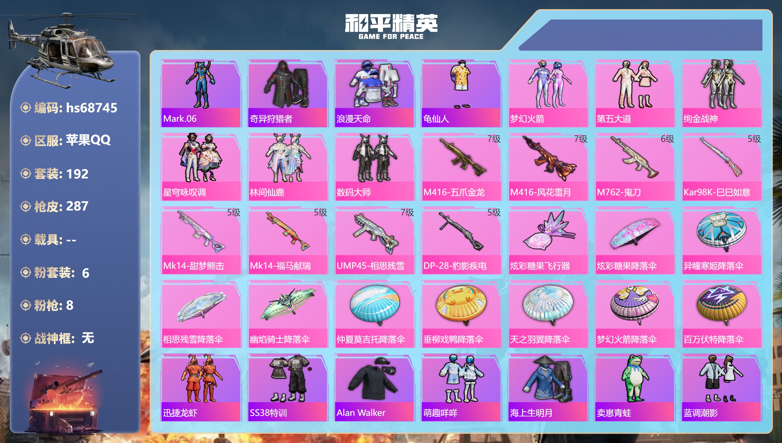 PX_2556506-,苹果手Q-15王牌印记-6粉装-8特效枪-78870热力值-192套装-287枪皮-2卓越印记-2传奇印记 【6粉装】套装-绚金战神,套装-林间仙鹿,套装-梦幻火箭,套装-第五大道,套装-数码大师,套装-星穹咏叹调 【8特效枪】DP-28-豹影疾电/5级,M416-风花雪月/7级,UMP45-相思残雪/7级,Mk14-甜梦熊击/5级,Mk14-福马献瑞/5级,Kar98K-巳巳如意/5级,M416-五爪金龙/7级,M762-鬼刀/6级 【4稀有紫装】Mark.06,奇异狩猎者,浪漫天命,龟仙人 【192稀有时装】梦幻火箭,第五大道,绚金战神,星穹咏叹调,林间仙鹿,数码大师,迅捷龙虾,SS38特训,浪漫天命,奇异狩猎者,龟仙人,Mark.06,Alan,Walker,萌趣咩咩,海上生明月,卖崽青蛙,蓝调潮影,都市丽猫,街头风暴,冰河战士,鱼渊荷华,青团波波,4AM战队服,燕燕于飞,海琴烟,风玲,战术大师,智谋强哥,雏菊兔兔,马上有钱,糖糖葫芦,香桃花海,巳巳如意,棉花软糖,雪绒豹,狂鲨锋刃,萌鸡速递,元气之梦,漫游都市,薄荷星砂,云朵鹅,顶瓜瓜,银尘,雪国风尚,恋语绒绒,SS35特训,SS29特训,萝兰蝴蝶,SS31特训,SS33特训,SS32特训,SS16特训,暴风机械师,时空追击者,SS36特训,焰鹰斗篷,暗夜傀儡,黑色刀锋,福星高照,虎虎生威吉莉,龙的传人,萌黄之夏,SS37特训,蝶吟花词,SS28特训,特训学院,猎鹰,青年教官,橘黑制服,红色运动,黄色运动,蓝色运动,黄色伏地魔,飞驰魅影,白色伏地魔,音速流光,热血青春,深海格斗者,酒红色名流,阳光火鸡,湖蓝色名流,黄色名流,绯格组合,SS26特训,迅猛虎鲸,薄荷蓝莓,野性山猫,沙漠雄狮,漫步者,空岛之星,热情海星,黑色伏地魔,炫蓝之夏,纯真浪花,SS34特训,骑行爱好者,竞技名士,蓝色守护者,深蓝色名流,猛禽,SS30特训,长空猛禽,旭日情侣,街头潮人,怒火燎原,惊鸿侠骨,魅力单车,春光漫游,甜心亚梦,虚音幻奏,极地朋克,幻世战舞者,青春校园,牛气满满,迎春赐吉,娇憨猪猪,冰川特警,潮流先锋,燃烧卡路里,幻影公爵,滨海假日,狙击之神,WiFi精灵,麻辣教官,鹰眼刺客,冰冻风暴,完美偶像,SS11特训,人气偶像,梦魇先生,青春冒险家,破蛋小黄鸡,潮流游乐家,特战英豪,快闪甜心,绮丽涂鸦,耀眼新星,竞技达人朋克,原初圣火,超能勇士,逆风勇士,海岛探路者,破晓战魂,幻世保卫者,森林游猎者,田园牧歌,萌趣颜团子,轻风白浪,探宝勇士,SS12特训,SS27特训,牛气冲天,SS18特训,治愈之星,银白舞王,科技之星,SS13特训,飞行日记,SS17特训,瑞龙福将,团圆交子,异彩先驱,霓虹极客,空投萌叽,SS19特训,光之冒险,SS20特训,SS21特训,绝对偶像,玉兔迎春,SS22特训,SS23特训,夏日倾情,缤纷果语,SS14特训,神气柴柴,妙红点点,幻彩翩翩,幻羽潜行,海盐绵绵冰,冷血极客,吉莉礼服,王牌教练,柠萌假日,微雨春柳,SS24特训,鹤鸣,懵萌河马,SS25特训,锦衣飞扬,星梦畅游,SS15特训 【288稀有枪械】M416-五爪金龙/7级,M416-风花雪月/7级,M762-鬼刀/6级,Kar98K-巳巳如意/5级,Mk14-甜梦熊击/5级,Mk14-福马献瑞/5级,UMP45-相思残雪/7级,DP-28-豹影疾电/5级,QBZ-纯真浪花,AWM-纯真浪花,汤姆逊-纯真浪花,DBS-乌木金纹,AA12-G-纯真浪花,平底锅-纯真浪花,SCAR-L-海盐豹豹,平底锅-精灵梦叶罗丽,GROZA-海盐豹豹,野牛-雏菊兔兔,平底锅-雏菊兔兔,M762-雏菊兔兔,Mini14-雏菊兔兔,Famas-突变脉冲,Vector-突变脉冲,R1895-雏菊兔兔,UZI-冰河战士,M16A4-冰河战士,MK20-H-乌木金纹,AKM-绿洲时空,Win94-乌木金纹,MK12-乌木金纹,蜜獾-乌木金纹,M762-云朵鹅,SVD-云朵鹅,SPAS-12-狂鲨锋刃,MK20-H-狂鲨锋刃,铝热弹-炫彩糖果,ARX-像素花束,大砍刀-像素花束,M249-冰晶雪宝,AKS-74U-乌木金纹,AKM-涂鸦街区,Famas-乌木金纹,Famas-霓彩脉冲,SPAS-12-云朵鹅,破片手榴弹-拽到爆炸,十字弩-异瞳寒姬,信号枪-异瞳寒姬,Mk14-薄荷星砂,沙漠之鹰-云朵鹅,MG-36-薄荷星砂,大砍刀-云朵鹅,PKM-啾咪啾咪,SVD-霓彩脉冲,SLR-霓彩脉冲,平底锅-属我最6,SCAR-L-彩虹符号,蜜獾-鸡智如我,S12K-霓彩脉冲,AKM-霓彩脉冲,M416-红色方程式,M416-神秘黑猫,M416-蓝色火焰,M416-夜灯,M416-糯团青竹,M416-绯红前夜,AKM-影袭,AKM-夜灯,AKM-生命誓言,AKM-彩虹符号,AKM-冰凉西瓜,AKM-破晓战魂,AKM-龙的传人,AKM-虎虎生威,AKM-萌趣颜团子,AKM-霓虹街区,SCAR-L-红色方程式,SCAR-L-玉兔迎春,SCAR-L-黄金龙骨,SCAR-L-夜灯,SCAR-L-炫彩节奏,M16A4-蓝色火焰,M16A4-幻世战舞者,M16A4-甜心亚梦,GROZA-春暖花开,GROZA-异彩先驱,GROZA-影袭,GROZA-田园牧歌,GROZA-懵萌河马,GROZA-治愈之星,AUG-耀粉歌者,AUG-青春冒险家,AUG-天降萌叽,QBZ-飞驰魅影,QBZ-潮汐统领,QBZ-原初圣火,QBZ-彩虹符号,M762-瑞龙福将,M762-镭射皇者,M762-诡娃娃,M762-彩虹符号,M762-牛气冲天,M762-彩虹甜喵,M762-天降萌叽,Mk47-百万伏特,Mk47-乌木金纹,Mk47-妙红点点,Mk47-青春冒险家,G36C-乌木金纹,G36C-懵萌河马,G36C-时空追击者,AC-VAL-天降萌叽,AC-VAL-快闪甜心,AC-VAL-甜心亚梦,AC-VAL-乌木金纹,蜜獾-天降萌叽,蜜獾-娇憨猪猪,Kar98K-乌木金纹,Kar98K-梦幻火箭,Kar98K-红色方程式,Kar98K-飞驰魅影,Kar98K-彩虹符号,Kar98K-炫彩节奏,M24-乌木金纹,M24-影袭,M24-香水柠檬,M24-治愈之星,M24-炫彩节奏,AWM-天降萌叽,AWM-乌木金纹,AWM-黄金龙骨,AWM-焰鹰斗篷,AWM-庄周梦蝶,Win94-瑞龙福将,莫辛纳甘-乌木金纹,莫辛纳甘-懵萌河马,AMR-乌木金纹,AMR-妙红点点,M200-惊鸿侠骨,SKS-天之羽翼,SKS-时空追击者,SKS-心之恋语,SKS-糯团青竹,VSS-田园牧歌,VSS-镭射皇者,Mini14-原初圣火,Mini14-耀粉歌者,Mini14-炫彩节奏,Mini14-异彩先驱,Mk14-治愈之星,Mk14-乌木金纹,SLR-彩虹符号,SLR-娇憨猪猪,SLR-四圣焕新,QBU-烈焰拳霸,QBU-青春冒险家,M417-惊鸿侠骨,MK20-H-快闪甜心,UZ