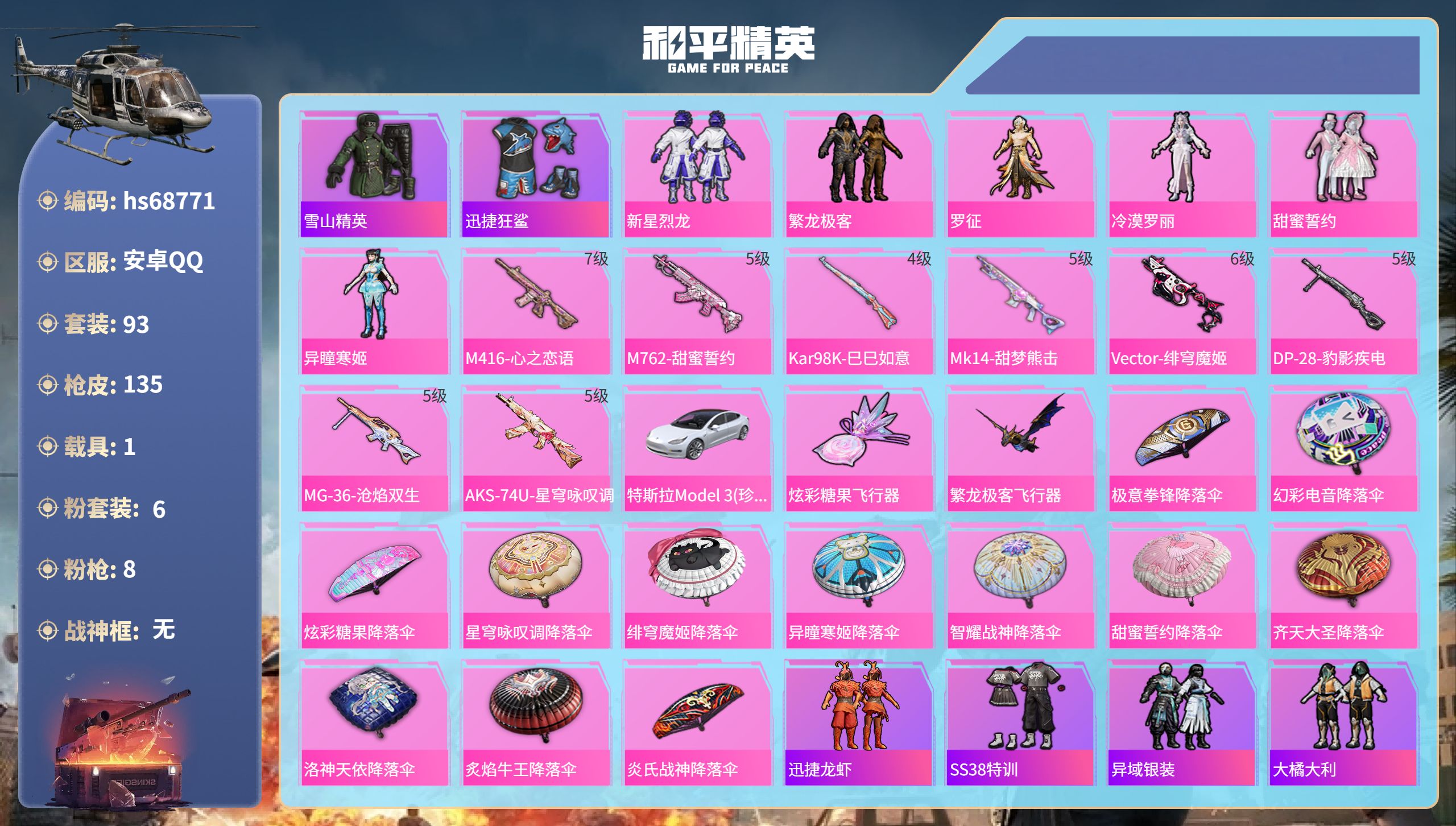 PX_2556497-,安卓手Q-4王牌印记-6粉装-8特效枪-1载具-44613热力值-93套装-135枪皮-2卓越印记-1传奇印记 【6粉装】套装-甜蜜誓约,角色-冷漠罗丽,套装-新星烈龙,套装-繁龙极客,角色-异瞳寒姬,角色-罗征 【8特效枪】Vector-绯穹魔姬/6级,AKS-74U-星穹咏叹调/5级,Kar98K-巳巳如意/4级,MG-36-沧焰双生/5级,M416-心之恋语/7级,DP-28-豹影疾电/5级,Mk14-甜梦熊击/5级,M762-甜蜜誓约/5级 【2稀有紫装】雪山精英,迅捷狂鲨 【1稀有载具】特斯拉Model,3(珍珠白) 【93稀有时装】新星烈龙,繁龙极客,罗征,冷漠罗丽,甜蜜誓约,异瞳寒姬,迅捷龙虾,SS38特训,雪山精英,迅捷狂鲨,异域银装,大橘大利,紫俏灵猫,猎影月神,粉恋花,月烬之祷,午间小调,彩虹兔,霓虹热舞,雪绒豹,朱霞炽焰,夜瞳黯灵,绛羽幽主,游乐,凌霄紫焰,擎苍青焰,炫彩糖果,绯色魅影,萌鸡速递,元气之梦,风迹短诗,漫游都市,薄荷星砂,秘语星愿,云朵鹅,顶瓜瓜,雪国风尚,蓝冰羽,青翼流星,紫幽梦,SS35特训,迷域探索者,机械英豪,机械征服者,SS31特训,SS33特训,SS32特训,SS36特训,暗夜契约,纯白誓言,SS8特训,萌黄之夏,SS37特训,红色运动,SS9特训,黑色伏地魔,SS34特训,骑行爱好者,竞技名士,蓝色守护者,猛禽,雨林探路者,SS30特训,长空猛禽,魅力单车,虚音幻奏,特殊使命,街舞达人,牛气满满,SS11特训,破蛋小黄鸡,暗金炫舞,绮丽涂鸦,耀眼新星,竞技达人朋克,幻世保卫者,SS10特训,耀粉歌者,SS12特训,SS13特训,飞行日记,SS17特训,光之冒险,弄潮海豚,甜蜜熊情侣,缤纷果语,SS14特训,天籁歌者,老实芭蕉,柠萌假日,鹤鸣,快乐星愿,SS15特训 【136稀有枪械】M416-心之恋语/7级,M762-甜蜜誓约/5级,Kar98K-巳巳如意/4级,Mk14-甜梦熊击/5级,Vector-绯穹魔姬/6级,DP-28-豹影疾电/5级,MG-36-沧焰双生/5级,AKS-74U-星穹咏叹调/5级,SCAR-L-海盐豹豹,DBS-风迹短诗,莫辛纳甘-风迹短诗,Win94-乌木金纹,MK12-风迹短诗,MK12-乌木金纹,PKM-紫幽梦,MG3-霓彩脉冲,DBS-幻彩电音,R45-幻彩电音,Mk14-紫幽梦,M24-幻彩电音,蜜獾-乌木金纹,M762-云朵鹅,S1897-紫幽梦,SVD-云朵鹅,P92-紫幽梦,蜜獾-绯穹魔姬,M249-绯穹魔姬,SPAS-12-狂鲨锋刃,M417-玩趣呆呆,MK20-H-狂鲨锋刃,AUG-冰晶雪宝,铝热弹-炫彩糖果,UZI-炫彩糖果,ARX-像素花束,UMP45-极意拳锋,Mini14-绯穹魔姬,G36C-星穹咏叹调,短管霰弹-星穹咏叹调,Kar98K-星穹咏叹调,Mk47-风迹短诗,JS9-凌霄紫焰,MG-36-凌霄紫焰,平底锅-紫幽梦,破片手榴弹-海盐豹豹,UMP45-海盐豹豹,ARX-凌霄紫焰,AKS-74U-乌木金纹,AKM-涂鸦街区,蜜獾-风迹短诗,P92-凌霄紫焰,Famas-乌木金纹,Famas-霓彩脉冲,SPAS-12-云朵鹅,破片手榴弹-拽到爆炸,十字弩-异瞳寒姬,S1897-糯团青竹,信号枪-异瞳寒姬,平底锅-凌霄紫焰,Mk14-薄荷星砂,AKS-74U-鸡智如我,沙漠之鹰-云朵鹅,烟雾弹-冰氧夏日,MG3-智耀战神,Mk14-紫晶流影,MG-36-薄荷星砂,大砍刀-云朵鹅,M24-天降萌叽,SLR-霓彩脉冲,平底锅-属我最6,SCAR-L-彩虹符号,蜜獾-鸡智如我,AUG-紫晶流影,S12K-霓彩脉冲,AMR-鸡智如我,AKM-霓彩脉冲,M416-乌木金纹,AKM-生命誓言,AKM-灼热熔岩,SCAR-L-玉兔迎春,SCAR-L-炫彩节奏,M16A4-机械英豪,M16A4-幻世战舞者,GROZA-乌木金纹,QBZ-乌木金纹,M762-牛气冲天,Mk47-洛神天依,G36C-乌木金纹,AC-VAL-天降萌叽,蜜獾-天降萌叽,Kar98K-彩虹符号,Kar98K-深海曼妙,Kar98K-勇闯险境,AWM-天降萌叽,AWM-乌木金纹,Win94-机械英豪,SKS-勇闯险境,SKS-炫彩节奏,VSS-乌木金纹,Mini14-炫彩节奏,UZI-炫彩节奏,UZI-啾咪啾咪,UMP45-生命誓言,Vector-生命誓言,Vector-彩虹符号,汤姆逊-乌木金纹,汤姆逊-勇闯险境,野牛-机械英豪,S686-生命誓言,S1897-乌木金纹,S1897-勇闯险境,S12K-破晓战魂,S12K-玩趣呆呆,S12K-机械英豪,DBS-彩虹符号,M249-彩虹符号,M249-糯团青竹,M249-乌木金纹,DP-28-乌木金纹,DP-28-甜心亚梦,MG3-幻世战舞者,平底锅-机械英豪,平底锅-勇闯险境,平底锅-飞行日记,平底锅-甜心亚梦,MG3-火熔核心,ACE32-冰晶雪宝,AUG-异域银装,M200-乌木金纹,十字弩-异域银装,SCAR-L-星途旅人,SPAS-12-乌木金纹,SLR-乌木金纹,P90-紫矿核心,GROZA-紫矿核心,VSS-香桃花海,MG3-火熔核心 【5稀有飞行器】鸡智如我飞行器,炫彩糖果飞行器,破刃行动尾迹,繁龙极客飞行器,异域银装飞行器 【25稀有背包】神秘黑猫背包(3级),绯穹魔姬背包(3级),星穹咏叹调背包(3级),炫彩糖果背包(3级),异瞳寒姬背包(3级),凌霄紫焰背包(3级),智耀战神背包(3级),紫幽梦背包(3级),萌鸡速递背包(3级),薄荷星砂背包(3级),风迹短诗背包(3级),巳巳如意背包(3级),云朵鹅背包(3级),破晓战魂背包(3级),异域银装背包(3级),雪国风尚背包(3级),香桃花海背包(3级),炎氏战神背包(3级),SS11赛季背包(3级),甜蜜誓约背包(3级),深海小丑鱼背包(3级),SS10赛季背包(3级),SS8赛季背包(3级),机械英豪背包(3级),SS9赛季背包(3级) 【35稀有降落伞】SS35王牌降落伞,极意拳锋降落伞,幻彩电音降落伞,SS32王牌降落伞,属我最6降落伞,炫彩糖果降落伞,狂鲨锋刃降落伞,星穹咏叹调降落伞,绯穹魔姬降落伞,紫幽梦降落伞,SS34王牌降落伞,异瞳寒姬降落伞,凌霄紫焰降落伞,SS33王牌降落伞,竞逐热浪降落伞,风迹短诗降落伞,智耀战神降落伞,云朵鹅降落伞,一举夺葵降落伞,紫菱降落伞,钢铁雄心降落伞,普通降落伞,化学天才降落伞,白昼之火降落伞,甜蜜誓约降落伞,异域银装降落伞,海域冒险降落伞,寂夜之火降落伞,齐天大圣降落伞,洛神天依降落伞,炙焰牛王降落伞,香桃花海降落伞,机械英豪降落伞,炎氏战神降落伞,蓝海之火降落伞 【19稀有头盔】雪国风尚头盔(3级),幻彩电音头盔(3级)