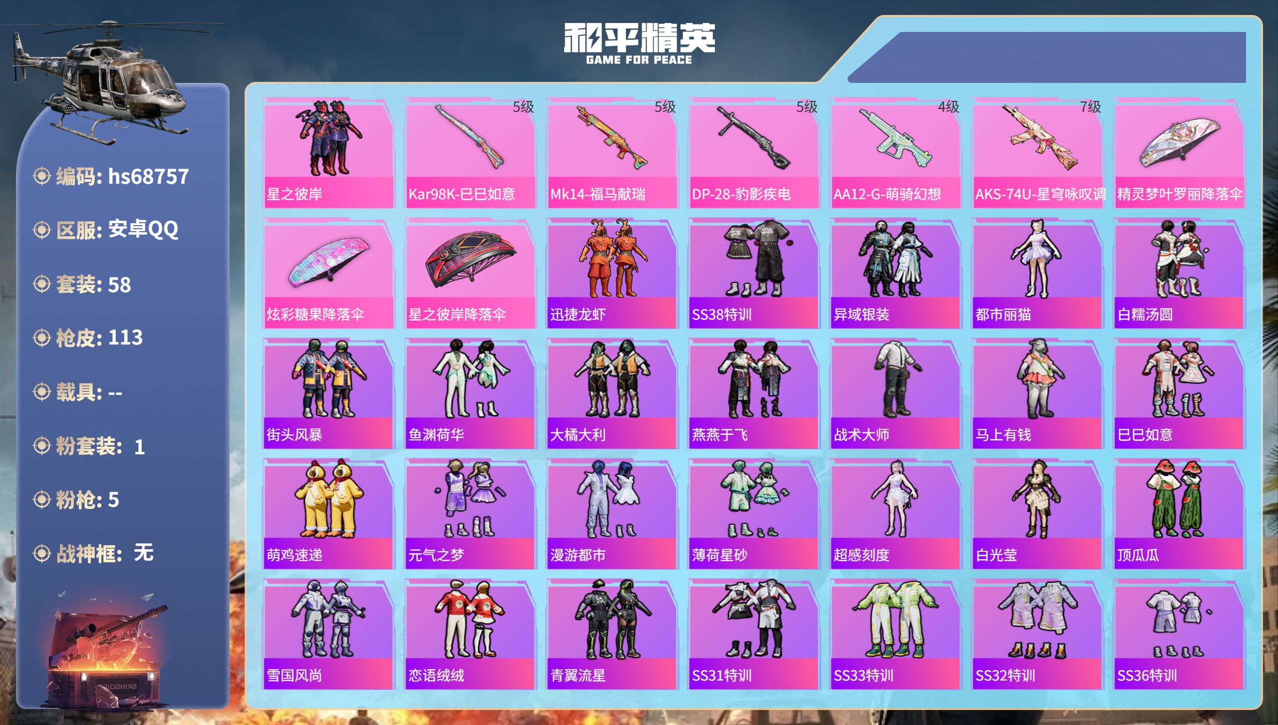 PX_2556512-,安卓手Q-0王牌印记-1粉装-5特效枪-25364热力值-58套装-113枪皮 【1粉装】套装-星之彼岸 【5特效枪】AA12-G-萌骑幻想/4级,Kar98K-巳巳如意/5级,AKS-74U-星穹咏叹调/7级,DP-28-豹影疾电/5级,Mk14-福马献瑞/5级 【58稀有时装】星之彼岸,迅捷龙虾,SS38特训,异域银装,都市丽猫,白糯汤圆,街头风暴,鱼渊荷华,大橘大利,燕燕于飞,战术大师,马上有钱,巳巳如意,萌鸡速递,元气之梦,漫游都市,薄荷星砂,超感刻度,白光莹,顶瓜瓜,雪国风尚,恋语绒绒,青翼流星,SS31特训,SS33特训,SS32特训,SS36特训,焰鹰斗篷,龙的传人,SS37特训,猎鹰,黄色运动,阳光火鸡,湖蓝色名流,黄色名流,顽皮玉兔,绯格组合,漫步者,黑色伏地魔,竞技名士,魅力单车,幻世战舞者,冰川特警,狙击之神,红釉青花,雨过天青,福马献瑞,玲珑侠影,完美偶像,暗金炫舞,海岛探路者,霓虹街区,SS27特训,缤纷果语,幻羽潜行,柠萌假日,快乐星愿,星梦畅游 【114稀有枪械】Kar98K-巳巳如意/5级,Mk14-福马献瑞/5级,DP-28-豹影疾电/5级,AA12-G-萌骑幻想/4级,AKS-74U-星穹咏叹调/7级,蜜獾-精灵梦叶罗丽,S1897-精灵梦叶罗丽,SCAR-L-海盐豹豹,Win94-乌木金纹,MK12-乌木金纹,蜜獾-乌木金纹,M249-绯穹魔姬,SPAS-12-狂鲨锋刃,MK20-H-狂鲨锋刃,铝热弹-炫彩糖果,ARX-像素花束,大砍刀-像素花束,短管霰弹-星穹咏叹调,破片手榴弹-海盐豹豹,UMP45-海盐豹豹,AKS-74U-乌木金纹,电击枪-喜羊羊与灰太狼,爆炸猎弓-喜羊羊与灰太狼,Famas-乌木金纹,Famas-霓彩脉冲,破片手榴弹-拽到爆炸,十字弩-异瞳寒姬,S1897-糯团青竹,Mk14-薄荷星砂,AKS-74U-鸡智如我,烟雾弹-冰氧夏日,MG-36-薄荷星砂,PKM-啾咪啾咪,SVD-霓彩脉冲,SLR-霓彩脉冲,平底锅-属我最6,蜜獾-鸡智如我,AUG-紫晶流影,AMR-鸡智如我,AKM-霓彩脉冲,M416-红色方程式,M416-蓝色火焰,M416-糯团青竹,AKM-星之彼岸,AKM-龙的传人,SCAR-L-红色方程式,SCAR-L-夜灯,M16A4-幻世战舞者,AUG-耀粉歌者,AUG-甜蜜菠萝,QBZ-彩虹符号,M762-天降萌叽,Kar98K-彩虹符号,AWM-焰鹰斗篷,AMR-乌木金纹,SKS-炫彩节奏,VSS-星之彼岸,VSS-彩虹符号,Mini14-耀粉歌者,Mini14-穿刺龙虾,UZI-天降萌叽,UZI-啾咪啾咪,UMP45-蓝色火焰,UMP45-夜灯,Vector-焰鹰斗篷,汤姆逊-天降萌叽,MP5K-乌木金纹,P90-乌木金纹,P90-玩趣呆呆,S686-红色方程式,S12K-破晓战魂,S12K-夜灯,DBS-焰鹰斗篷,M249-糯团青竹,M249-星之彼岸,DP-28-焰鹰斗篷,DP-28-彩虹符号,MG3-幻世战舞者,平底锅-空岛之星,平底锅-焰鹰斗篷,破片手榴弹-呆爆全场,撬棍-冰晶雪宝,DBS-绿洲时空,MG3-火熔核心,ACE32-冰晶雪宝,AUG-异域银装,野牛-燕燕于飞,M200-乌木金纹,SPAS-12-燕燕于飞,蝎式手枪-燕燕于飞,十字弩-异域银装,SCAR-L-星途旅人,大砍刀-鬼刀,S686-巳巳如意,SPAS-12-乌木金纹,Vector-燕燕于飞,十字弩-燕燕于飞,M16A4-雨过天青,GROZA-福马献瑞,蜜獾-启元战纹,AMR-雨过天青,SLR-乌木金纹,AA12-G-雨过天青,PKM-雨过天青,沙漠之鹰-雨过天青,燃烧瓶-福马献瑞,P90-紫矿核心,GROZA-紫矿核心,VSS-香桃花海,汤姆逊-像素花束,P90-巳巳如意,破片手榴弹-巳巳如意,DBS-绿洲时空,MG3-火熔核心 【3稀有飞行器】狂鲨锋刃飞行器,马上有福飞行器,异域银装飞行器 【16稀有背包】极意拳锋背包(3级),狂鲨锋刃背包(3级),炫彩糖果背包(3级),萌鸡速递背包(3级),薄荷星砂背包(3级),巳巳如意背包(3级),繁龙极客背包(3级),焰鹰斗篷背包(3级),异域银装背包(3级),雪国风尚背包(3级),星之彼岸背包(3级),燕燕于飞背包(3级),福马献瑞背包(3级),智谋强哥背包(3级),香桃花海背包(3级),精灵梦叶罗丽背包(3级) 【18稀有降落伞】精灵梦叶罗丽降落伞,炫彩糖果降落伞,狂鲨锋刃降落伞,雨过天青降落伞,福马献瑞降落伞,一举夺葵降落伞,焰鹰斗篷降落伞,空岛之星降落伞,巳巳如意降落伞,绚烂橙彩降落伞,普通降落伞,化学天才降落伞,云上灯宵降落伞,闻鸡启五降落伞,异域银装降落伞,燕燕于飞降落伞,香桃花海降落伞,星之彼岸降落伞 【14稀有头盔】精灵梦叶罗丽头盔(3级),雪国风尚头盔(3级),狂鲨锋刃头盔(3级),星穹咏叹调头盔(3级),萌鸡速递头盔(3级),星之彼岸头盔(3级),巳巳如意头盔(3级),龙的传人头盔(3级),异域银装头盔(3级),荒原烈焰头盔(3级),齐天大圣头盔(3级),福马献瑞头盔(3级),香桃花海头盔(3级),圣堂之誓头盔(3级)
