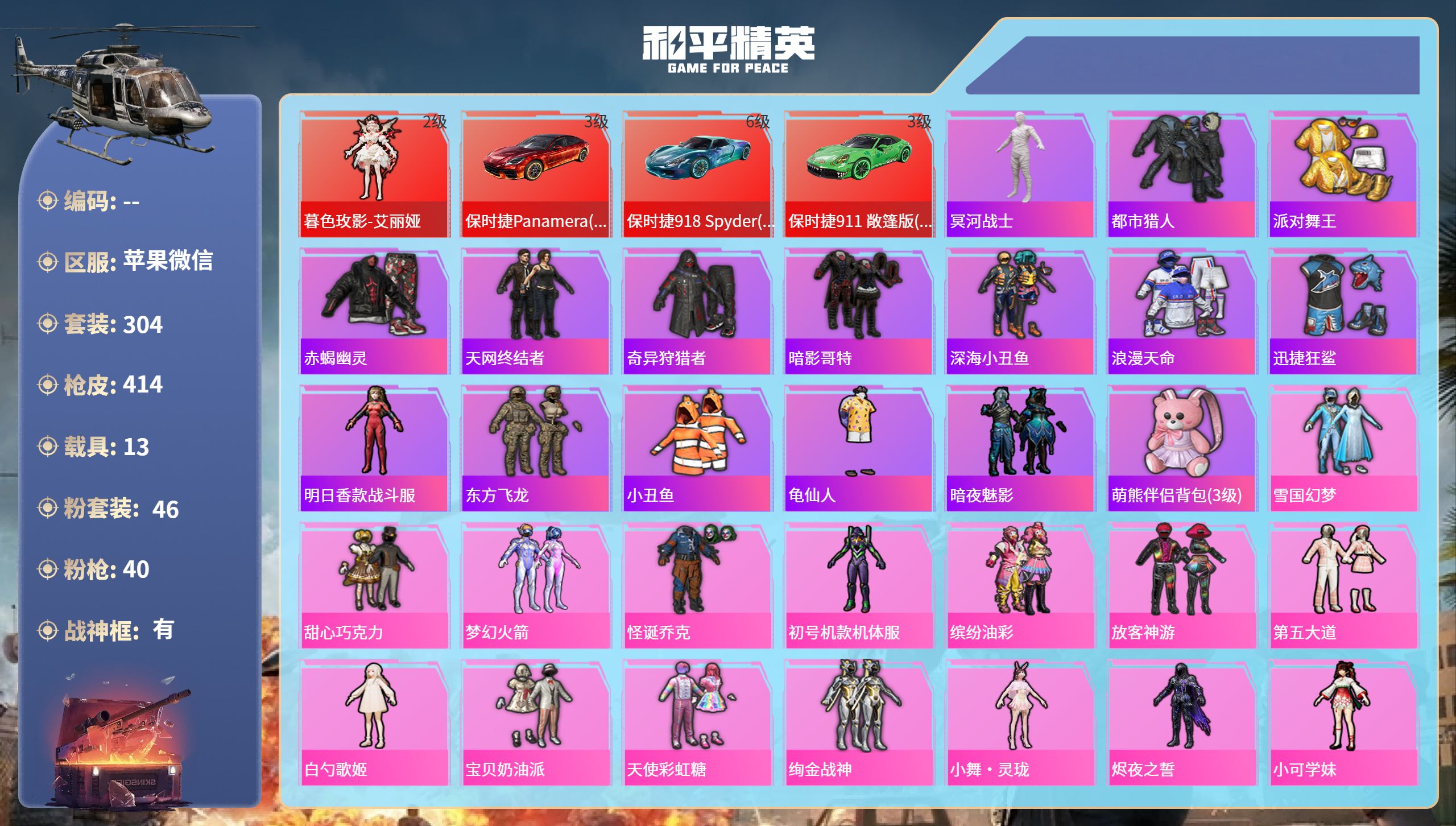 PX_2548902-苹果微信-19王牌印记-有战神框-1红装-46粉装-40特效枪-13载具-热力值-304套装-414枪皮-7卓越印记-2传奇印记 【1红装】暮色玫影-艾丽娅/2级 【46粉装】角色-初号机款机体服,角色-猩猩队长,套装-林间仙鹿,套装-甜心巧克力,角色-小可学妹,套装-苍蓝魅影,角色-白勺歌姬,套装-天星战神,角色-异瞳寒姬,套装-莲影清波,套装-缤纷油彩,套装-第五大道,套装-快乐主宰,套装-雪梅暗香,套装-雪国幻梦,套装-天使彩虹糖,角色-震天雷神,角色-千金淑猫,套装-天禅智恒,套装-音爆索尼克,角色-复仇流浪者,套装-未来领航者,超级赛亚人-孙悟空,套装-暗夜玫瑰,角色-烬夜之誓,套装-飒粉甜心,套装-怪诞乔克,套装-绮梦青鸾,角色-狂花道·不知火舞,套装-未来歌姬,套装-冰霜白皇,套装-放客神游,套装-星空之魅,套装-梦幻火箭,套装-彩虹鹿灵,套装-绚金战神,角色-绝对恒星,套装-馨动时刻,套装-光之祷告,套装-青空秋雨,人物-小舞·灵珑,套装-宝贝奶油派,角色-呆萌星弥,套装-炙焰红王,套装-璀璨巨星,角色-罪夜之冕 【40特效枪】M416-心之恋语/1级,AWM-璀璨巨星/5级,Mk14-福马献瑞/5级,AUG-许七安/7级,DP-28-豹影疾电/5级,Vector-最终圣卫者/3级,MG3-梦幻舞会/5级,GROZA-无垠阁/3级,AUG-南国舞曲/1级,Kar98K-巳巳如意/5级,AKS-74U-森灵之息/5级,AKM-梦之光华/1级,汤姆逊-怪笑疯兔/2级,AKM-暮色玫影/9级,Kar98K-伏魔团/1级,M416-五爪金龙/1级,AKS-74U-无垠阁/3级,GROZA-镜光银凌/5级,平底锅-林间仙鹿/4级,平底锅-仲夏莫吉托/1级,ACE32-萌骑漫游/4级,Vector-环太平洋/1级,M249-绝对恒星/2级,ARX-无垠阁/5级,Kar98K-未来歌姬/1级,SCAR-L-机甲封神/1级,M417-第五大道/4级,M416-灵猫魔法师/3级,SCAR-L-金蛇镇世/9级,爆炸猎弓-雪梅暗香/4级,Kar98K-圣域龙灵/3级,Famas-天象三御/3级,M338-回旋牧梦使/4级,M762-激战未来/4级,AMR-鸢尾晶梦/5级,SPAS-12-音爆索尼克/1级,UMP45-萌骑冒险/2级,PKM-天星战神/4级,DP-28-暗夜鎏金/4级,SCAR-L-梦幻火箭/1级 【16稀有紫装】冥河战士,都市猎人,派对舞王,赤蝎幽灵,天网终结者,奇异狩猎者,暗影哥特,深海小丑鱼,浪漫天命,迅捷狂鲨,明日香款战斗服,东方飞龙,小丑鱼,龟仙人,暗夜魅影,萌熊伴侣背包(3级) 【13稀有载具】保时捷Panamera(炽焰橙)/3级,保时捷918,Spyder(玺耀绿)/6级,保时捷911,敞篷版(小暴龙)/3级,玛莎拉蒂Ghibli(金),特斯拉Roadster(水滴蓝),保时捷Cayenne(激情红),保时捷Taycan,旅行版(冰晶蓝),冰辰御座(神秘蓝),Formula,E,Gen2(幽光蓝),暮色幽蹄,黑曜夜骑,布尔玛摩托车,鬼马风驰 【1僚机】僚机-萌兔起飞 【301稀有时装】艾丽娅/2级,雪国幻梦,甜心巧克力,梦幻火箭,怪诞乔克,初号机款机体服,缤纷油彩,放客神游,第五大道,白勺歌姬,宝贝奶油派,天使彩虹糖,绚金战神,小舞·灵珑,烬夜之誓,小可学妹,千金淑猫,馨动时刻,彩虹鹿灵,绝对恒星,暗夜玫瑰,罪夜之冕,飒粉甜心,狂花道·不知火舞,复仇流浪者,天星战神,猩猩队长,未来领航者,璀璨巨星,天禅智恒,莲影清波,星空之魅,异瞳寒姬,冰霜白皇,炙焰红王,林间仙鹿,青空秋雨,快乐主宰,苍蓝魅影,孙悟空,未来歌姬,绮梦青鸾,贝吉塔,音爆索尼克,震天雷神,雪梅暗香,呆萌星弥,迅捷龙虾,SS38特训,都市猎人,浪漫天命,奇异狩猎者,龟仙人,暗影哥特,深海小丑鱼,小丑鱼,东方飞龙,迅捷狂鲨,明日香款战斗服,赤蝎幽灵,冥河战士,派对舞王,天网终结者,兔兔白日梦,银碳小老虎,理性主义,萌趣咩咩,红熊茄茄,海上生明月,阿虎,异域银装,都市丽猫,云端星象师,街头风暴,星途旅人,糖霜甜心,缠丝流银,霜纹水星,鎏光妙舞,鱼渊荷华,杯旋调茶师,青团波波,STE战队服,大橘大利,燕燕于飞,NV战队服,战术大师,紫俏灵猫,马上有钱,糖糖葫芦,晶辉守护,香桃花海,巳巳如意,薰款战斗服,午间小调,银色战姬,琴音绮想,玄霖雨神,紫霄电母,画境星梦,狂鲨锋刃,阳光菠萝,绛羽幽主,粉黛兰香,炫彩糖果,绯色魅影,萌鸡速递,书海巡游,风迹短诗,甜心蒙太奇,秘语星愿,超感刻度,雪国风尚,恋语绒绒,青翼流星,暗夜魅影,SS35特训,机械征服者,SS29特训,SS31特训,SS33特训,皇家花园,SS32特训,SS16特训,华灯初上,暴风机械师,时空追击者,SS36特训,贝斯之夜,焰鹰斗篷,红酒骑士,英勇保护者,月光变奏,闪耀新星,梦幻玩咖,彩虹嘻嘻猴,黑色刀锋,源星混沌,极乐追光,福星高照,都市漫游者,虎虎生威吉莉,夏日音浪,龙的传人,军刀雅典娜,潮流炫酷,甜梦熊熊,春野茶蘼,青芒树下,白熊同盟,青玉碎影,萌黄之夏,SS37特训,超能拳王,海洋之心,音速流光,热血青春,会说话的汤姆猫,冰川格斗者,酷潮明星,绯格组合,涂山之恋,SS26特训,漫步者,黎明保卫者,元气发射,SS34特训,骑行爱好者,竞技名士,蓝色守护者,赤地牡丹,雨林探路者,SS30特训,长空猛禽,特战装甲,旭日情侣,甜蜜告白,街头潮人,冥星暗影,冷焰舞者,惊鸿侠骨,魅力单车,灼焰舞者,春光漫游,甜心亚梦,虚音幻奏,浪漫假日,极地朋克,幻世战舞者,青涩时光,牛气满满,娇憨猪猪,春日漫步,龙腾端午,燃烧卡路里,滨海假日,狙击之神,红釉青花,麻辣教官,鹰眼刺客,雨过天青,沙暴袭击者,福马献瑞,冰冻风暴,玲珑侠影,幽夜迷踪,青春冒险家,破蛋小黄鸡,潮流游乐家,青龙圣者,快闪甜心,白虎圣者,神秘领域,绮丽涂鸦,骁骑迪迦,耀眼新星,野性战心,原初圣火,超能勇士,逆风勇士,海岛探路者,初火先锋,和煦暖阳,霓虹街区,田园牧歌,萌趣颜团子,轻风白浪,特种颜团子,闪金天王,奈斯,镭射皇者,探宝勇士,SS12特训,SS27特训,牛气冲天,迅捷之星,SS18特训,治
