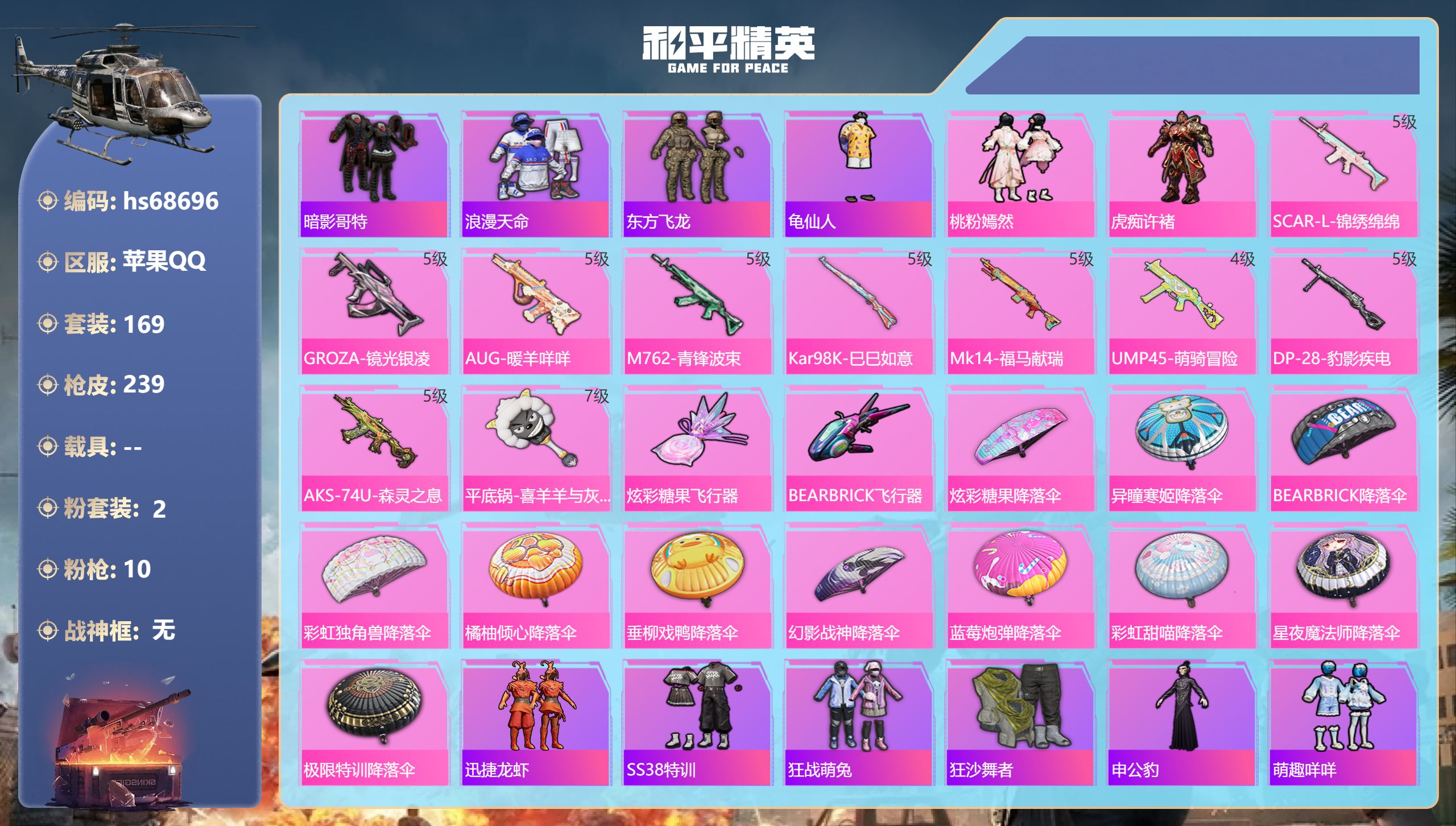 PX_2556525-,苹果手Q-15王牌印记-2粉装-10特效枪-66581热力值-169套装-239枪皮 【2粉装】套装-桃粉嫣然,角色-虎痴许褚 【10特效枪】M762-青锋波束/5级,GROZA-镜光银凌/5级,平底锅-喜羊羊与灰太狼/7级,AUG-暖羊咩咩/5级,AKS-74U-森灵之息/5级,Mk14-福马献瑞/5级,Kar98K-巳巳如意/5级,SCAR-L-锦绣绵绵/5级,UMP45-萌骑冒险/4级,DP-28-豹影疾电/5级 【4稀有紫装】暗影哥特,浪漫天命,东方飞龙,龟仙人 【169稀有时装】桃粉嫣然,虎痴许褚,迅捷龙虾,SS38特训,浪漫天命,龟仙人,暗影哥特,东方飞龙,狂战萌兔,狂沙舞者,申公豹,萌趣咩咩,龙魂突击队,阿虎,白糯汤圆,街头风暴,星途旅人,糖霜甜心,冰河战士,鱼渊荷华,TT战队服,燕燕于飞,战术大师,智谋强哥,雏菊兔兔,香桃花海,蝶变,巳巳如意,元素星魂,琴音绮想,画境星梦,朱霞炽焰,狂鲨锋刃,凌霄紫焰,粉黛兰香,擎苍青焰,炫彩糖果,萌鸡速递,元气之梦,薄荷星砂,恋语绒绒,青翼流星,马上来财,SS35特训,SS29特训,萝兰蝴蝶,SS31特训,SS33特训,SS32特训,SS16特训,SS36特训,暗夜傀儡,醒狮腾龙,雪兔飞飞,都市漫游者,夏日音浪,龙的传人,军刀雅典娜,潮流炫酷,白熊同盟,青玉碎影,萌黄之夏,SS37特训,SS28特训,特训学院,猎鹰,青年教官,黄色运动,蓝色运动,飞驰魅影,白色伏地魔,音速流光,阳光火鸡,湖蓝色名流,黄色名流,绯格组合,SS26特训,空岛之星,黑色伏地魔,黎明保卫者,炫蓝之夏,SS34特训,骑行爱好者,雪鹰学院,竞技名士,蓝色守护者,深蓝色名流,猛禽,SS30特训,长空猛禽,旭日情侣,街头潮人,惊鸿侠骨,魅力单车,春光漫游,甜心亚梦,虚音幻奏,极地朋克,幻世战舞者,甜蜜菠萝,青涩时光,牛气满满,娇憨猪猪,春日漫步,冰川特警,龙腾端午,幻影公爵,滨海假日,狙击之神,红釉青花,麻辣教官,雨过天青,福马献瑞,冰冻风暴,幻影武者,破蛋小黄鸡,潮流游乐家,特战英豪,快闪甜心,梦幻奶油,绮丽涂鸦,野性战心,超能勇士,海岛探路者,幻世保卫者,霓虹街区,森林游猎者,田园牧歌,萌趣颜团子,轻风白浪,沙漠兵团,耀粉歌者,探宝勇士,SS27特训,牛气冲天,SS18特训,清新柠檬,飞行日记,SS17特训,瑞龙福将,团圆交子,缤纷焰火,异彩先驱,霓虹极客,空投萌叽,SS19特训,光之冒险,SS20特训,血色贵族,SS21特训,玉兔迎春,深海梦境,SS22特训,SS23特训,呆萌铁蟹,夏日倾情,甜蜜熊情侣,缤纷果语,忍者信条,格斗先锋,吉莉礼服,王牌教练,荣耀,暗夜之虎,柠萌假日,SS24特训,鹤鸣,SS25特训,锦衣飞扬 【240稀有枪械】SCAR-L-锦绣绵绵/5级,GROZA-镜光银凌/5级,AUG-暖羊咩咩/5级,M762-青锋波束/5级,Kar98K-巳巳如意/5级,Mk14-福马献瑞/5级,UMP45-萌骑冒险/4级,DP-28-豹影疾电/5级,AKS-74U-森灵之息/5级,平底锅-喜羊羊与灰太狼/7级,DBS-乌木金纹,野牛-雏菊兔兔,平底锅-雏菊兔兔,M762-雏菊兔兔,Mini14-雏菊兔兔,R1895-雏菊兔兔,UZI-冰河战士,M16A4-冰河战士,MK20-H-乌木金纹,Mini14-鸡智如我,AKM-绿洲时空,Win94-乌木金纹,MK12-乌木金纹,撬棍-冷漠罗丽,MG3-霓彩脉冲,ACE32-画境星梦,M1加兰德-画境星梦,MP5K-画境星梦,蜜獾-乌木金纹,AWM-绿洲时空,MK20-H-狂鲨锋刃,铝热弹-炫彩糖果,UZI-炫彩糖果,ARX-像素花束,大砍刀-像素花束,AA12-G-画境星梦,平底锅-画境星梦,短管霰弹-星穹咏叹调,M249-冰晶雪宝,Kar98K-星穹咏叹调,JS9-凌霄紫焰,MG-36-凌霄紫焰,ARX-凌霄紫焰,AKS-74U-乌木金纹,AKM-涂鸦街区,P92-凌霄紫焰,Famas-乌木金纹,Famas-霓彩脉冲,破片手榴弹-拽到爆炸,平底锅-凌霄紫焰,Mk14-薄荷星砂,MG-36-薄荷星砂,PKM-啾咪啾咪,M24-天降萌叽,SVD-霓彩脉冲,SLR-霓彩脉冲,平底锅-属我最6,SCAR-L-彩虹符号,AUG-紫晶流影,S12K-霓彩脉冲,M416-魔童闹海,敖闰,AKM-霓彩脉冲,AKM-砺玉逐花,M416-红色方程式,M416-蓝色火焰,M416-糯团青竹,AKM-王牌投手,AKM-彩虹符号,AKM-破晓战魂,AKM-龙的传人,AKM-灼热熔岩,AKM-虎虎生威,AKM-萌趣颜团子,AKM-霓虹街区,SCAR-L-红色方程式,SCAR-L-玉兔迎春,SCAR-L-龙宫之主,SCAR-L-未来战士,SCAR-L-夜灯,SCAR-L-炫彩节奏,M16A4-幻世战舞者,M16A4-甜心亚梦,GROZA-异彩先驱,GROZA-影袭,GROZA-田园牧歌,GROZA-彩虹符号,AUG-幻影战神,AUG-耀粉歌者,AUG-2P战斗服款,AUG-天降萌叽,QBZ-飞驰魅影,QBZ-彩虹符号,M762-瑞龙福将,M762-彩虹符号,M762-天降萌叽,Mk47-乌木金纹,G36C-乌木金纹,AC-VAL-天降萌叽,AC-VAL-快闪甜心,AC-VAL-甜心亚梦,AC-VAL-乌木金纹,蜜獾-天降萌叽,蜜獾-垂柳戏鸭,蜜獾-娇憨猪猪,Kar98K-乌木金纹,Kar98K-王子的夏天,Kar98K-飞驰魅影,Kar98K-炫彩节奏,M24-乌木金纹,M24-未来战士,M24-炫彩节奏,AWM-黄金龙骨,AWM-雷霆特警,Win94-瑞龙福将,Win94-星兔领航员,莫辛纳甘-乌木金纹,莫辛纳甘-炙焰牛王,AMR-暗夜行者,AMR-乌木金纹,M200-惊鸿侠骨,SKS-金玉无双,SKS-青丘仙客,SKS-夜幕颂歌,SKS-糯团青竹,SKS-未来歌姬,SKS-炫彩节奏,VSS-田园牧歌,VSS-彩虹符号,Mini14-金玉无双,Mini14-耀粉歌者,Mini14-炫彩节奏,Mini14-异彩先驱,Mk14-乌木金纹,SLR-娇憨猪猪,M417-惊鸿侠骨,MK20-H-快闪甜心,UZI-炫彩节奏,UZI-红色方程式,UZI-幻影战神,UZI-金玉无双,UZI-娇憨猪猪,UZI-天降萌叽,UZI-啾咪啾咪,UMP45-生命誓言,UMP45-夜灯,UMP45-猪猪侠,Vector-生命誓言,Vector-金玉无双,Vector-田园牧歌,汤姆逊-天降萌叽,汤姆逊-幻影战神,汤姆逊-异彩先驱,汤姆逊-炫彩节奏,汤姆逊-环太平洋,野牛-乌木金纹,野牛-夜灯,MP5K-异彩先驱,P90-乌木金纹,P90-快闪甜心,P90-飞驰魅影,S686-奇异狩猎者,S686-生命誓言,S1897-神秘黑猫,S1897-乌木金纹,S1897-炫彩节奏,S1897-飞驰魅影,S1897-暗夜鎏金,S12K-玩趣呆呆,S12K-幻世战舞者,S12K-幻影战神,S12K-瑞龙福将,S12K-娇