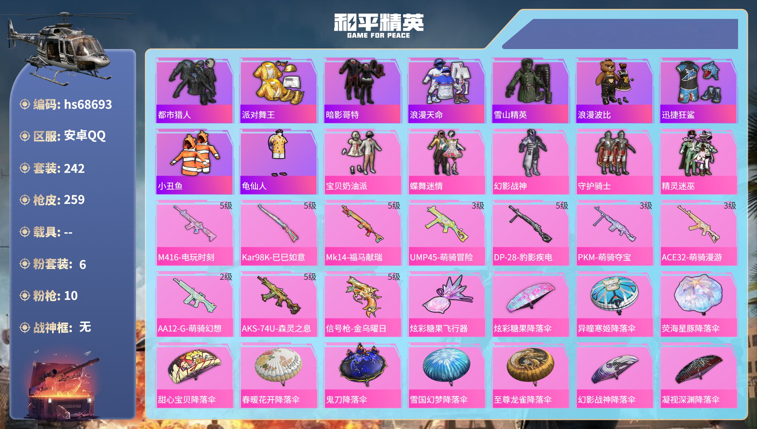 PX_2559681-,安卓手Q-16王牌印记-有战神框-1红装-5粉装-12特效枪-2载具-89562热力值-188套装-261枪皮-9卓越印记-4传奇印记 【1红装】暮色玫影-艾丽娅/5级 【5粉装】角色-樱桃泡泡,套装-极限特训,角色-烟云彩露,角色-千金淑猫,套装-梦幻火箭 【12特效枪】DP-28-豹影疾电/5级,Kar98K-巳巳如意/5级,M416-电玩时刻/1级,UMP45-萌骑冒险/1级,P90-金丰海韵/5级,SCAR-L-梦幻火箭/5级,Mk14-福马献瑞/5级,AUG-暖羊咩咩/5级,M416-心之恋语/1级,M416-灵猫魔法师/6级,Kar98K-圣域龙灵/1级,AUG-星梦奇缘/8级 【10稀有紫装】都市猎人,Mark.06,派对舞王,暗影哥特,浪漫天命,迅捷狂鲨,胖达团团,小丑鱼,怀庆长公主,临安公主 【2稀有载具】星梦玉骢,冰绡玉鳞 【188稀有时装】艾丽娅/5级,梦幻火箭,极限特训,千金淑猫,樱桃泡泡,烟云彩露,都市猎人,胖达团团,浪漫天命,Mark.06,暗影哥特,小丑鱼,迅捷狂鲨,派对舞王,狂战萌兔,狂沙舞者,粉雾星云,萌趣咩咩,龙魂突击队,卖崽青蛙,小熊娃娃,异域银装,摩登魅猫,街头风暴,星途旅人,蜜桃派对,冰河战士,鱼渊荷华,青团波波,大橘大利,燕燕于飞,临安公主,战术大师,智谋强哥,怀庆长公主,雏菊兔兔,馥郁金蕊,糖糖葫芦,香桃花海,蝶变,猎影月神,巳巳如意,粉恋花,粉日山川,湖畔霞光,曼妙人鱼,棉花软糖,元素星魂,午间小调,琴音绮想,雪绒豹,画境星梦,朱霞炽焰,狂鲨锋刃,游乐,凌霄紫焰,擎苍青焰,绯色魅影,萌鸡速递,元气之梦,书海巡游,风迹短诗,蜜露汐语,漫游都市,薄荷星砂,云朵鹅,顶瓜瓜,银尘,蓝冰羽,恋语绒绒,孙斩天,紫幽梦,马上来财,SS35特训,SS29特训,萝兰蝴蝶,SS31特训,SS33特训,SS32特训,无暇誓言,SS36特训,贝斯之夜,焰鹰斗篷,龙的传人,果汁能量,白熊同盟,青玉碎影,SS37特训,SS28特训,猎鹰,红色运动,黄色运动,蓝色运动,黄色伏地魔,白色伏地魔,冰川格斗者,酒红色名流,湖蓝色名流,黄色名流,顽皮玉兔,绯格组合,涂山之恋,SS26特训,空岛之星,热情海星,黑色伏地魔,黎明保卫者,纯真浪花,SS34特训,竞技名士,深蓝色名流,猛禽,SS30特训,长空猛禽,六六大吉,街头潮人,冷焰舞者,惊鸿侠骨,魅力单车,灼焰舞者,春光漫游,水银刺客,极地朋克,幻世战舞者,战地督导,青涩时光,娇憨猪猪,春日漫步,冰川特警,龙腾端午,燃烧卡路里,极速红龙,狙击之神,沙漠毒蛇,生化防暴队,红釉青花,麻辣教官,鹰眼刺客,雨过天青,福马献瑞,冰冻风暴,完美偶像,人气偶像,幽夜迷踪,幻影武者,破蛋小黄鸡,摇滚战魂,日照花林,疯狂小兔子,快闪甜心,蓝彩潮人,绮丽涂鸦,耀眼新星,坚韧舞者,竞技达人朋克,超能勇士,海岛探路者,核芯基因,霓虹街区,森林游猎者,田园牧歌,轻风白浪,沙漠兵团,耀粉歌者,无烬之地,SS27特训,竞技角斗士,光之冒险,SS21特训,玉兔迎春,弄潮海豚,SS22特训,SS23特训,呆萌铁蟹,夏日倾情,缤纷果语,滨海厨神,天籁歌者,幻羽潜行,海盐绵绵冰,老实芭蕉,旷野奇兵,王牌教练,荣耀,柠萌假日,SS24特训,SS25特训,锦衣飞扬 【262稀有枪械】AUG-星梦奇缘/8级,M416-灵猫魔法师/6级,Kar98K-圣域龙灵/1级,M416-心之恋语/1级,M416-电玩时刻/1级,SCAR-L-梦幻火箭/5级,AUG-暖羊咩咩/5级,Kar98K-巳巳如意/5级,Mk14-福马献瑞/5级,UMP45-萌骑冒险/1级,P90-金丰海韵/5级,DP-28-豹影疾电/5级,QBZ-纯真浪花,AWM-纯真浪花,汤姆逊-纯真浪花,DBS-乌木金纹,AA12-G-纯真浪花,平底锅-纯真浪花,QBZ-萌萌彩虹球,汤姆逊-星梦奇缘,蜜獾-精灵梦叶罗丽,S1897-精灵梦叶罗丽,MK20-H-星梦奇缘,SCAR-L-海盐豹豹,平底锅-精灵梦叶罗丽,GROZA-海盐豹豹,SLR-金丰海韵,SLR-极冰使者,野牛-雏菊兔兔,蝎式手枪-金丰海韵,Mk14-冰河战士,SPAS-12-行星泡泡,平底锅-雏菊兔兔,M762-雏菊兔兔,Mini14-雏菊兔兔,R1895-雏菊兔兔,M249-金丰海韵,UZI-冰河战士,M16A4-冰河战士,MK20-H-乌木金纹,MK20-H-圣域龙灵,DBS-风迹短诗,莫辛纳甘-风迹短诗,Mini14-鸡智如我,AKM-绿洲时空,Win94-乌木金纹,MK12-风迹短诗,MK12-乌木金纹,烟雾弹-冰澜龙吟,AKM-灵猫魔法师,PKM-紫幽梦,汤姆逊-灵猫魔法师,MG3-桃粉嫣然,撬棍-灵猫魔法师,MG3-霓彩脉冲,ACE32-画境星梦,M1加兰德-画境星梦,MP5K-画境星梦,Mk14-紫幽梦,蜜獾-乌木金纹,M762-云朵鹅,S1897-紫幽梦,SVD-云朵鹅,P92-紫幽梦,SPAS-12-狂鲨锋刃,M417-玩趣呆呆,MK20-H-狂鲨锋刃,UZI-炫彩糖果,AA12-G-画境星梦,平底锅-画境星梦,Mk47-风迹短诗,JS9-凌霄紫焰,MG-36-凌霄紫焰,平底锅-紫幽梦,燃烧瓶-甜梦桃焰,破片手榴弹-海盐豹豹,UMP45-海盐豹豹,ARX-凌霄紫焰,AKS-74U-乌木金纹,AKM-涂鸦街区,蜜獾-风迹短诗,爆炸猎弓-喜羊羊与灰太狼,P92-凌霄紫焰,Famas-乌木金纹,Famas-霓彩脉冲,SPAS-12-云朵鹅,破片手榴弹-拽到爆炸,S1897-糯团青竹,平底锅-凌霄紫焰,Mk14-薄荷星砂,AKS-74U-鸡智如我,汤姆逊-智耀战神,S12K-智耀战神,沙漠之鹰-云朵鹅,烟雾弹-冰氧夏日,MG-36-薄荷星砂,大砍刀-云朵鹅,PKM-啾咪啾咪,M24-天降萌叽,撬棍-双重狂想,SVD-霓彩脉冲,蜜獾-绿洲时空,燃点复合弓-火尖莲影,AUG-紫晶流影,SKS-圣域龙灵,M416-红色方程式,M416-蓝色火焰,M416-糯团青竹,AKM-彩虹符号,AKM-缤纷海域,AKM-龙的传人,AKM-霓虹街区,SCAR-L-玉兔迎春,SCAR-L-未来战士,SCAR-L-致命红樱,SCAR-L-夜灯,SCAR-L-炫彩节奏,SCAR-L-是爱神辣,M16A4-红色方程式,GROZA-影袭,GROZA-田园牧歌,AUG-耀粉歌者,AUG-甜蜜菠萝,AUG-天降萌叽,QBZ-彩虹符号,M762-彩虹符号,M762-天降萌叽,Mk47-乌木金纹,Mk47-炫光之旅,AC-VAL-天降萌叽,AC-VAL-快闪甜心,AC-VAL-乌木金纹,蜜獾-天降萌叽,蜜獾-垂柳戏鸭,蜜獾-娇憨猪猪,Kar98K-梦幻火箭,Kar98K-彩虹符号,Kar98K-影袭,Ka